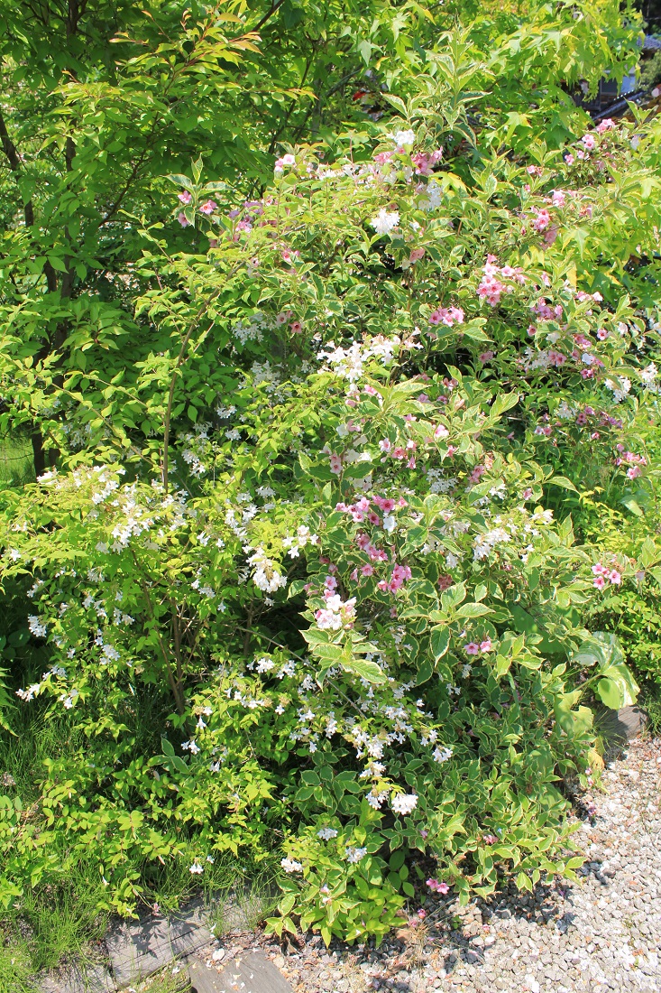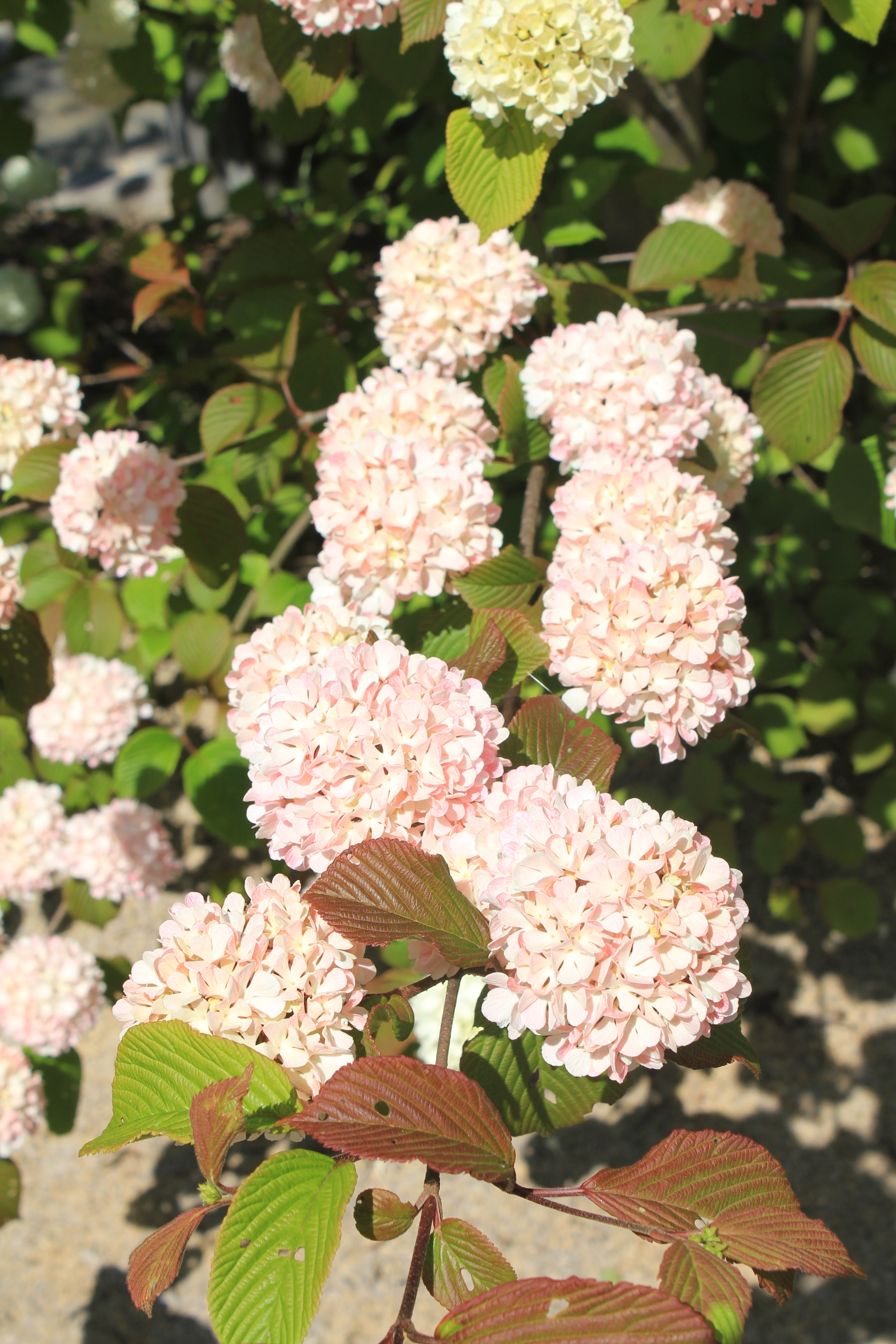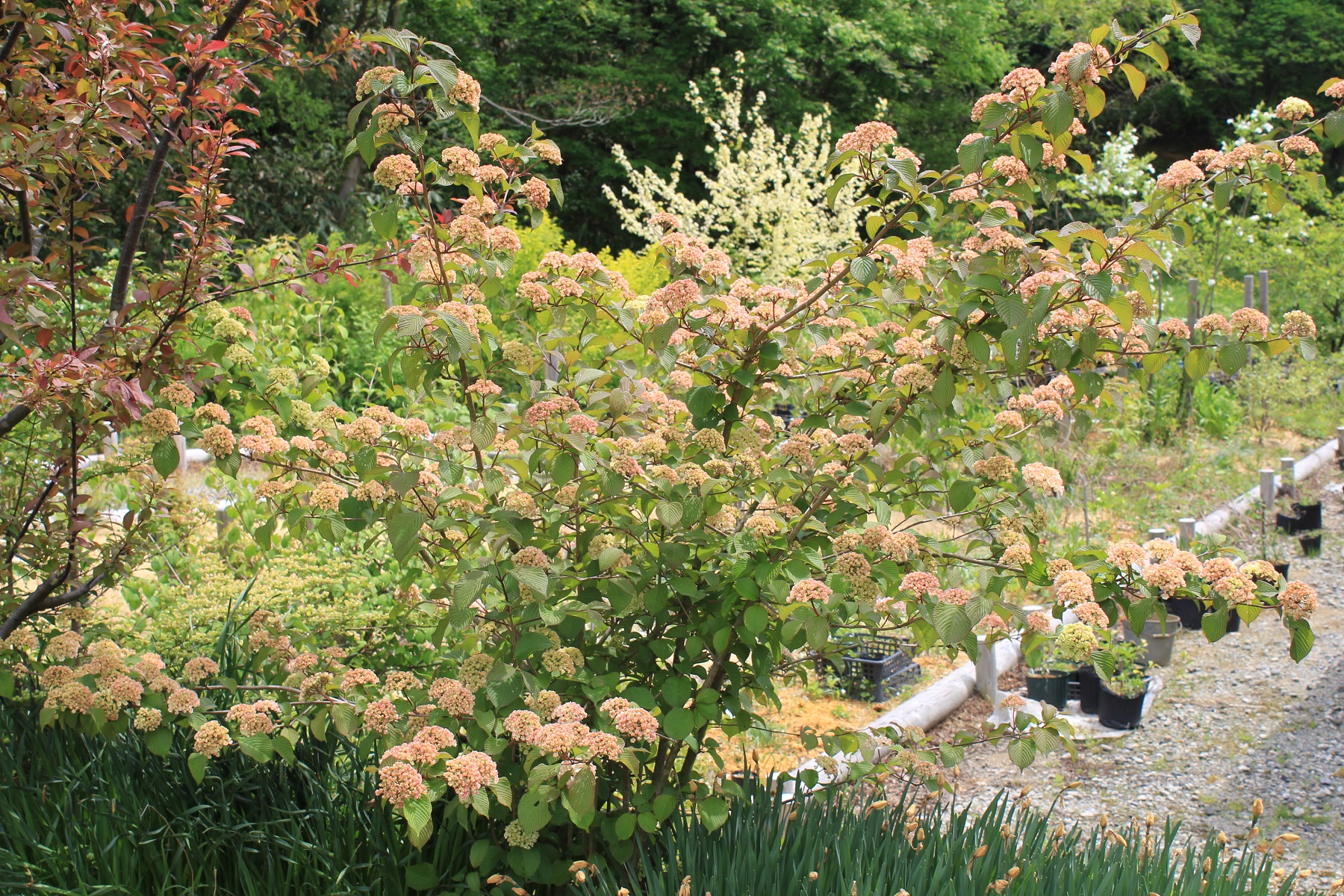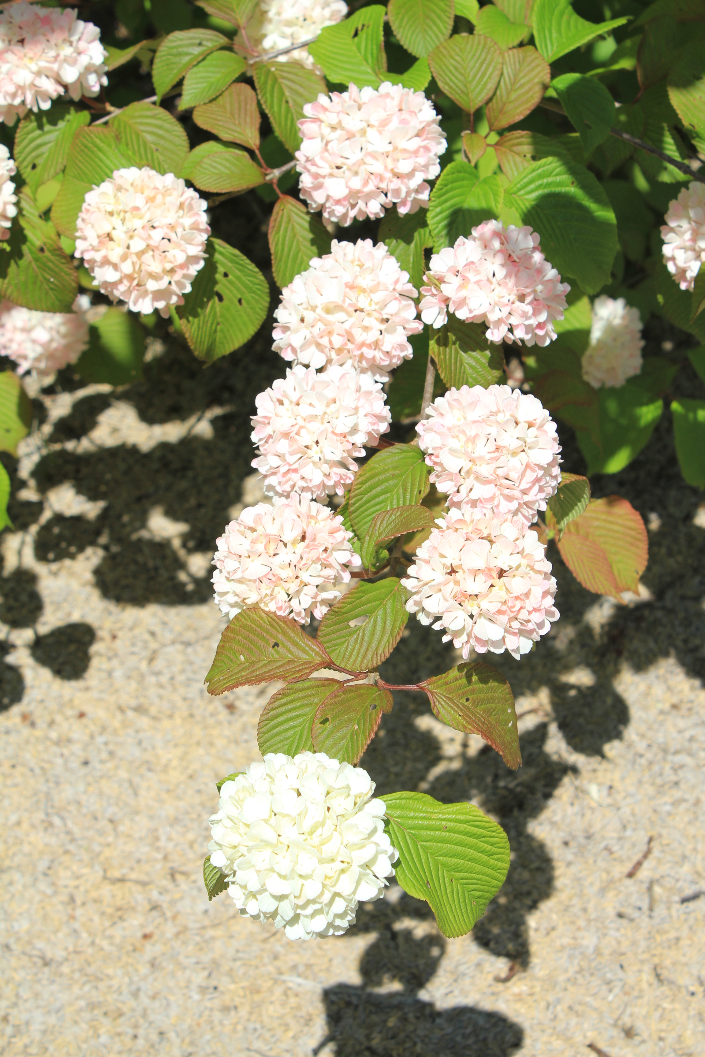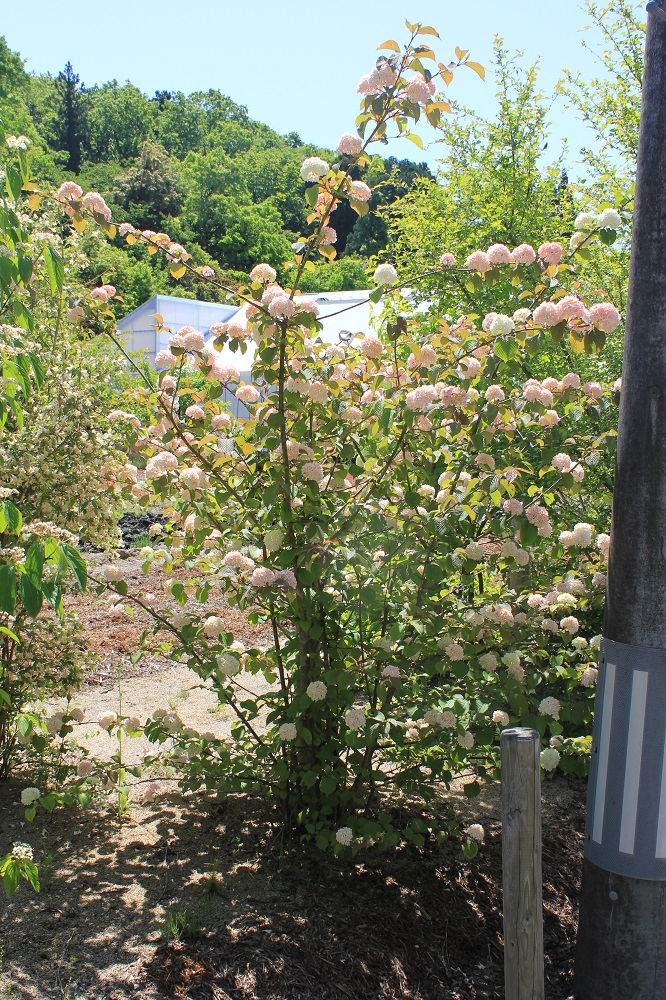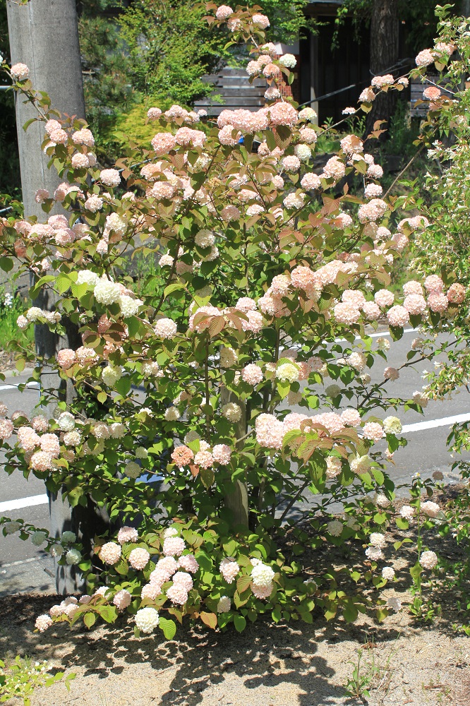 概要:ヤブデマリの花がすべて装飾花になった園芸品種。5~6月頃、ピンクと白の咲分けとなる手まり状の花をつける。2色の花もある。性質は丈夫で、庭園樹としての利用が多い。