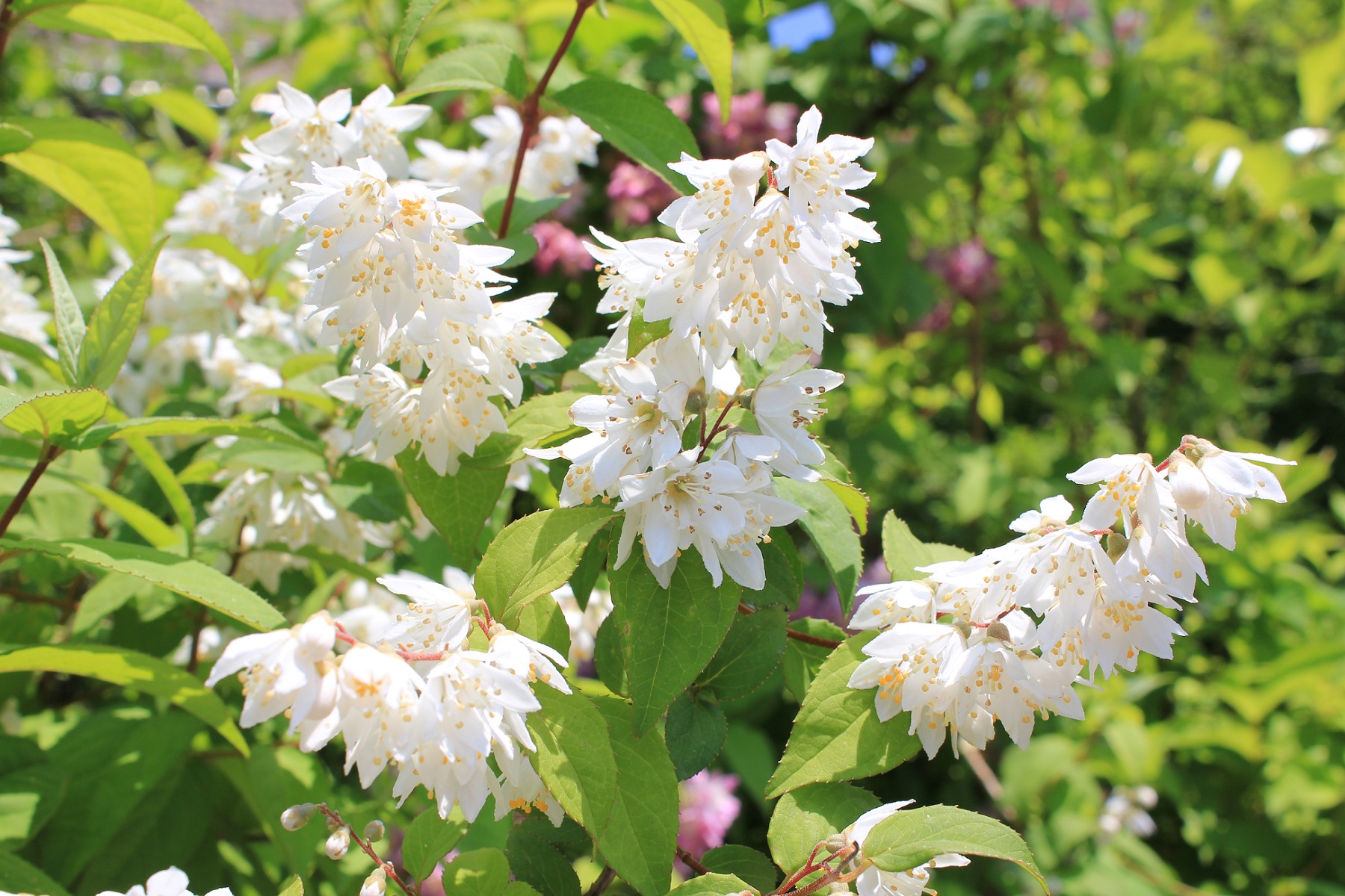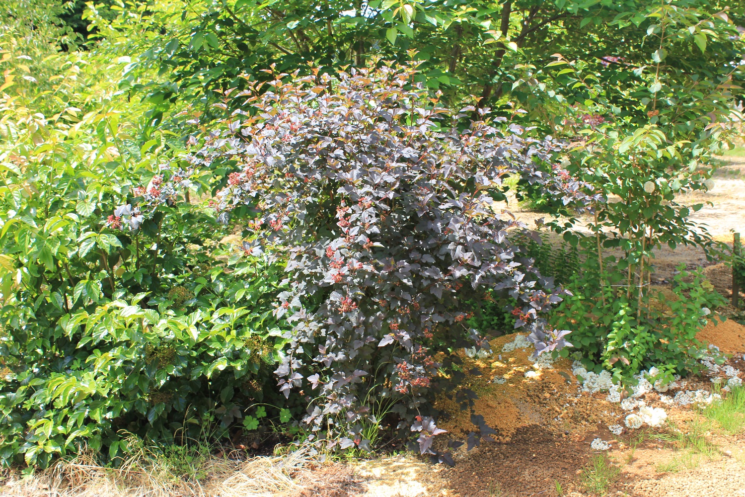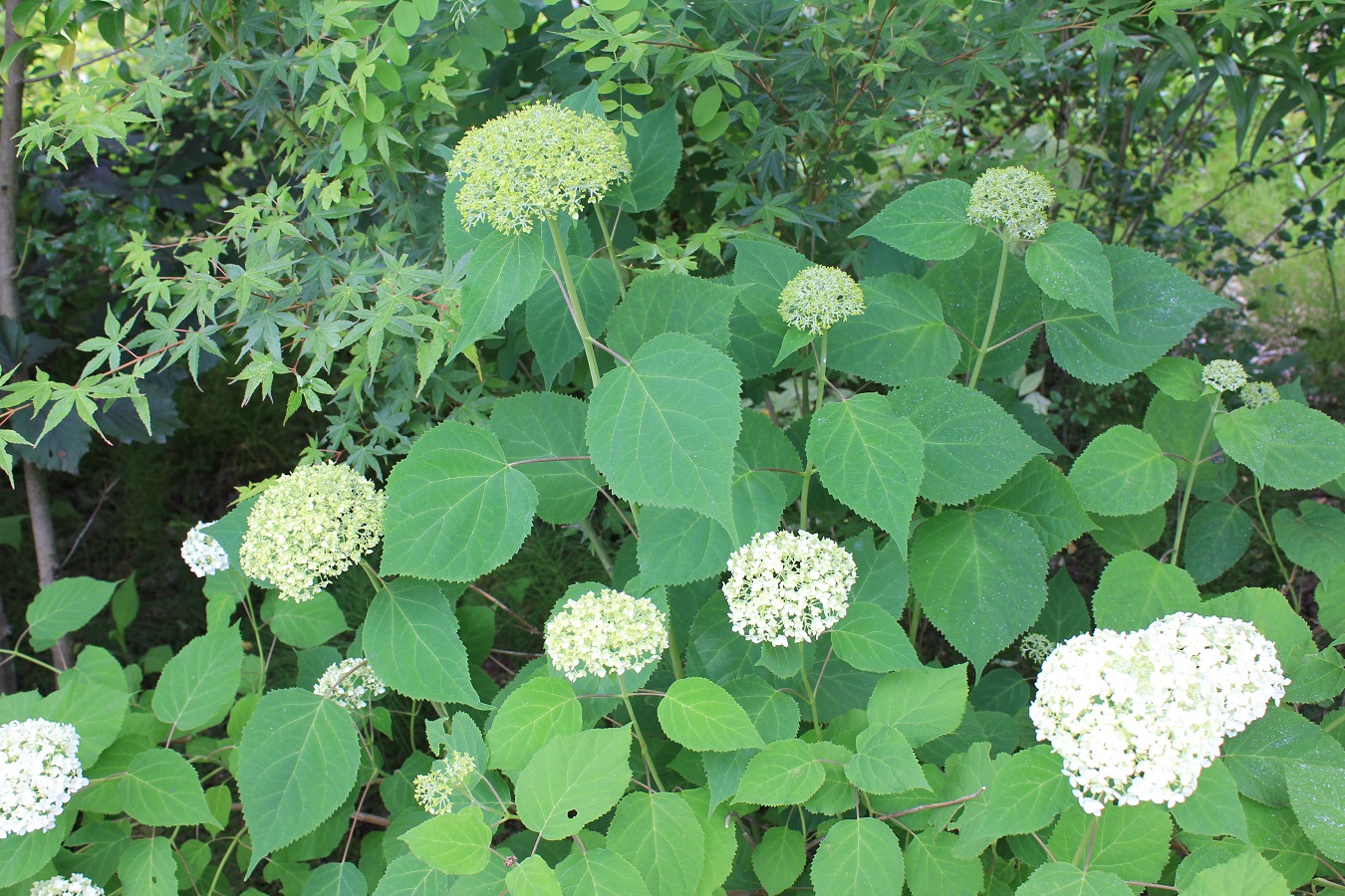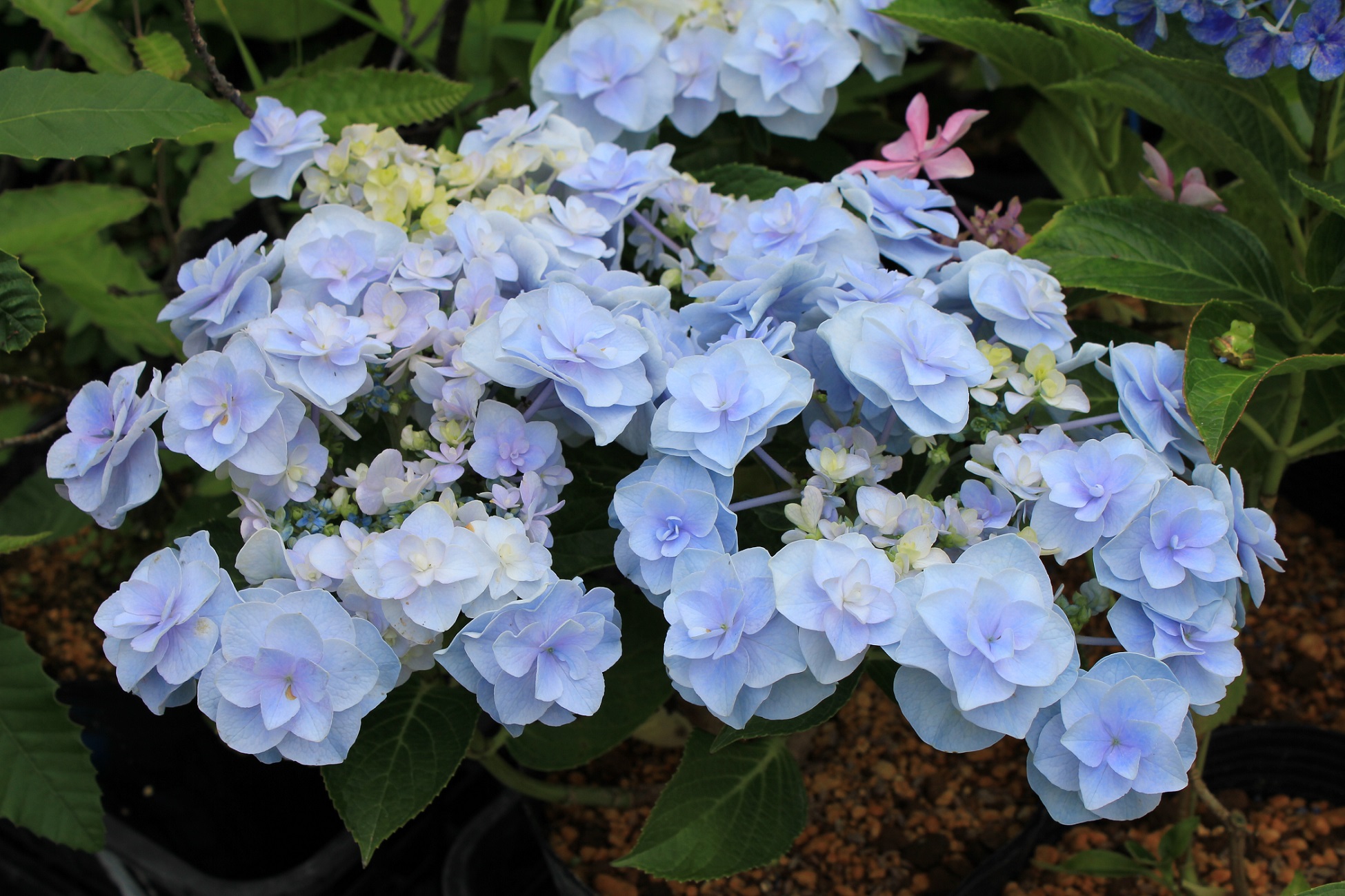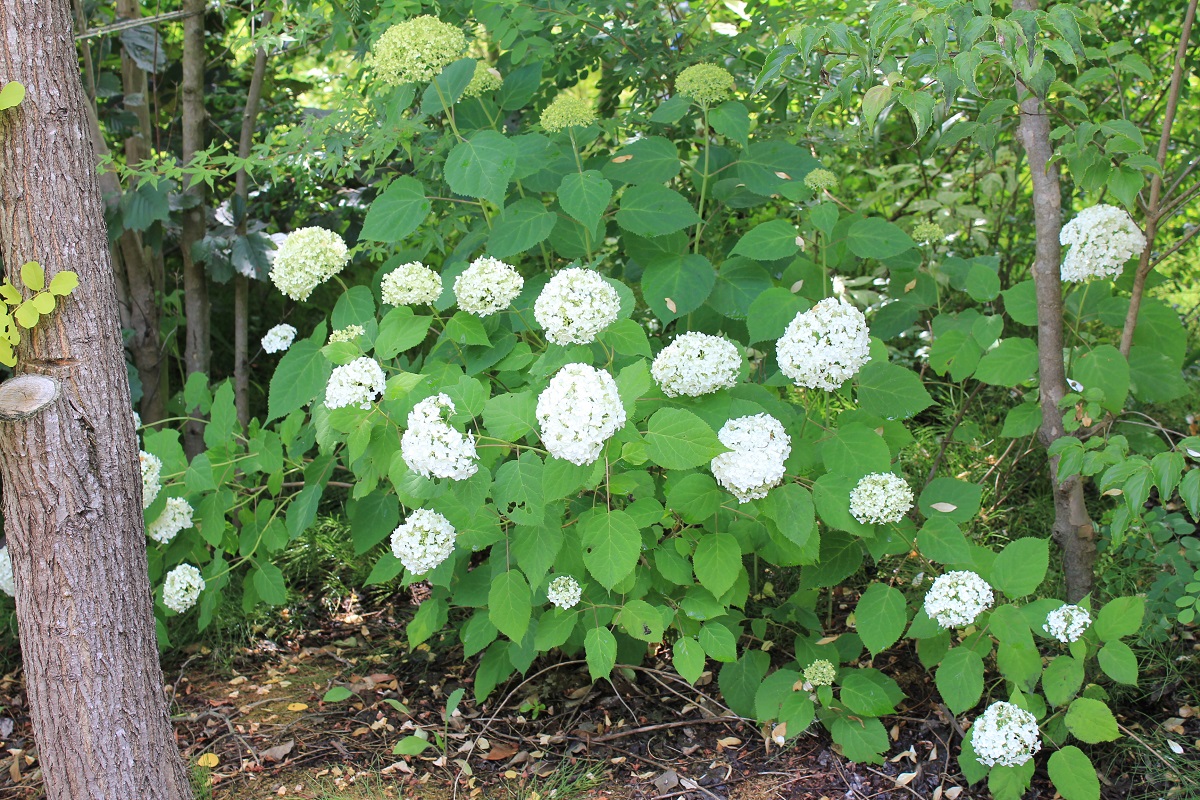 概要:ヤブデマリの花がすべて装飾花になった園芸品種。5~6月頃、ピンクと白の咲分けとなる手まり状の花をつける。2色の花もある。性質は丈夫で、庭園樹としての利用が多い。