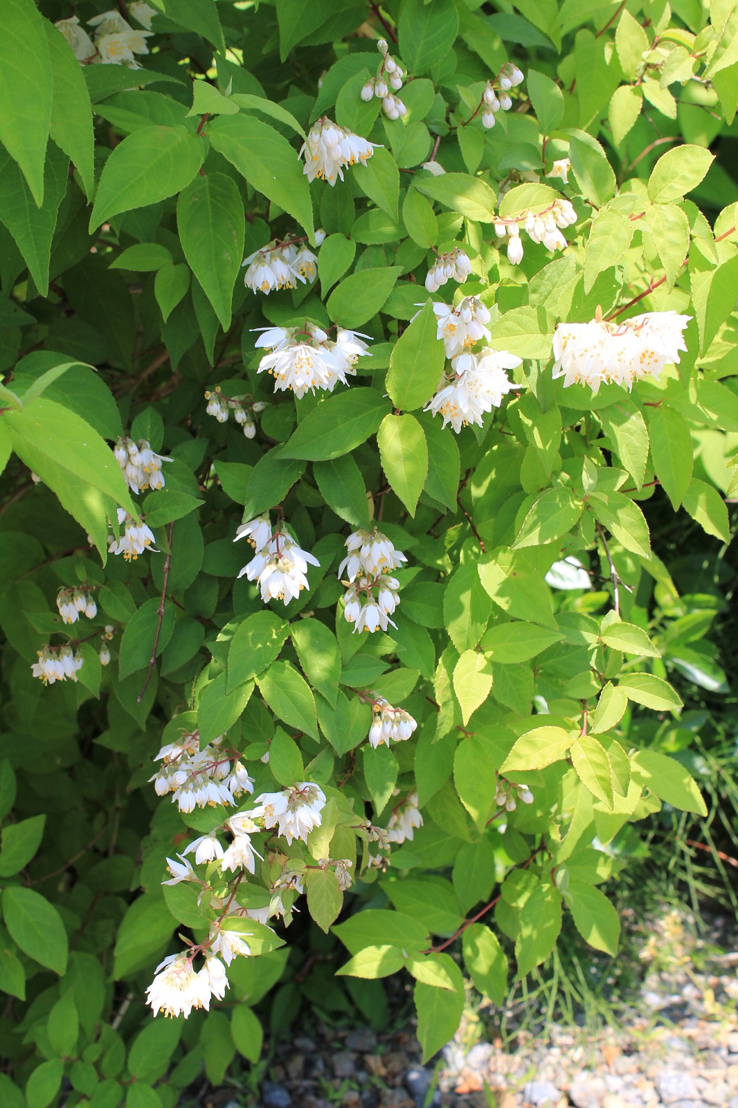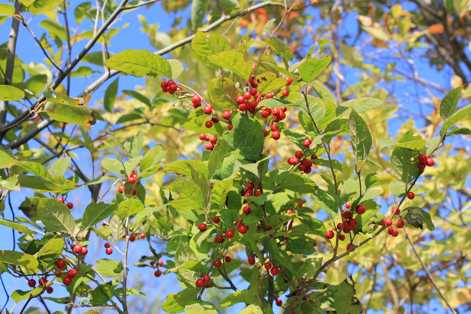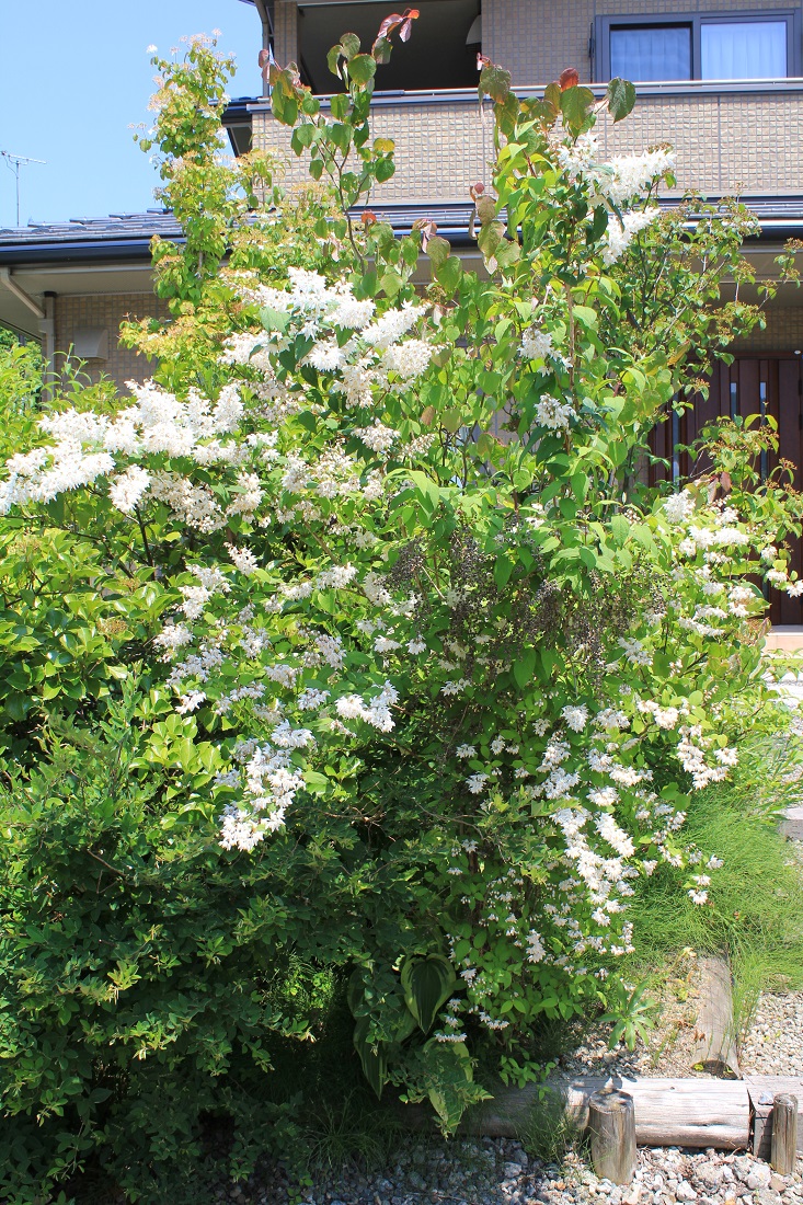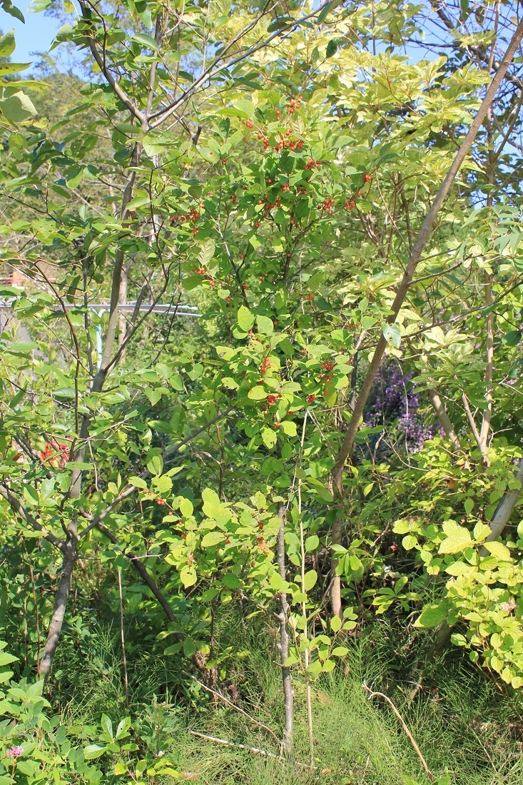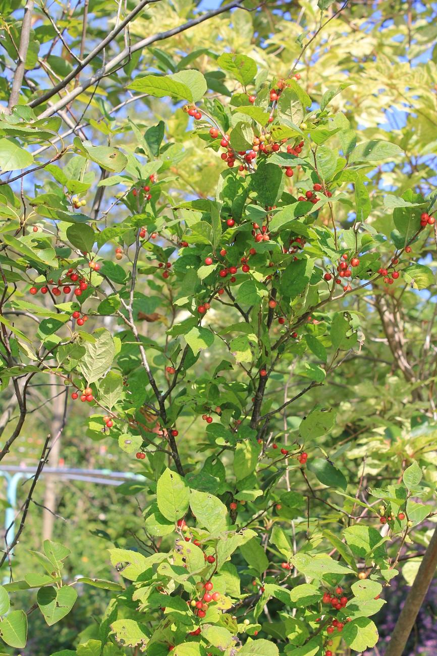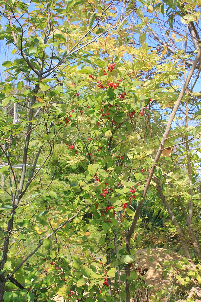 概要:5~6月、枝先から散房花序を垂らして、白い花をつける。9~10月、赤い実が熟し、垂れ下がる様子が美しい。