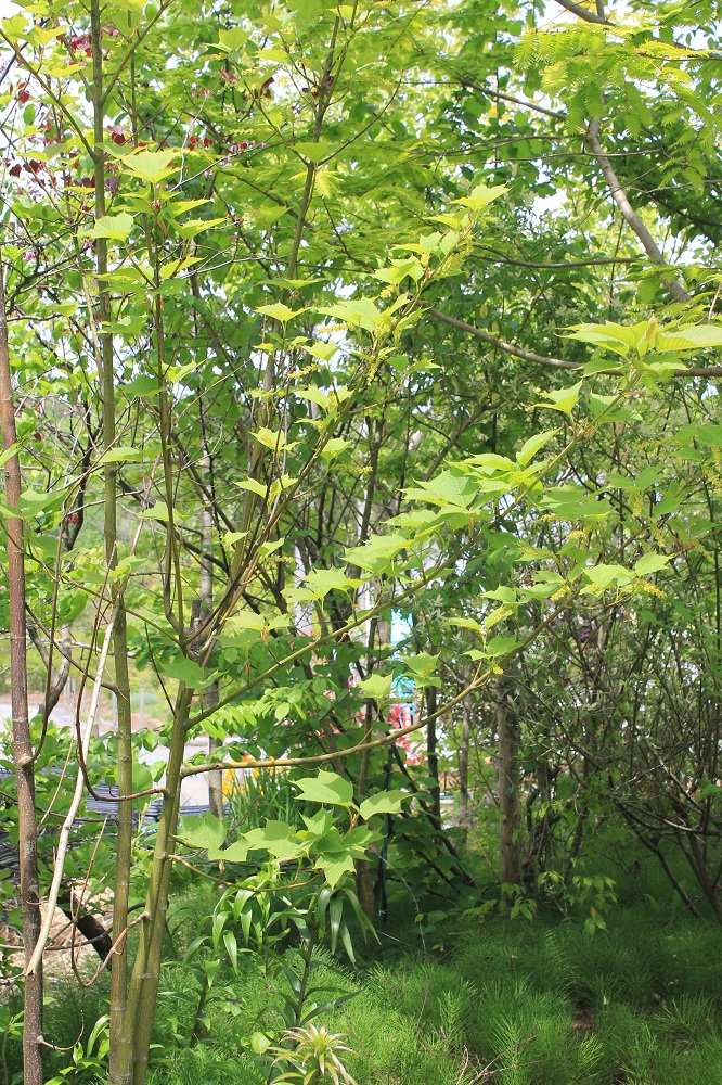 概要:春の新緑や、秋の紅葉がとても美しい。雌雄異株。本種は、新葉展開時が赤胴色になるタイプであるが、その銅葉は、その後、徐々に緑葉となる。(のちぐらみ)