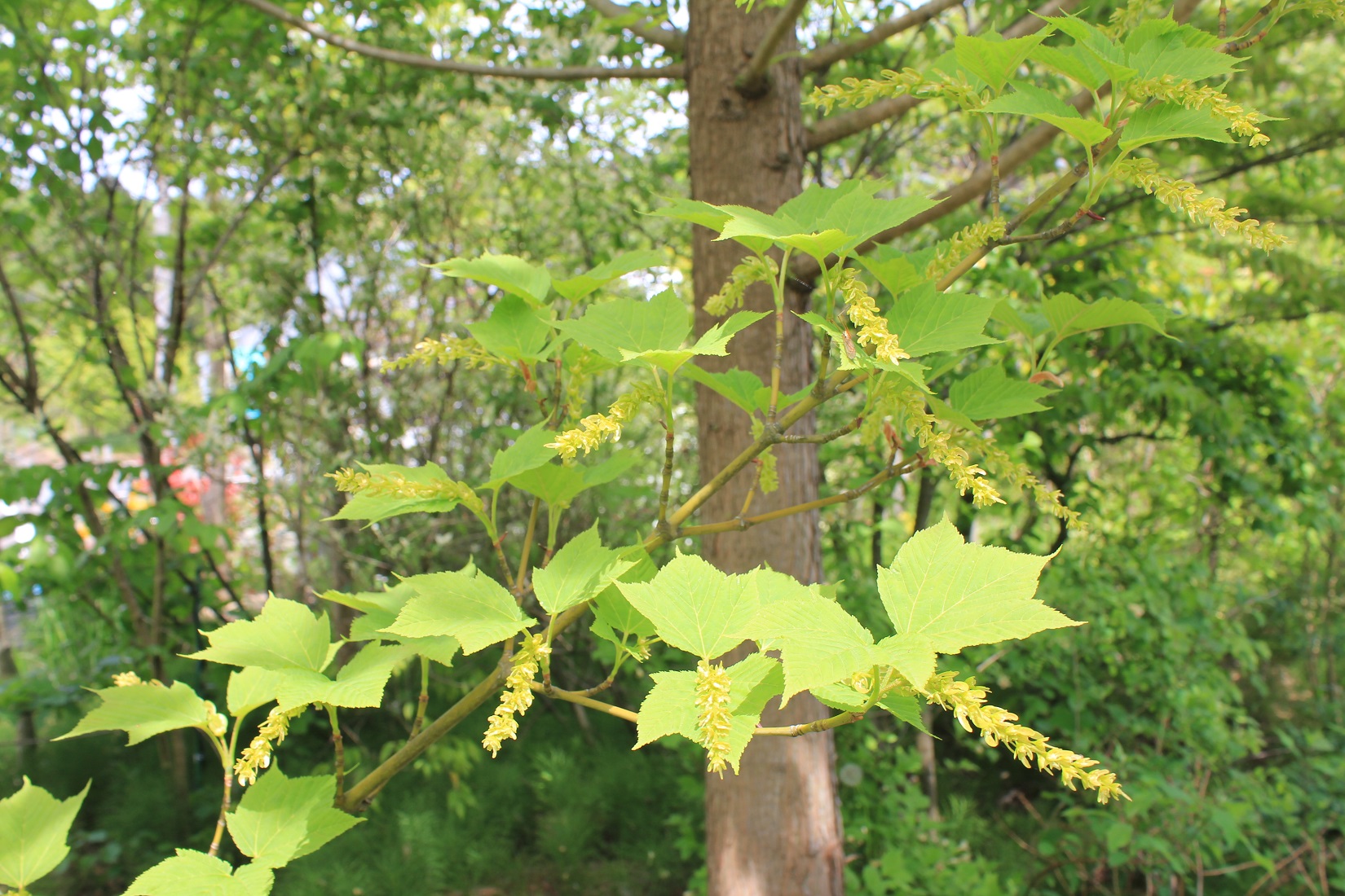概要:5月頃、葉と同時に細長い総状花序を垂らして、淡緑色の小さな花を開く。雌雄異株。多くはブナ帯にはえる落葉樹。樹皮が、マクワウリの実の色に似ているので、「ウリハダ」の名がある。古くは、樹皮で縄をつくった。この他に、葉に白い斑が入る品種を「ハツユキカエデ」(f.albolimbatum)という。