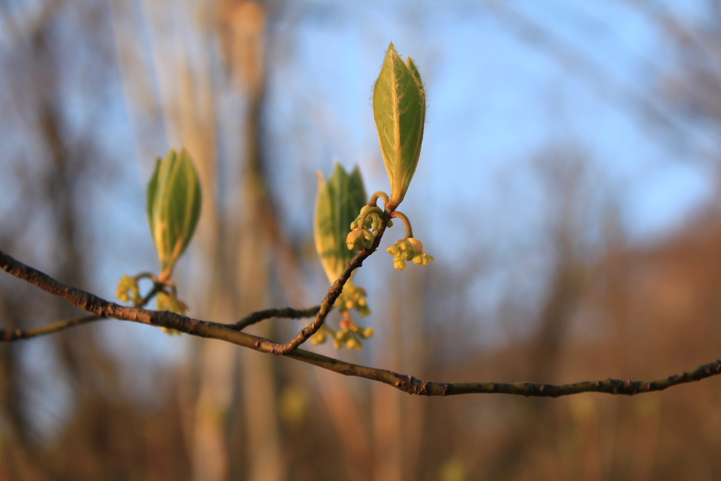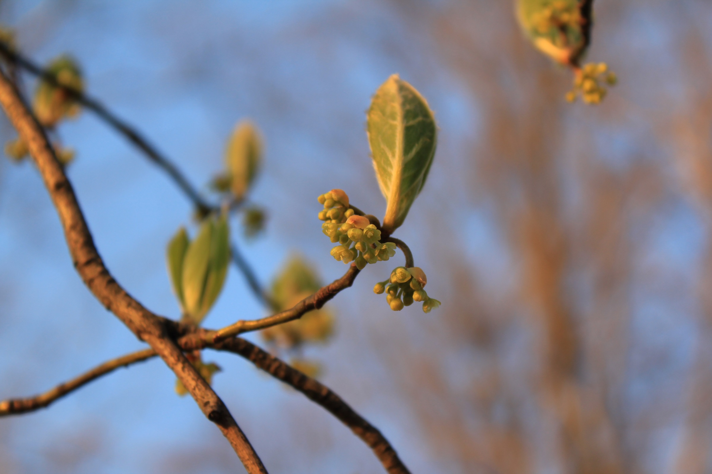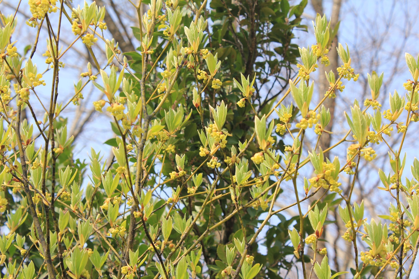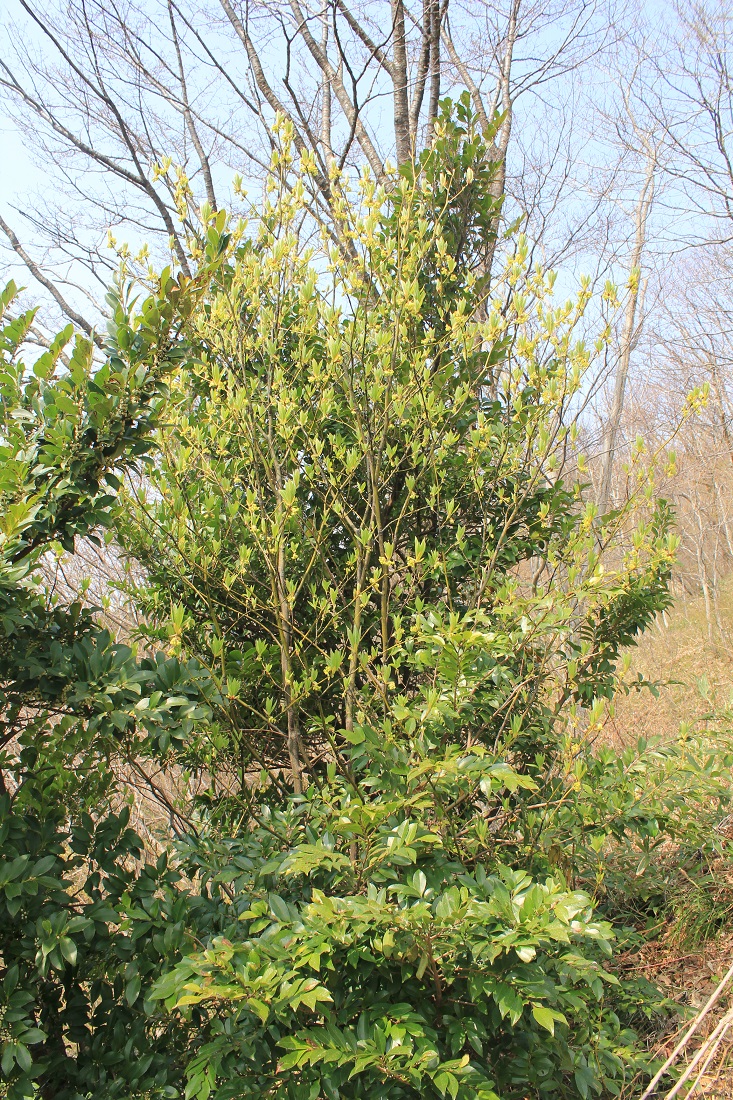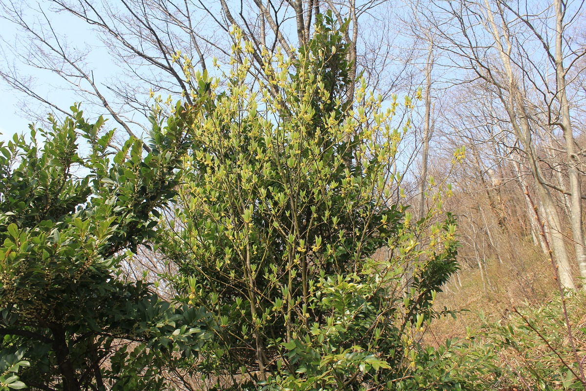 概要:クロモジの変種で、いくぶん葉が大きい。3~4月頃、葉と同時に、小枝の節に散形花序をだして、淡黄緑色の小花を多数つける。雌雄異株。果実は9~10月頃に、緑→茶→黒へと熟す。秋には、黄葉が美しい。材は高級な楊枝として利用される。葉や種子からも香油がとれる。