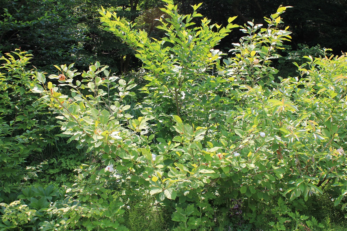 概要:5~7月頃、枝先に、直径8~10cmの甘い芳香ある白花が下向きに咲く。園芸品種の「ミチコレンゲ(cv.Plena)」は、八重咲種である。「ウケザキオオヤマレンゲ(Magnolia watsonii)」は、オオヤマレンゲとホウノキ(Magnolia obovata)の雑種で、その名の如く、大輪の芳香ある白い花を上向きに開花させる。
