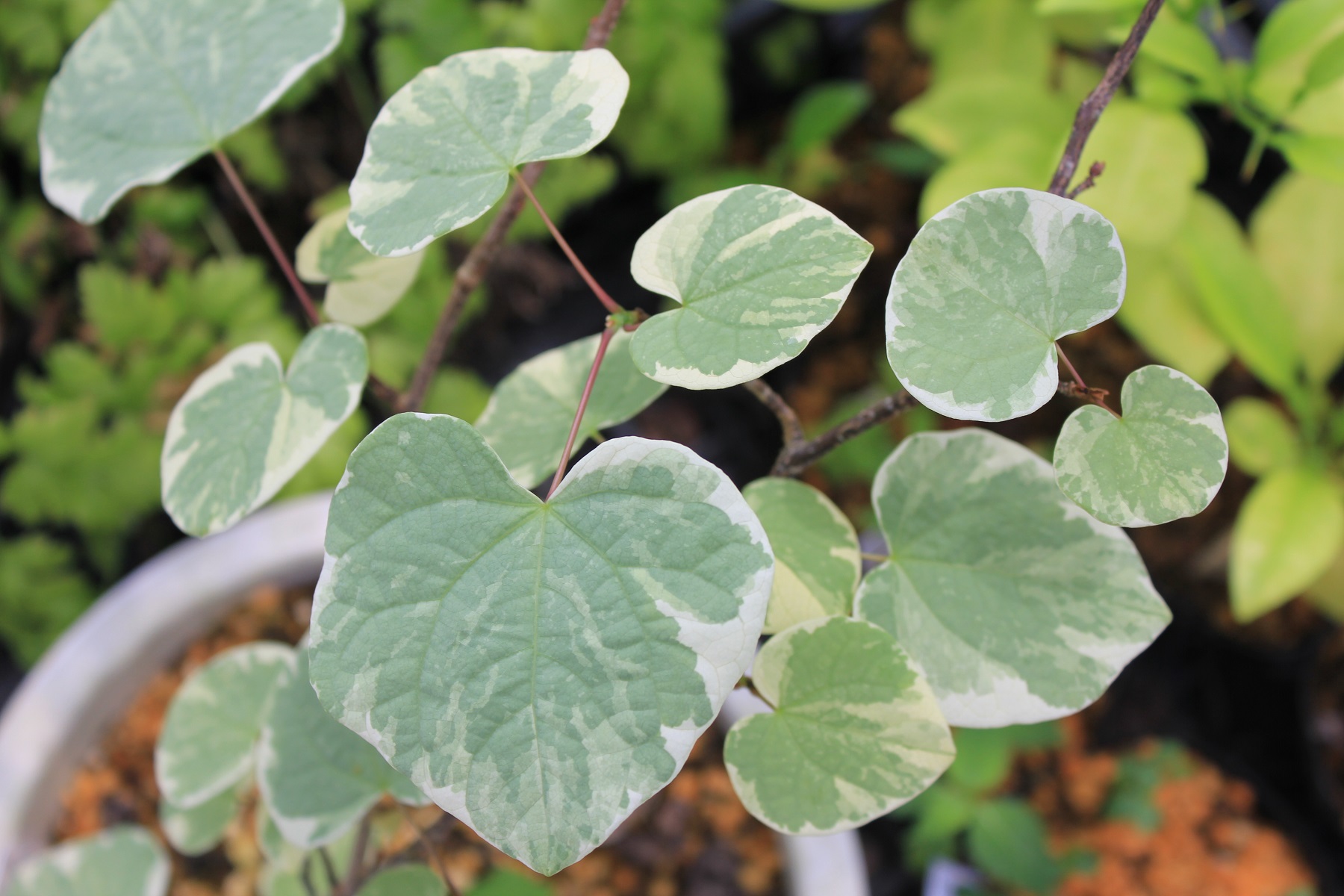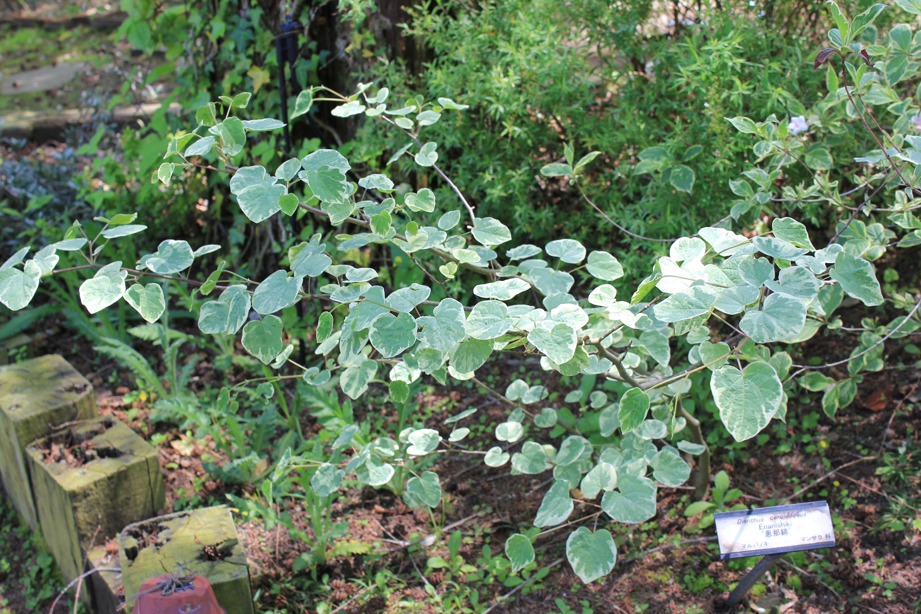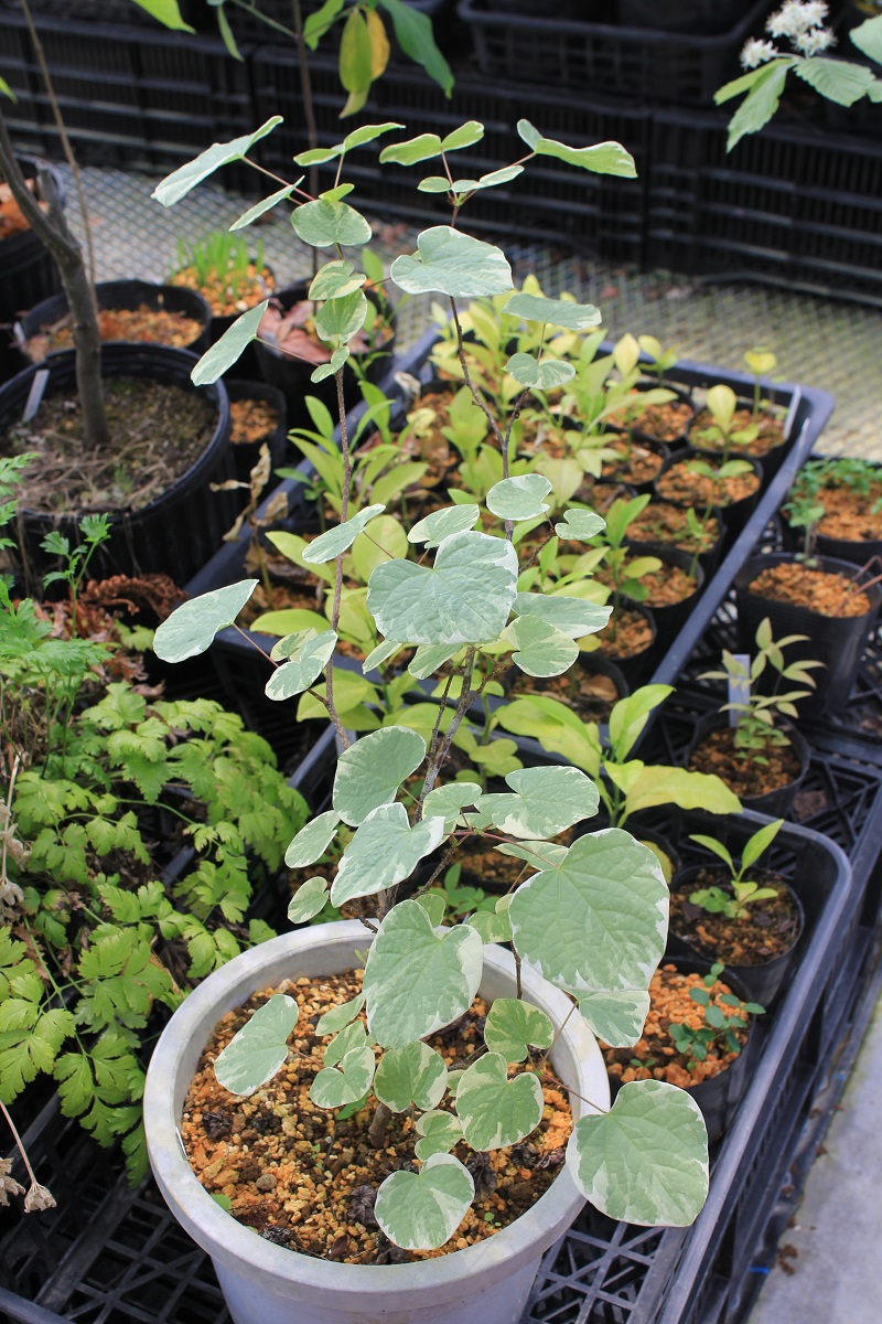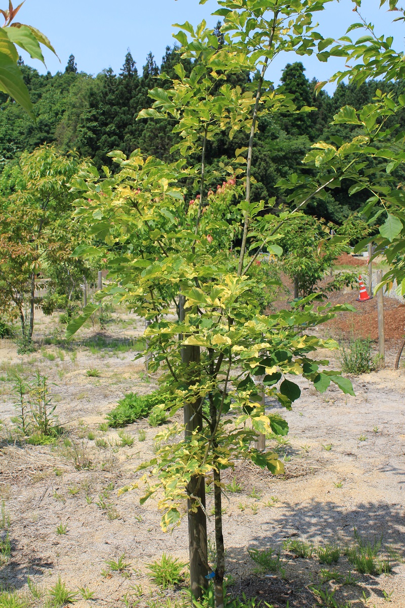 概要:ヤチダモは湿地に生える羽状複葉の落葉樹である。北海道では植林もされている。雌雄異株。4~5月、葉が展開すると同時に、花弁もがくもない花をつける。9~10月、果実が熟す。材は加工が容易で、家具・建材・船舶・運動具などに利用される。アメリカでは、’タモ’または’ジャパニーズアッシュ’の名で知られている。本種は、新潟県内の民家にあった美しい斑入葉種で、おそらく先人が山林内から移動して、栽培してきたものではないかと思われる。詳細不明。