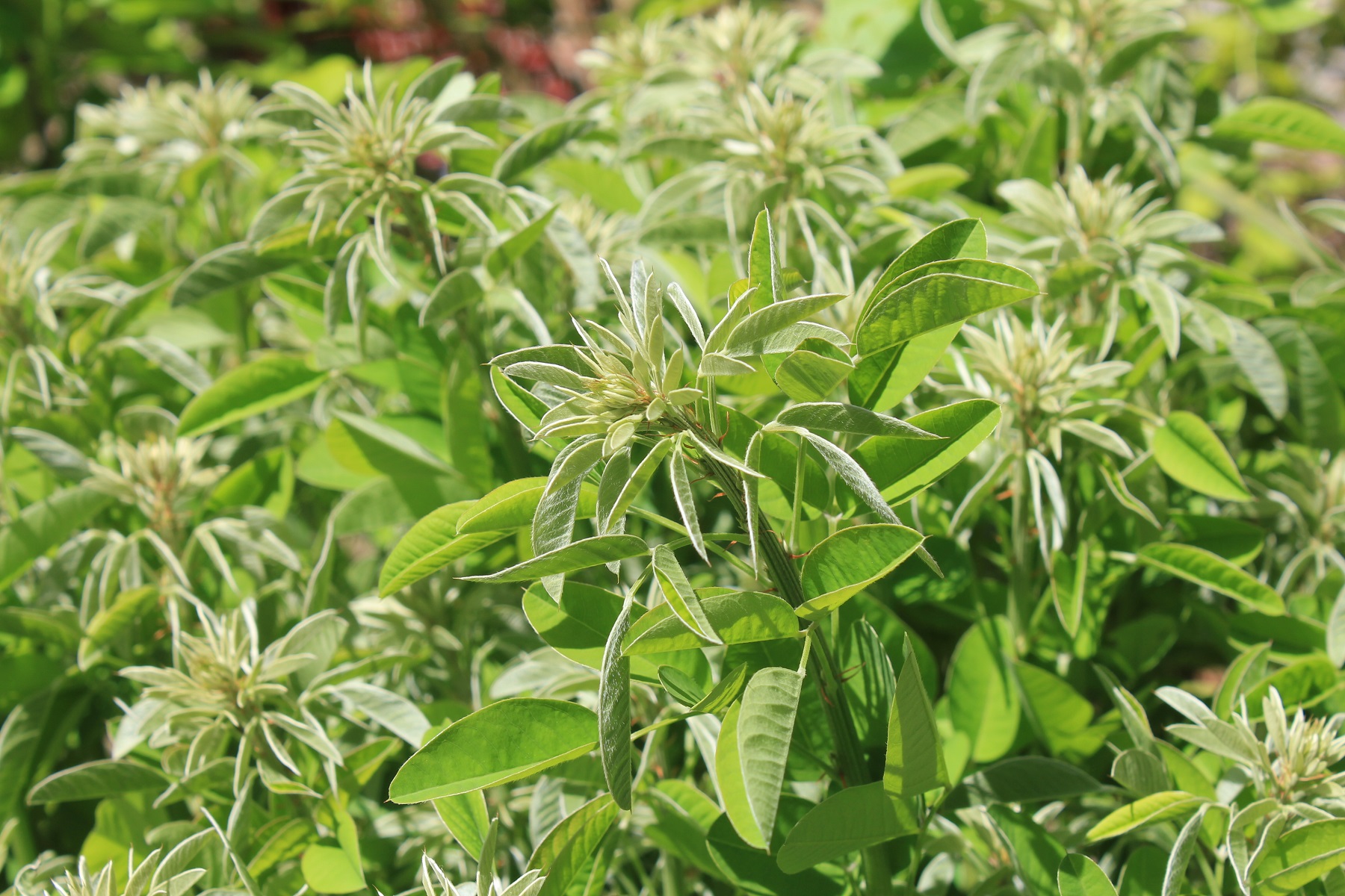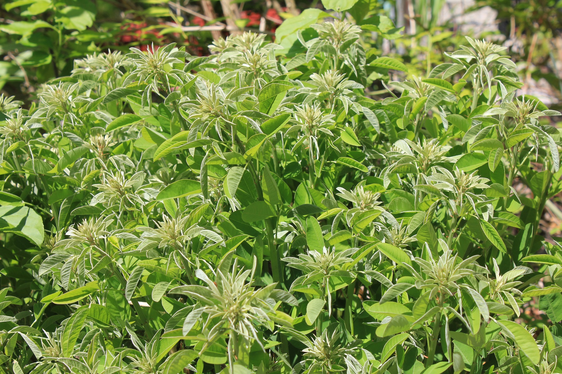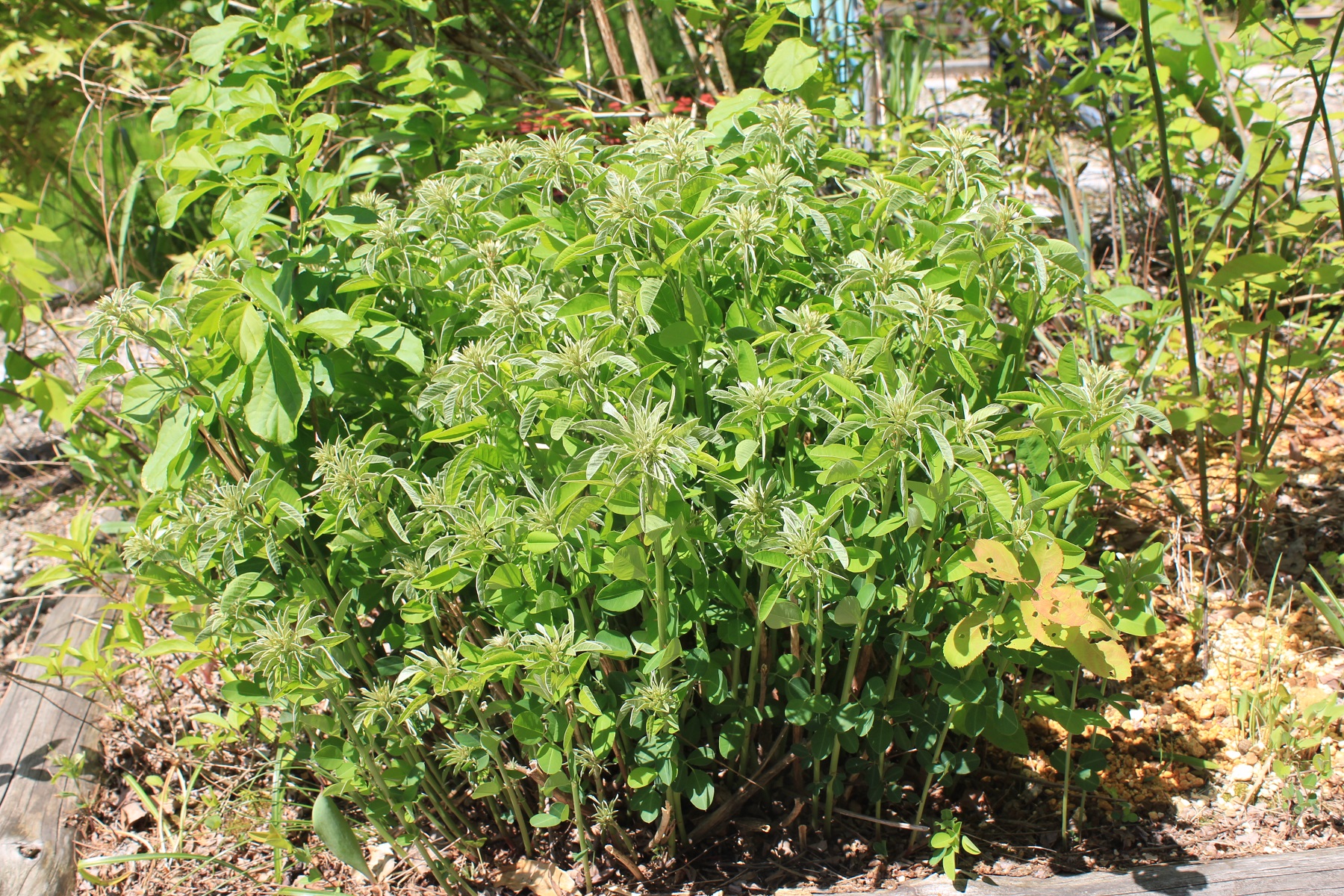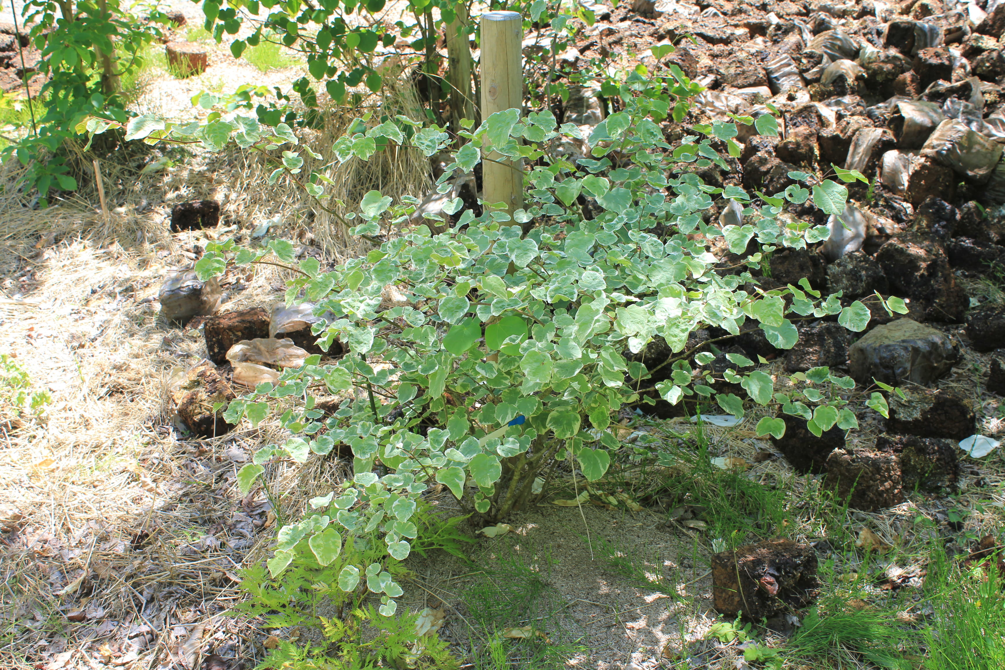 概要:ヤチダモは湿地に生える羽状複葉の落葉樹である。北海道では植林もされている。雌雄異株。4~5月、葉が展開すると同時に、花弁もがくもない花をつける。9~10月、果実が熟す。材は加工が容易で、家具・建材・船舶・運動具などに利用される。アメリカでは、’タモ’または’ジャパニーズアッシュ’の名で知られている。本種は、新潟県内の民家にあった美しい斑入葉種で、おそらく先人が山林内から移動して、栽培してきたものではないかと思われる。詳細不明。