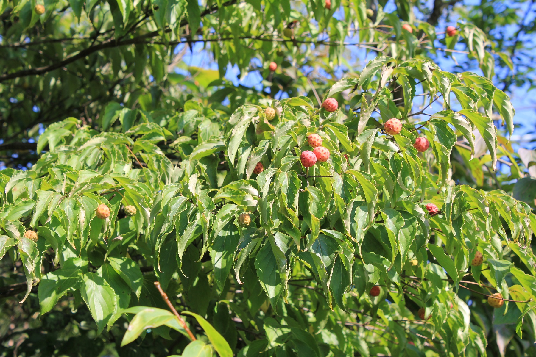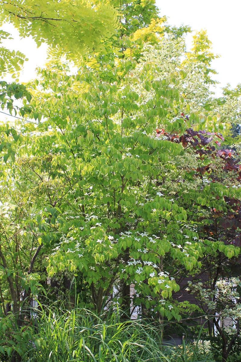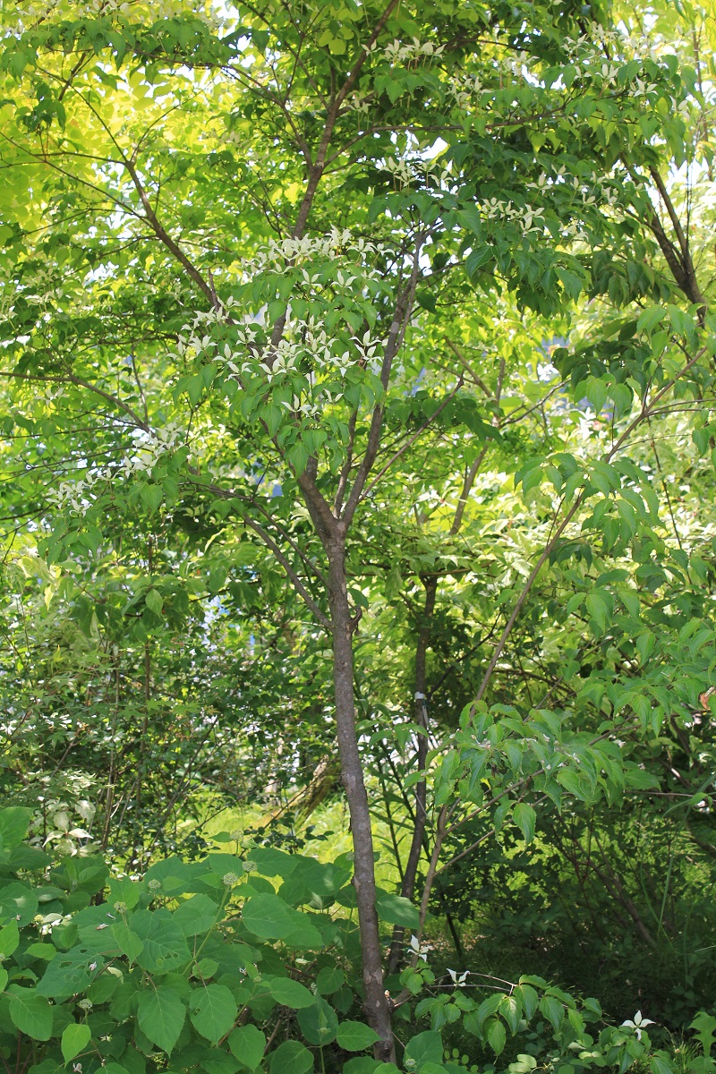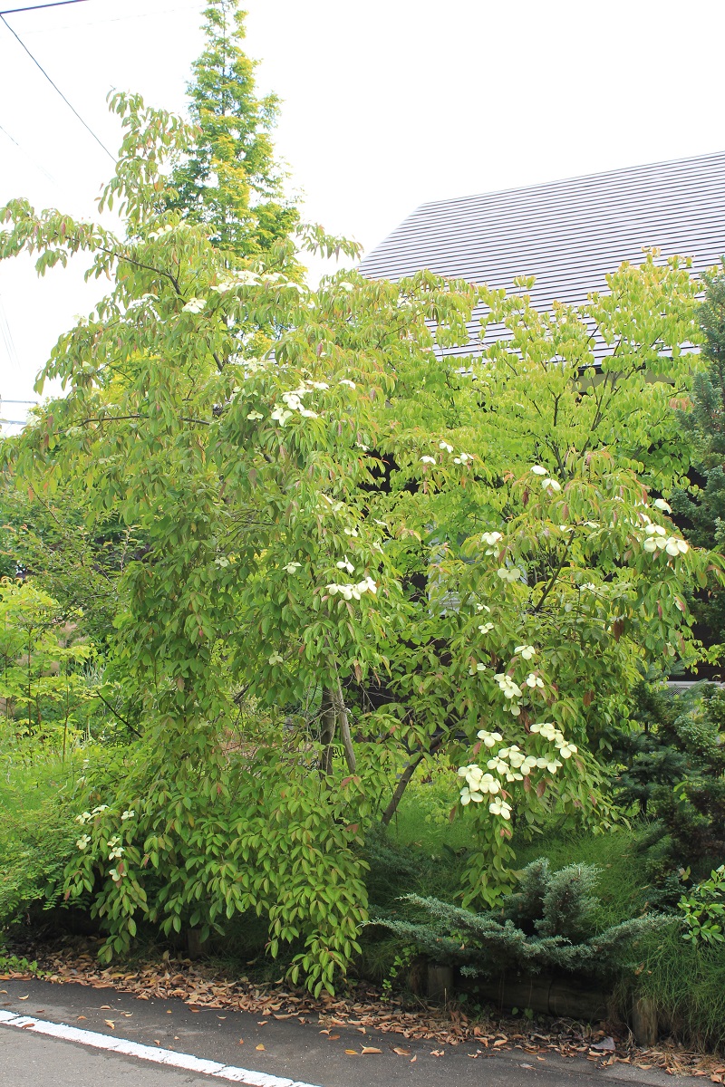 概要:6~7月、枝先に白色の花をつける。花と思われる部分は、平らに開いた総包片である。10月、球状の集合果が赤く熟す。食用可。鉢植え、庭植え、シンボリツリーに利用される。