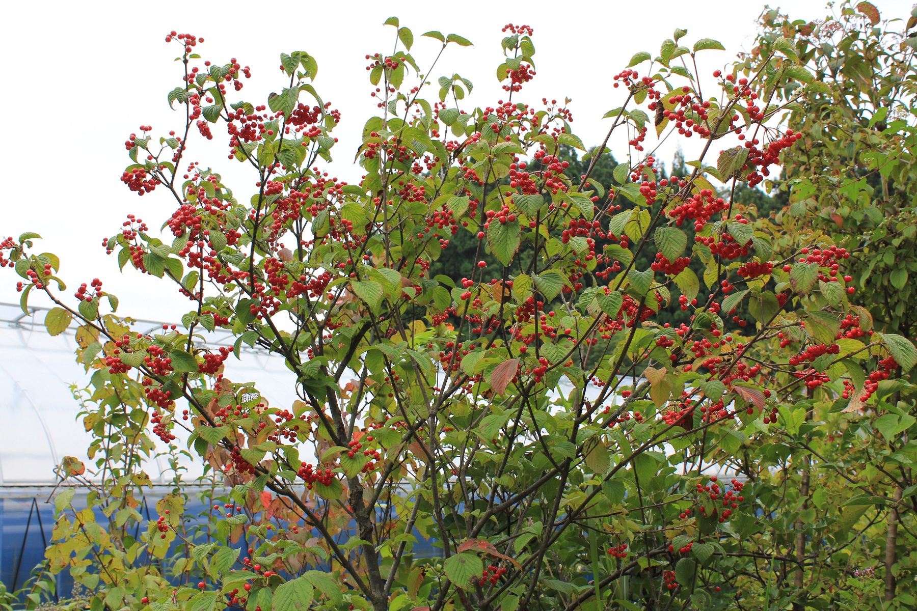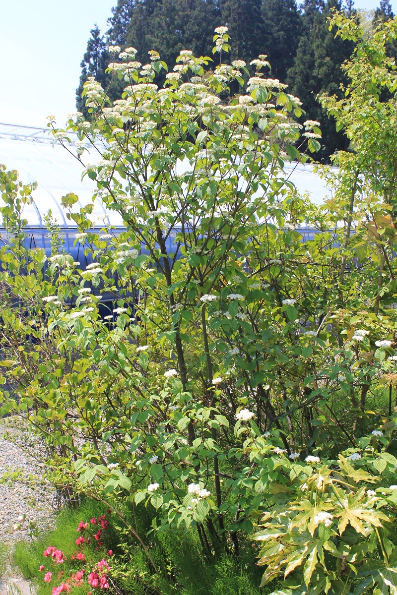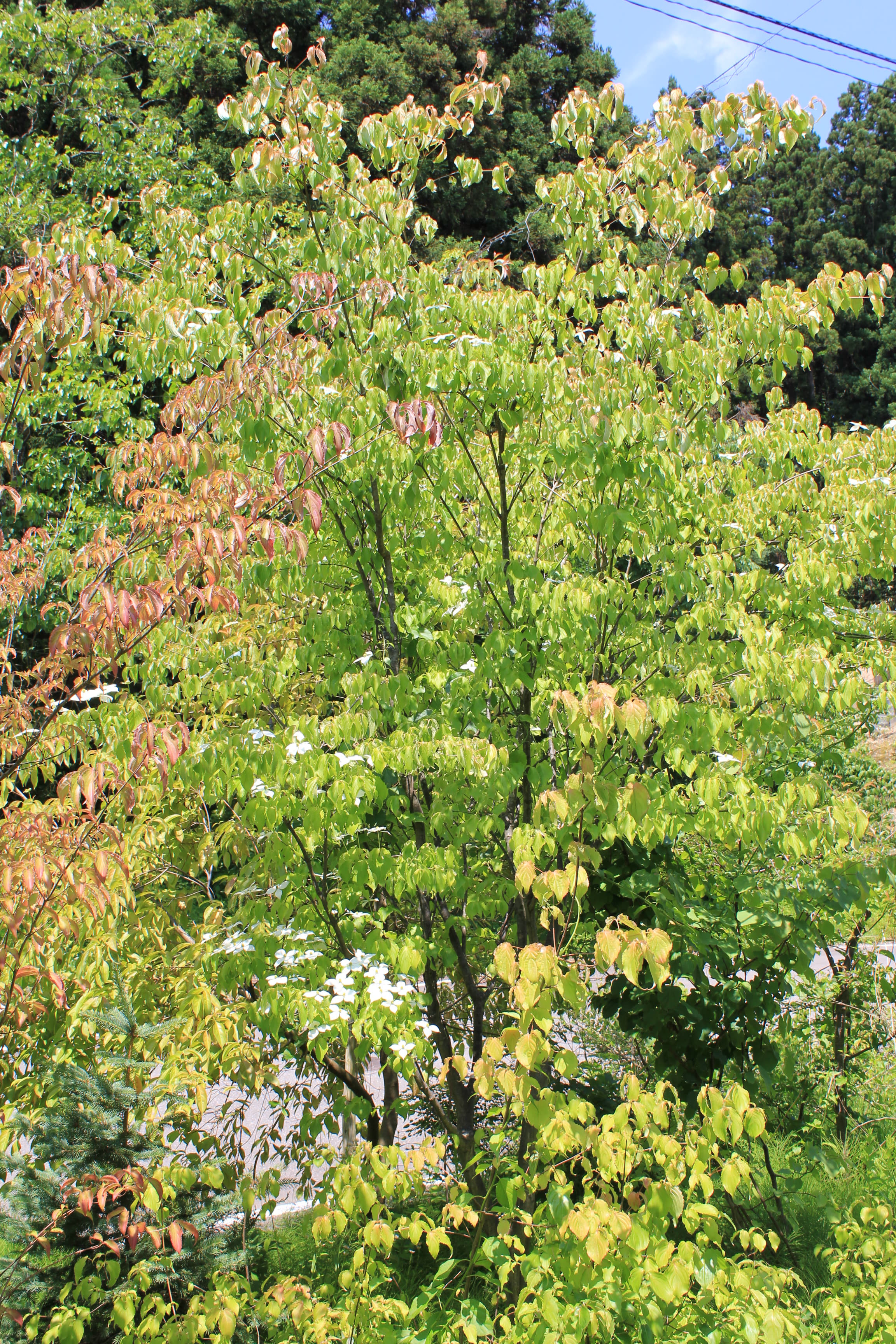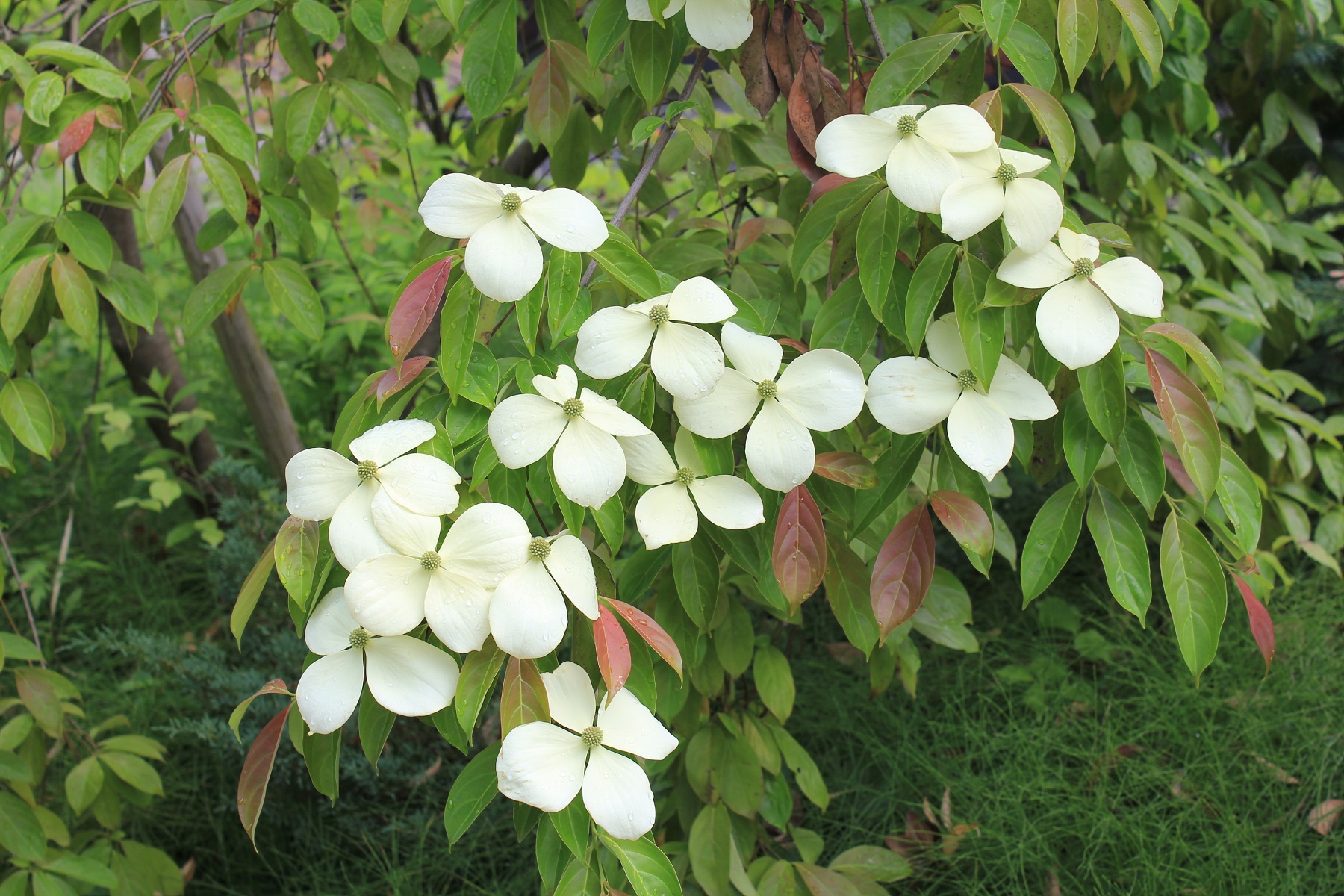 概要:6~7月、枝先に白色の花をつける。花と思われる部分は、平らに開いた総包片である。10月、球状の集合果が赤く熟す。食用可。鉢植え、庭植え、シンボリツリーに利用される。