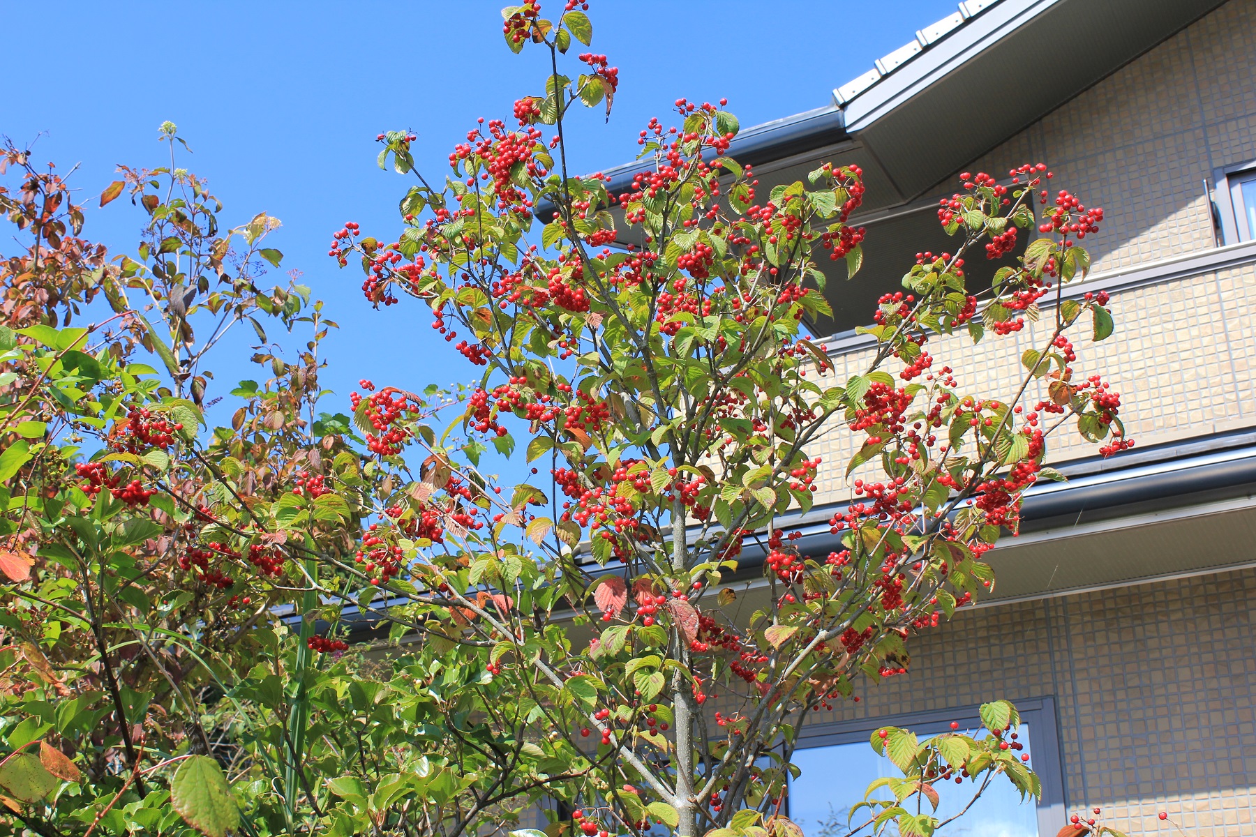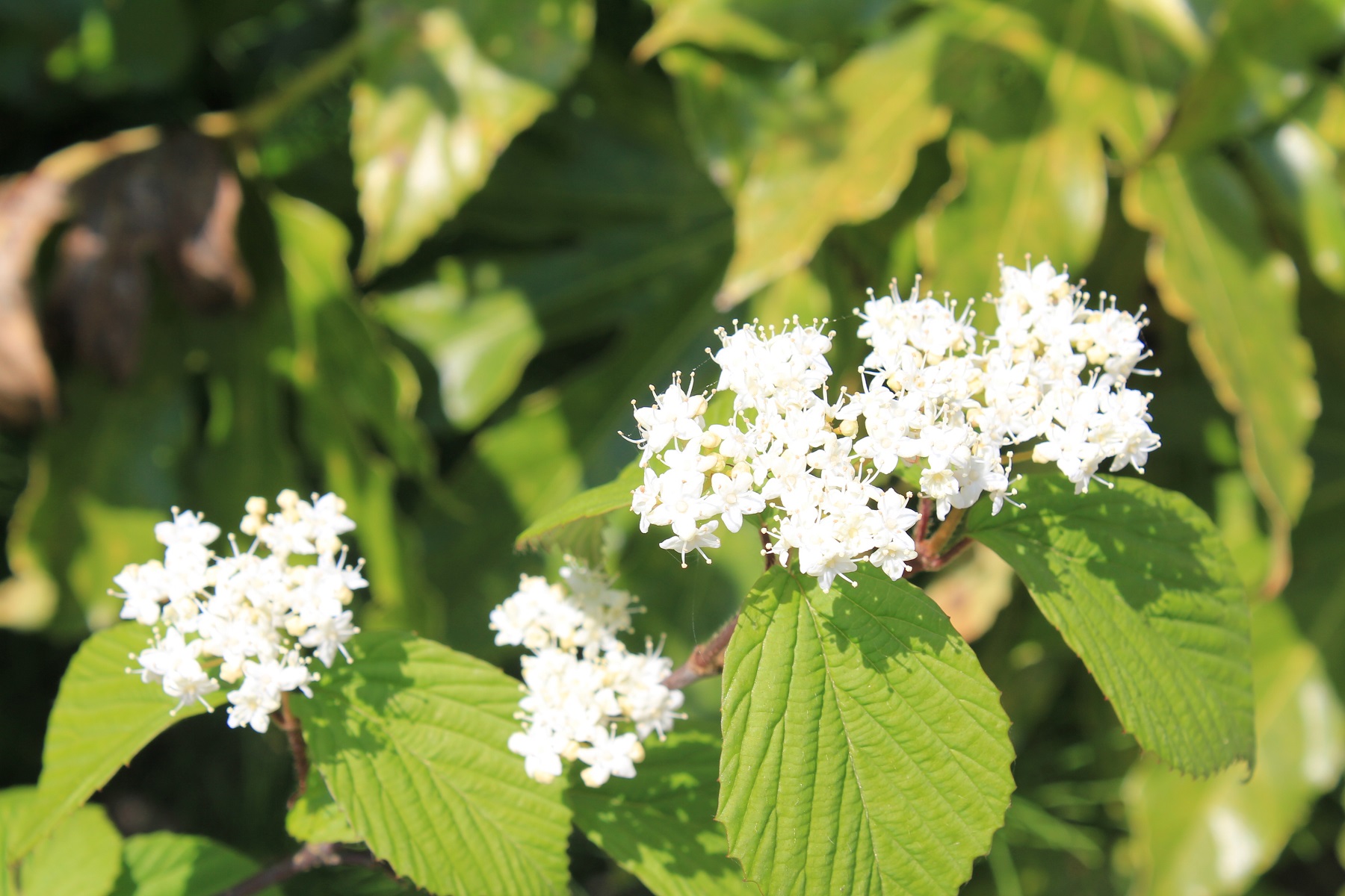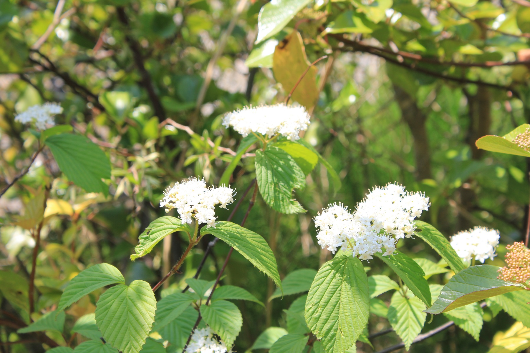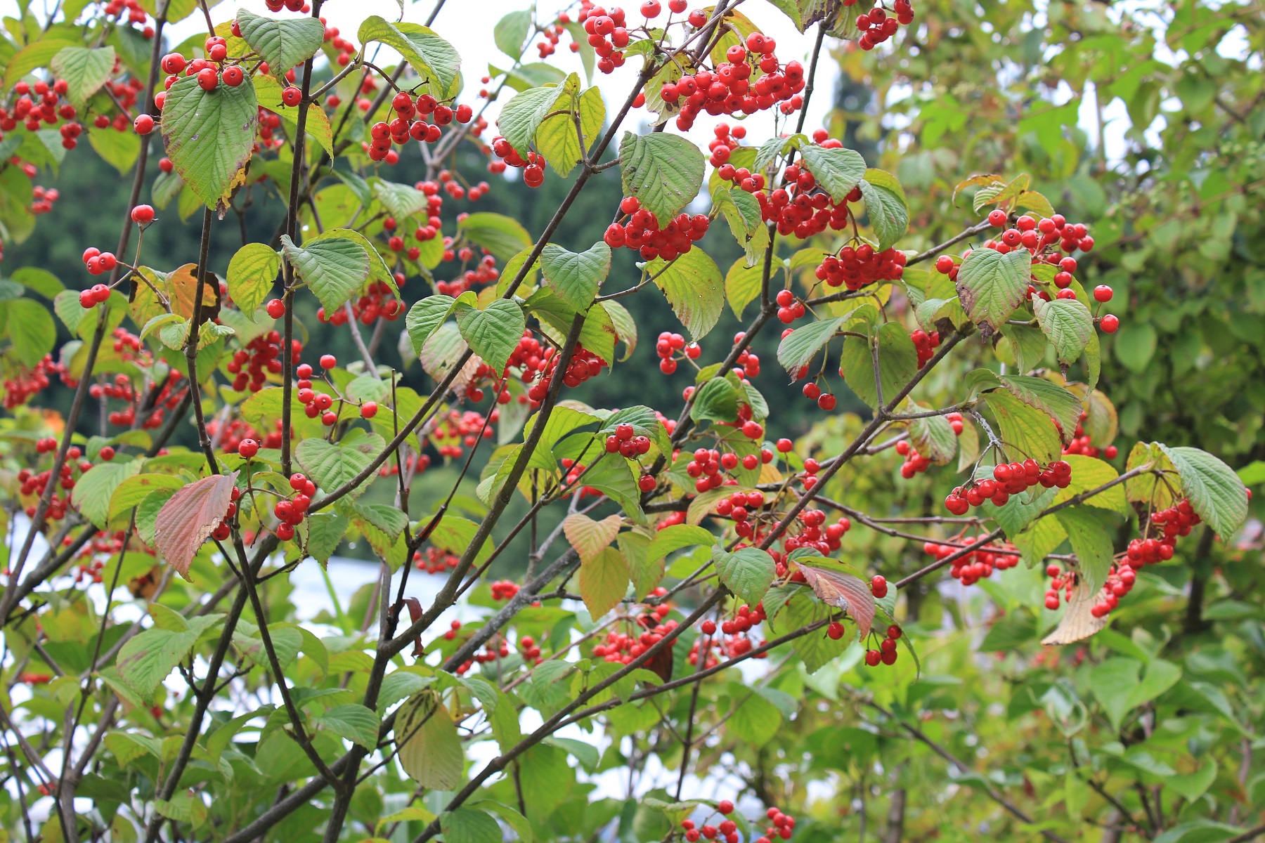 概要:6~7月、枝先に白色の花をつける。花と思われる部分は、平らに開いた総包片である。10月、球状の集合果が赤く熟す。食用可。鉢植え、庭植え、シンボリツリーに利用される。