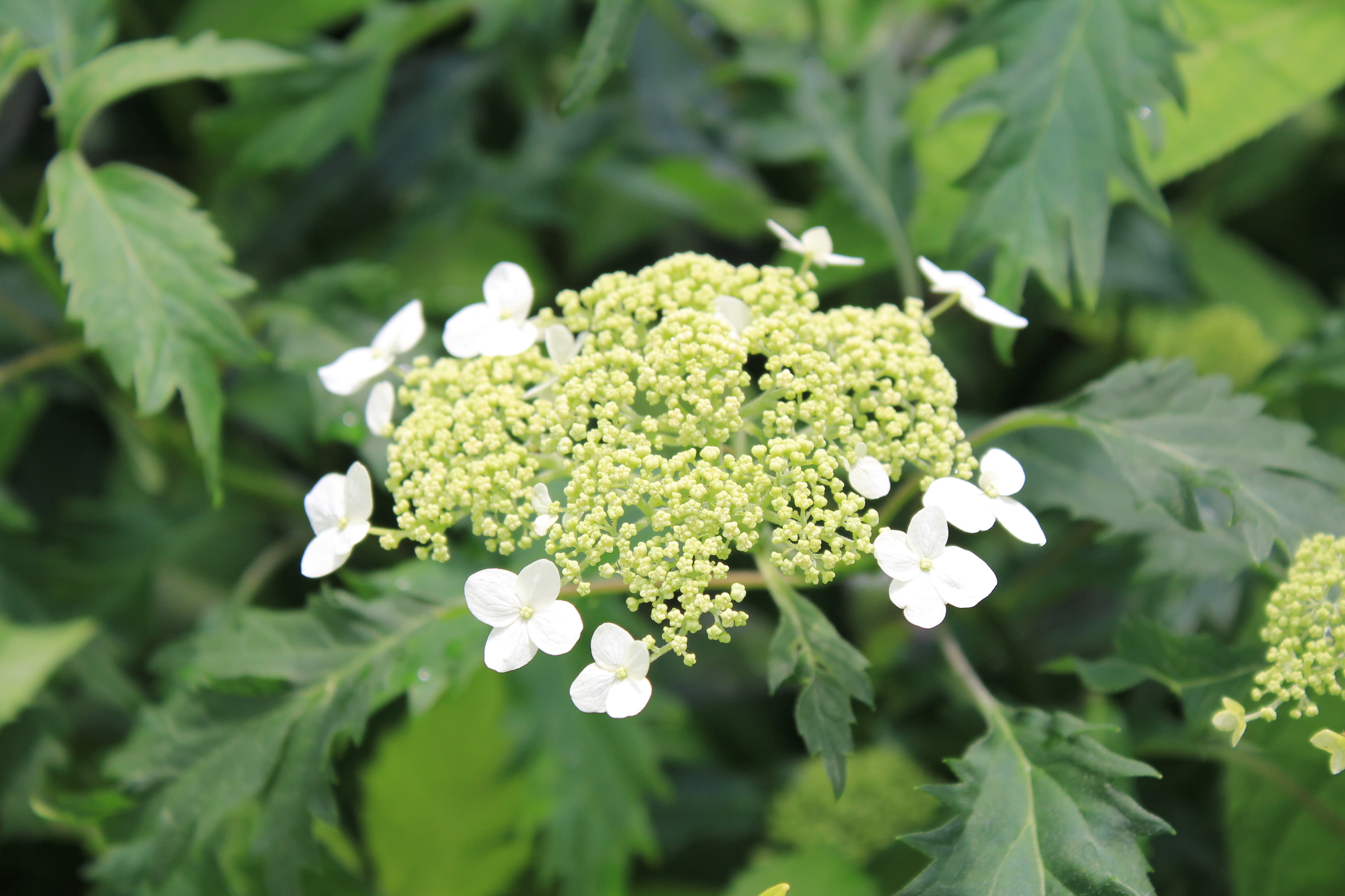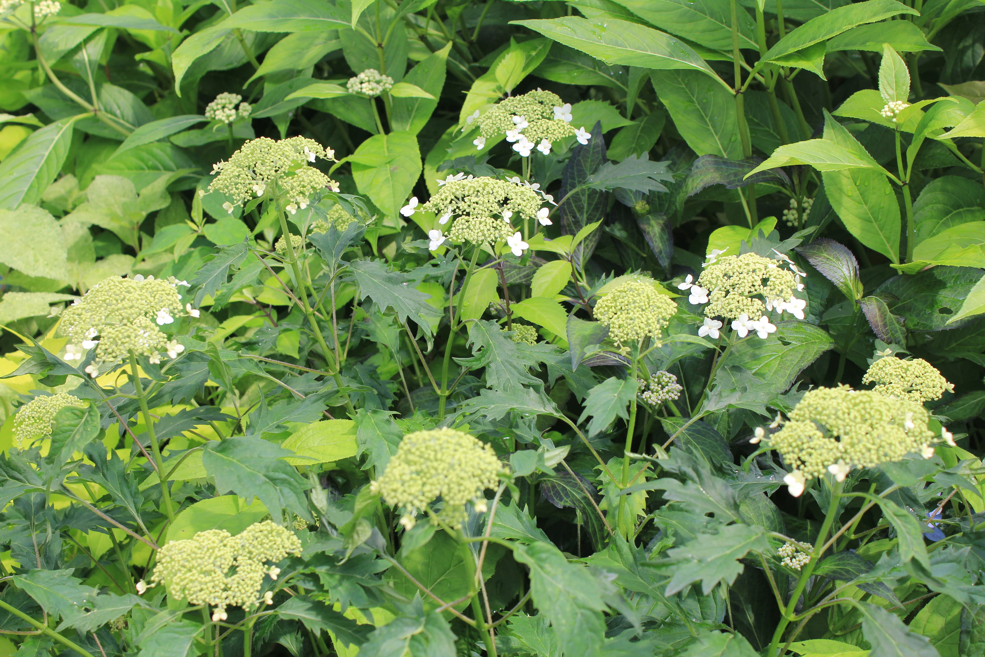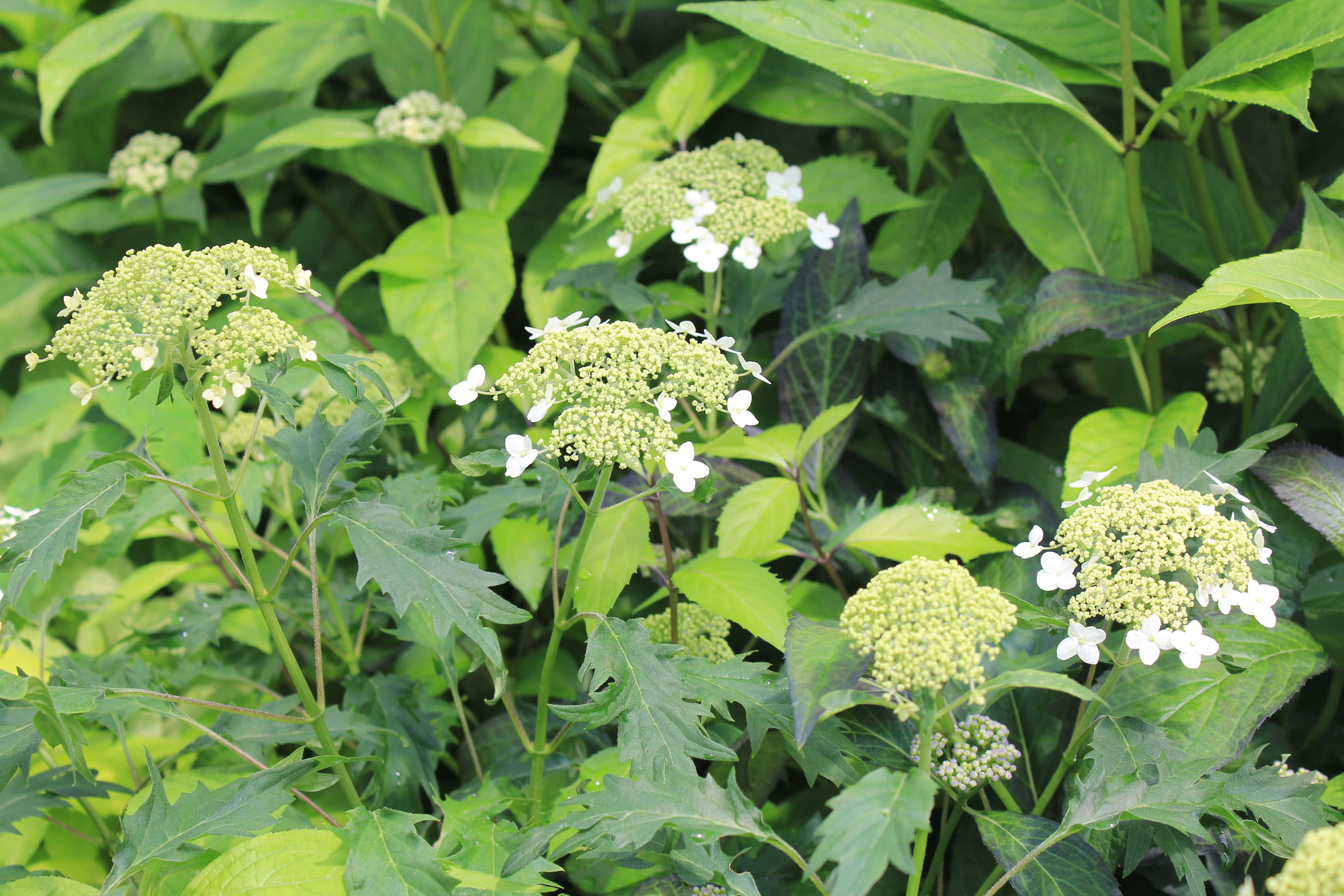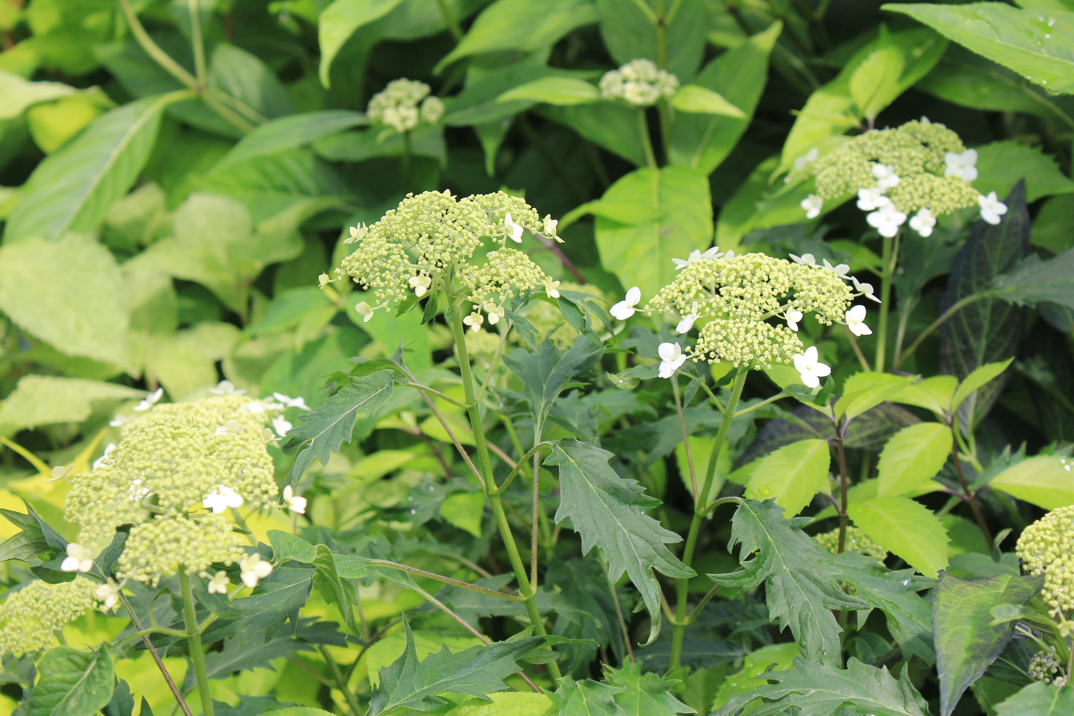 概要:6~7月頃、緑色のドーム状に花序が盛り上がり、白色花を開花させる。本種は、切れ込み深いユニークな葉と、円錐状のガク咲き花が、大変面白い。寒さにも強く、鉢植え・庭植えともによい。