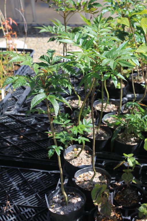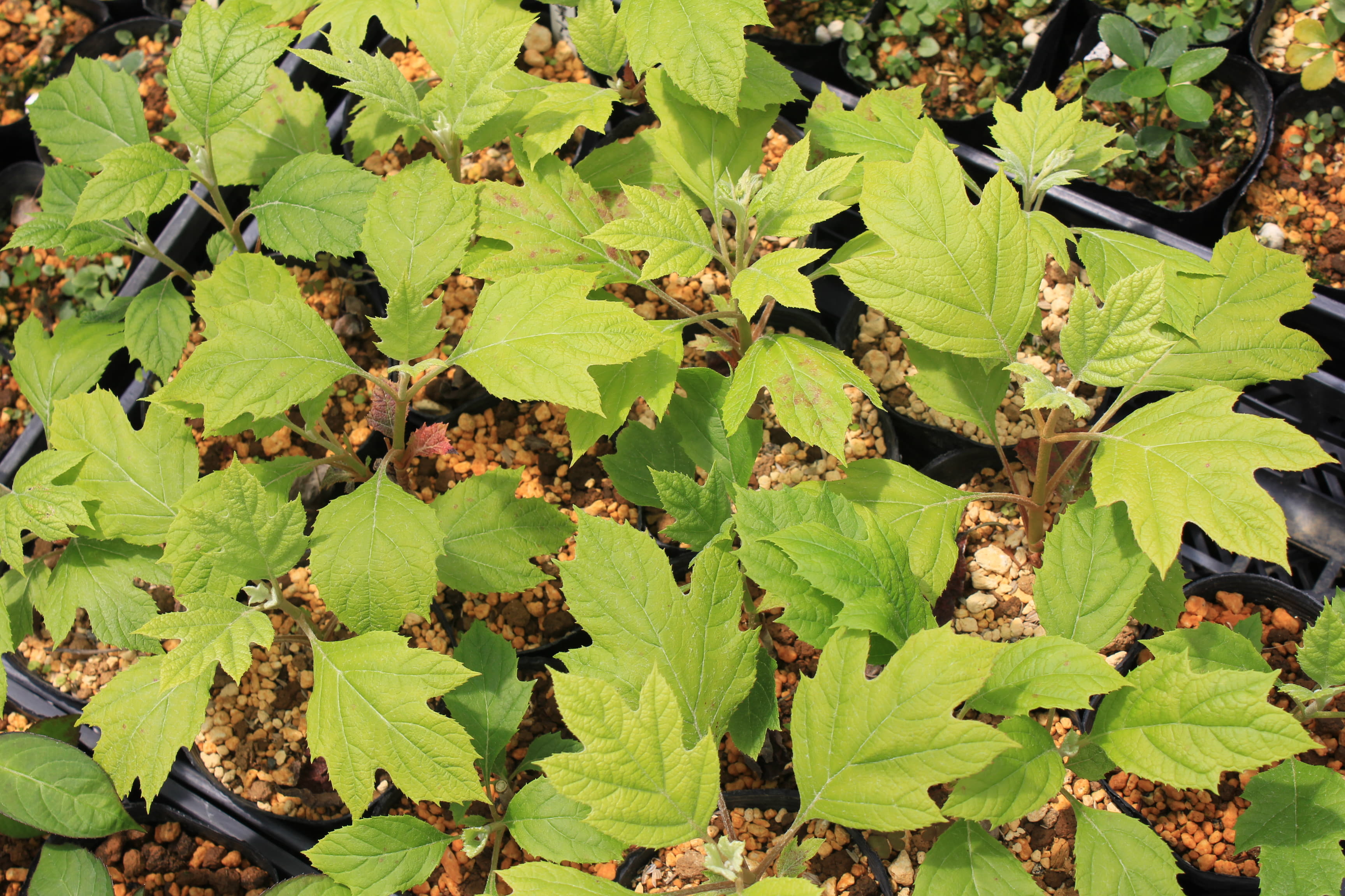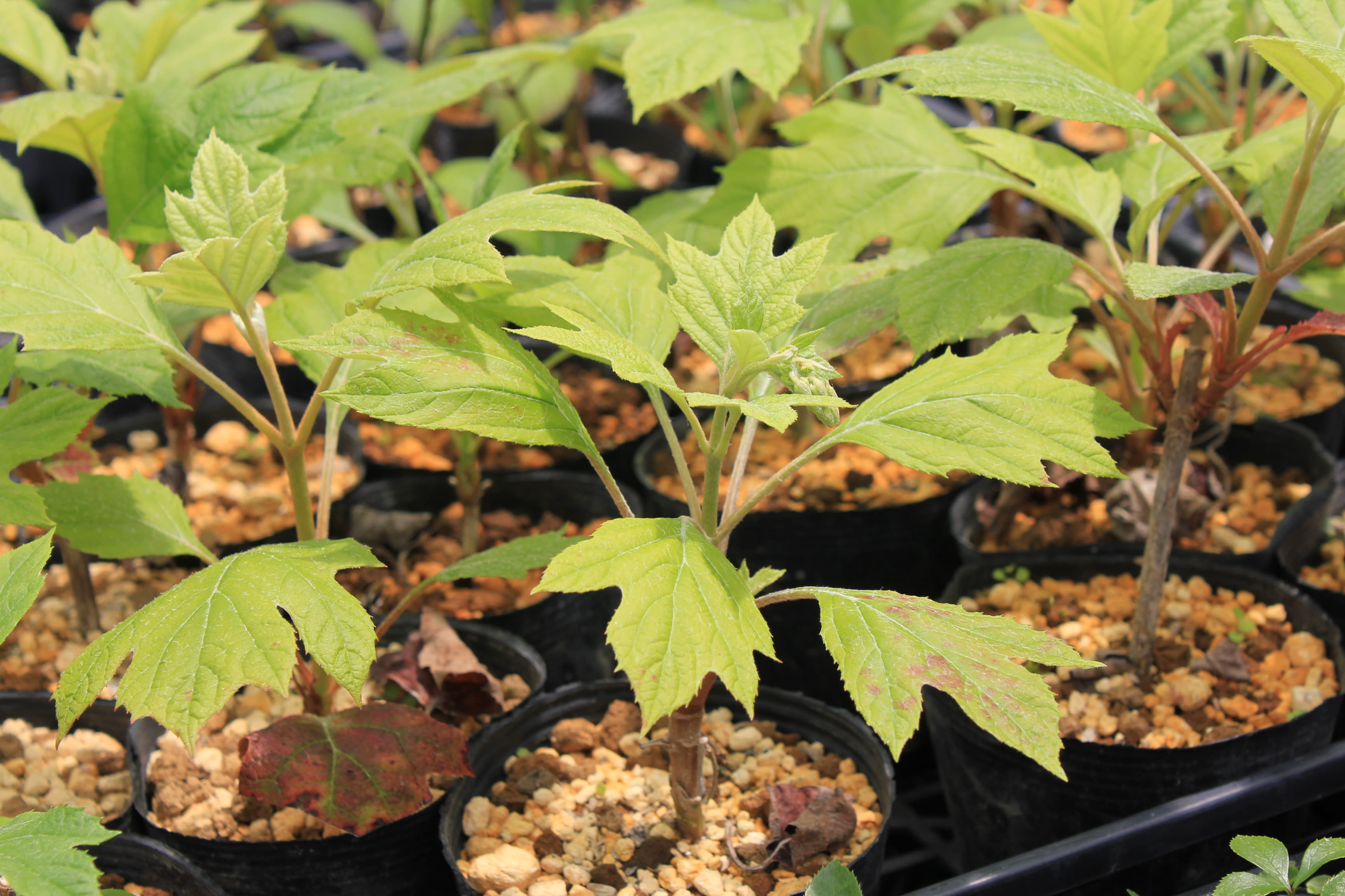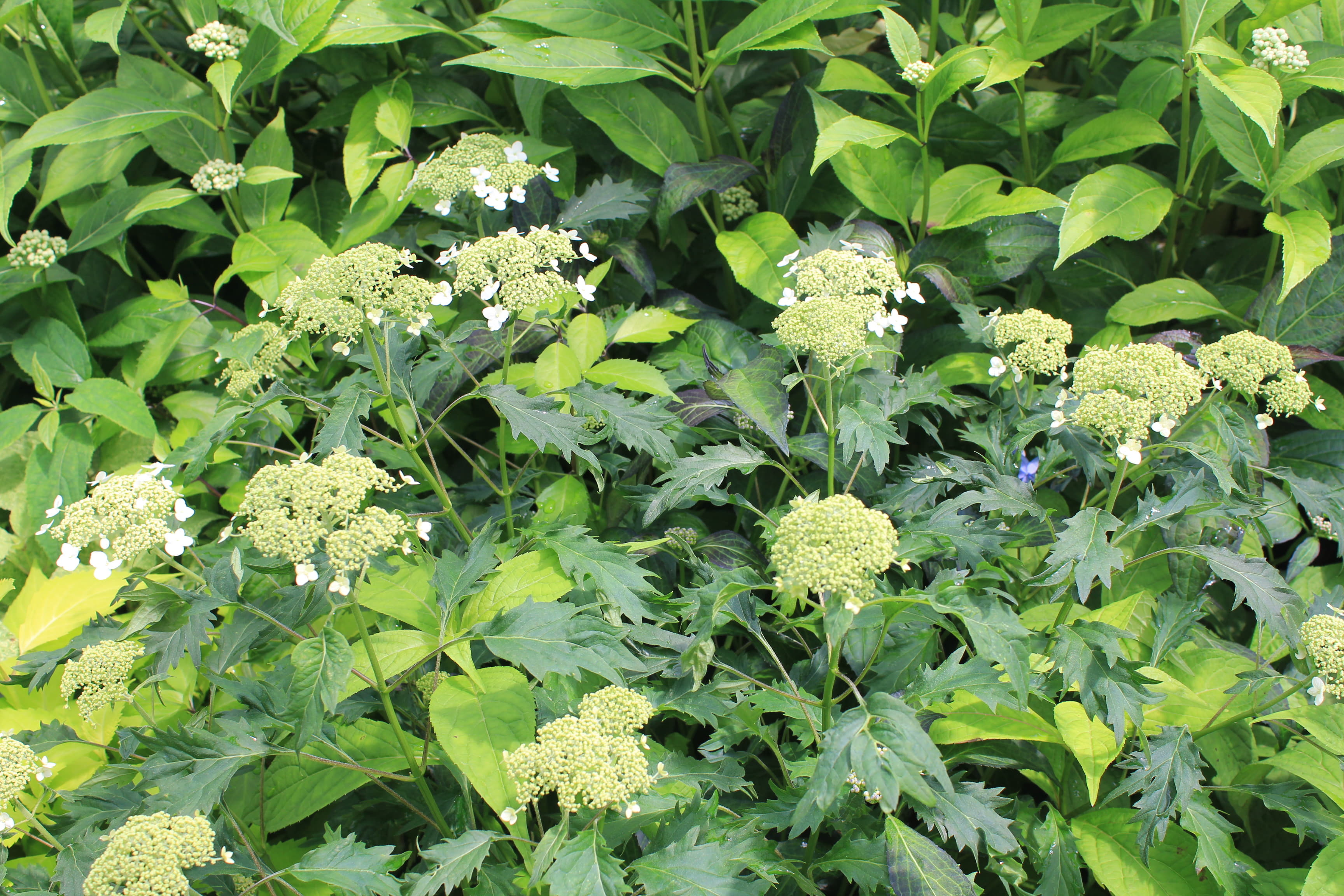 概要:6~7月頃、緑色のドーム状に花序が盛り上がり、白色花を開花させる。本種は、切れ込み深いユニークな葉と、円錐状のガク咲き花が、大変面白い。寒さにも強く、鉢植え・庭植えともによい。