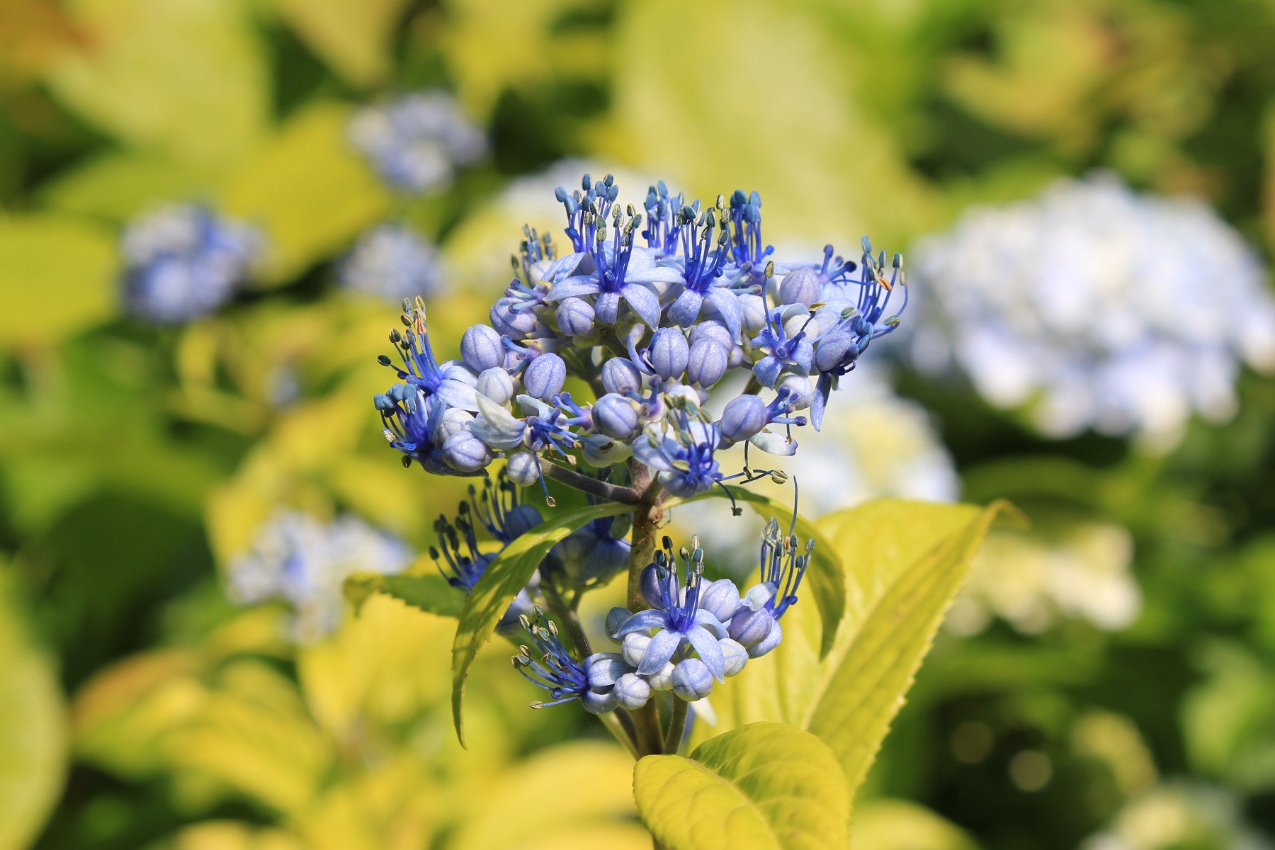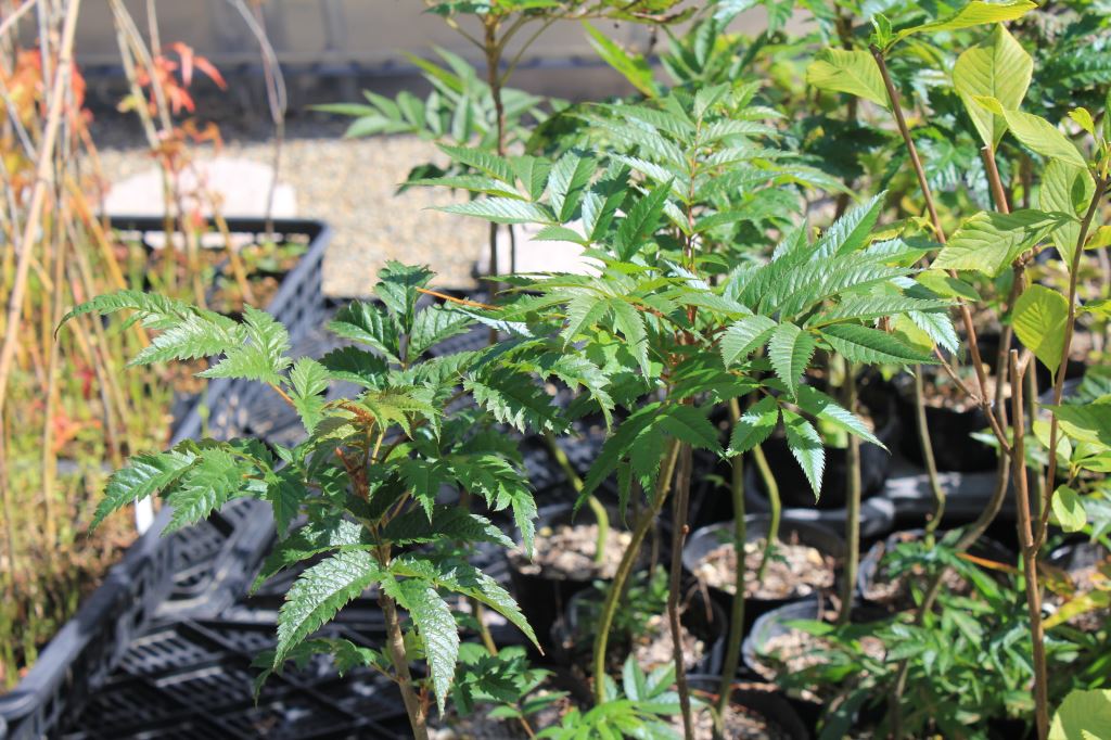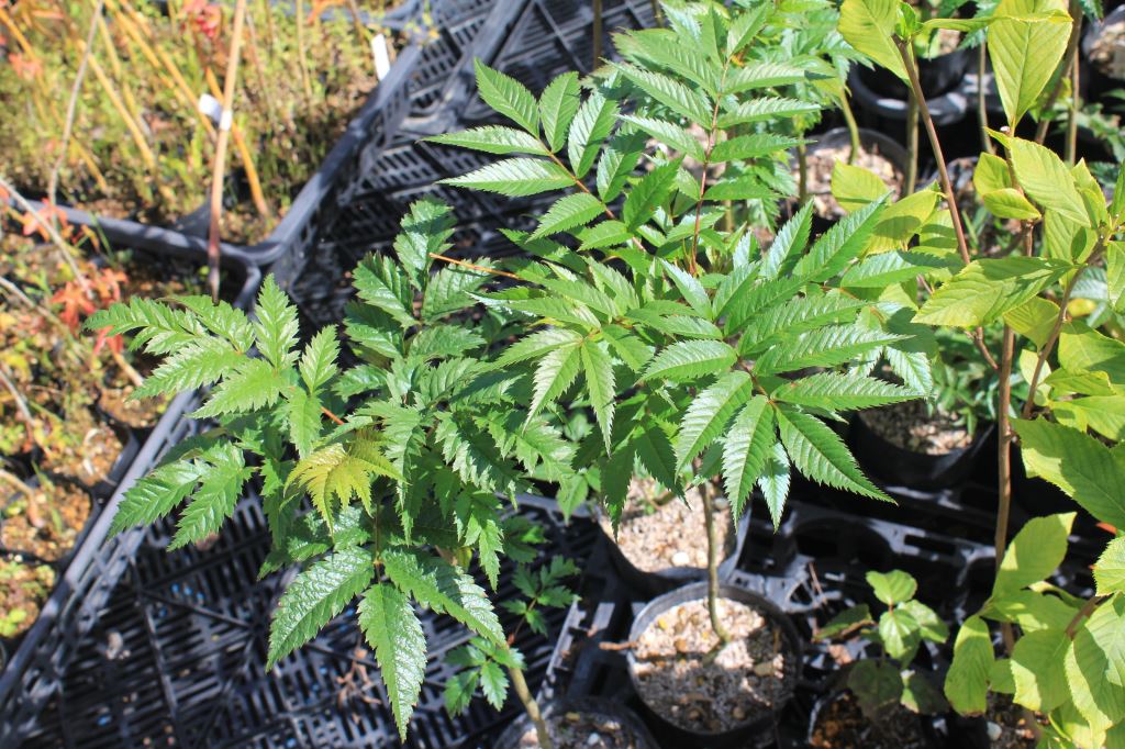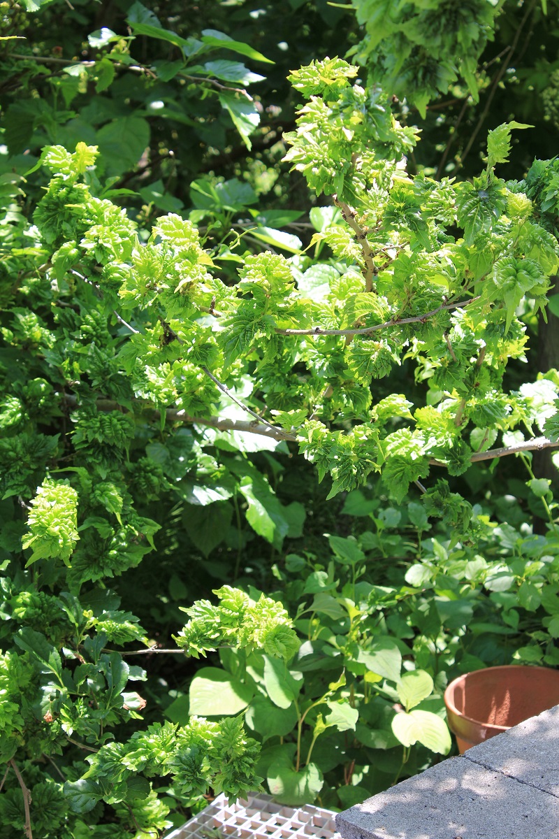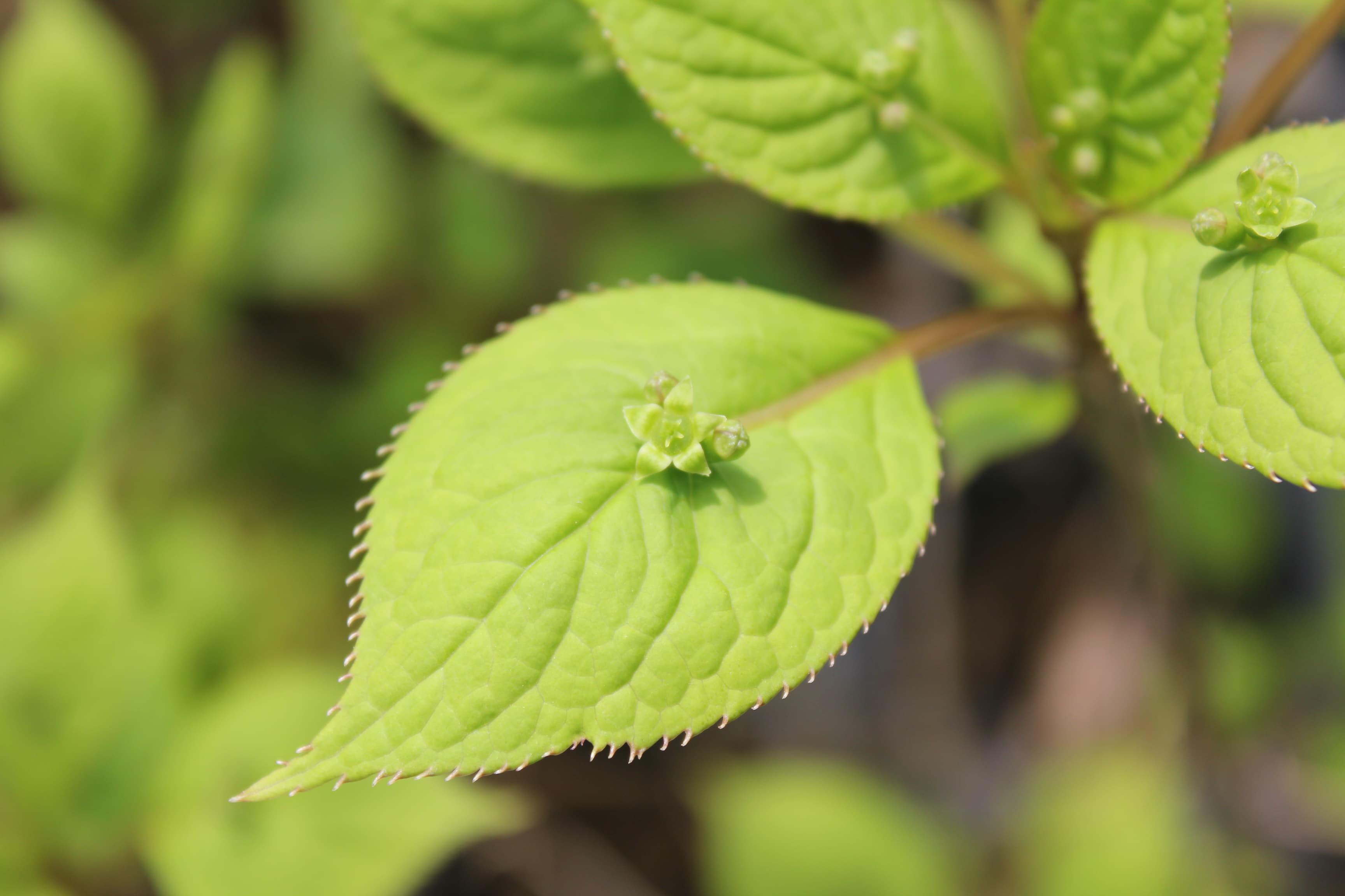 概要:6~7月頃、緑色のドーム状に花序が盛り上がり、白色花を開花させる。本種は、切れ込み深いユニークな葉と、円錐状のガク咲き花が、大変面白い。寒さにも強く、鉢植え・庭植えともによい。