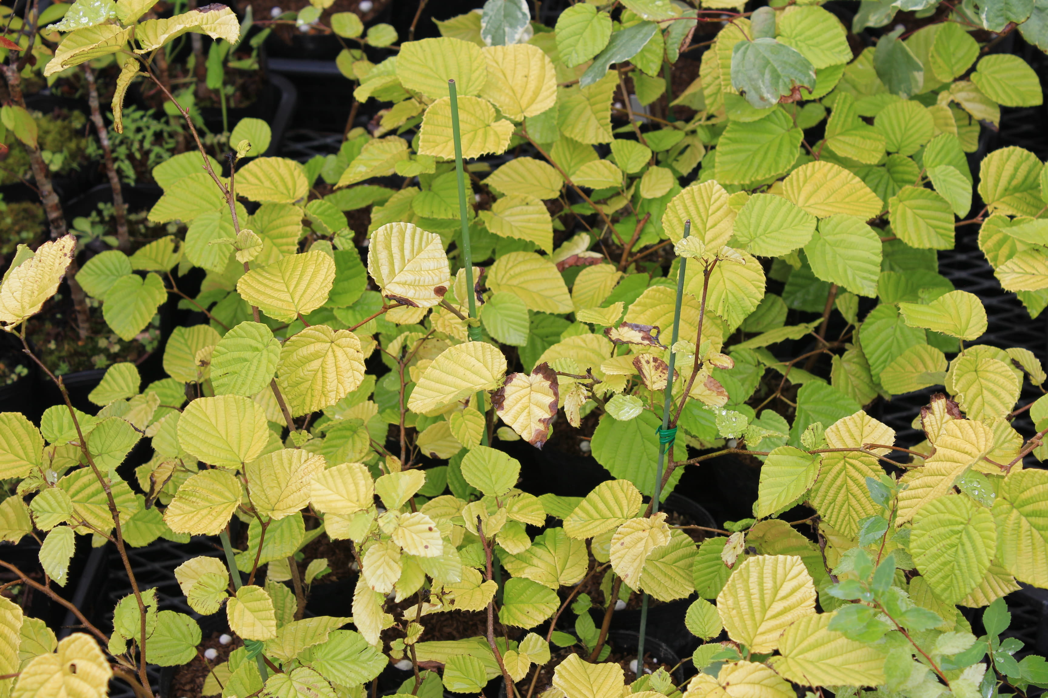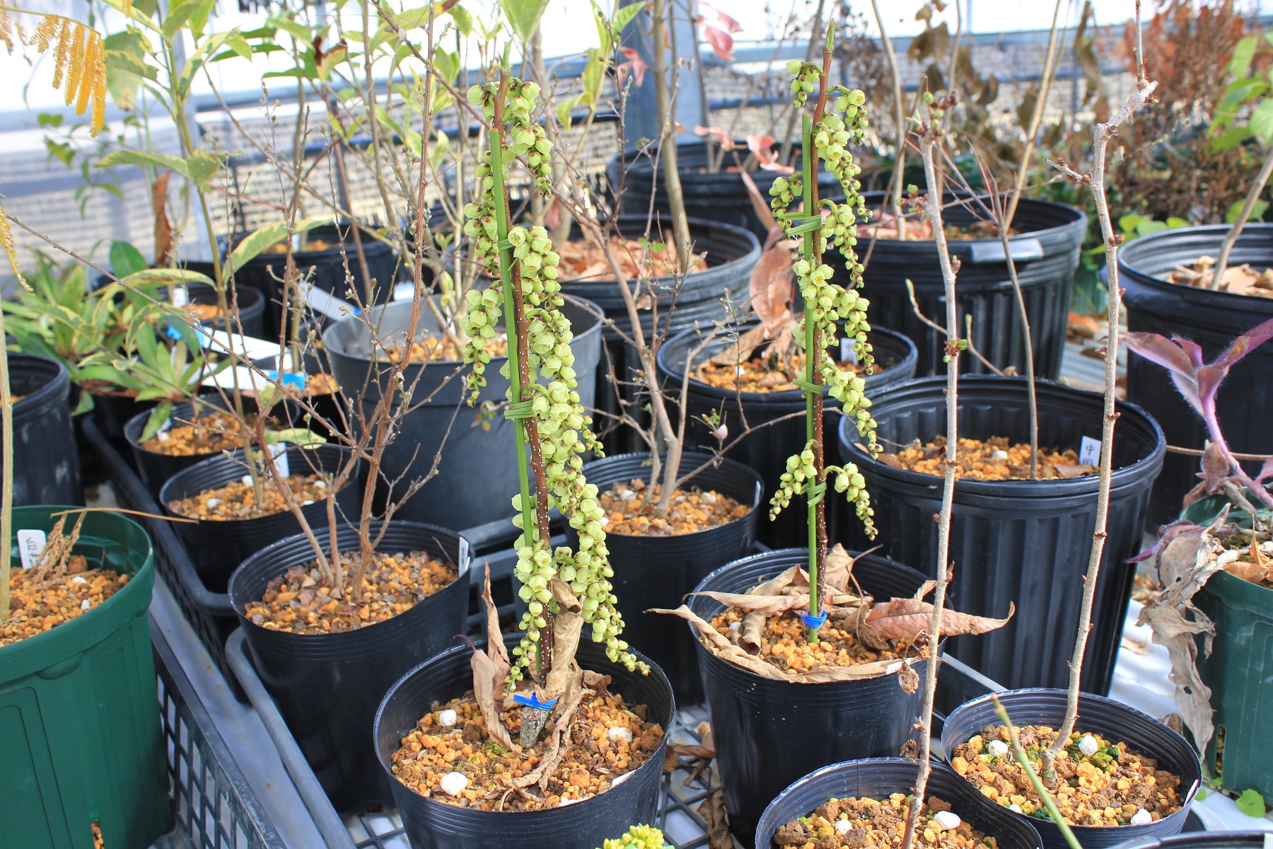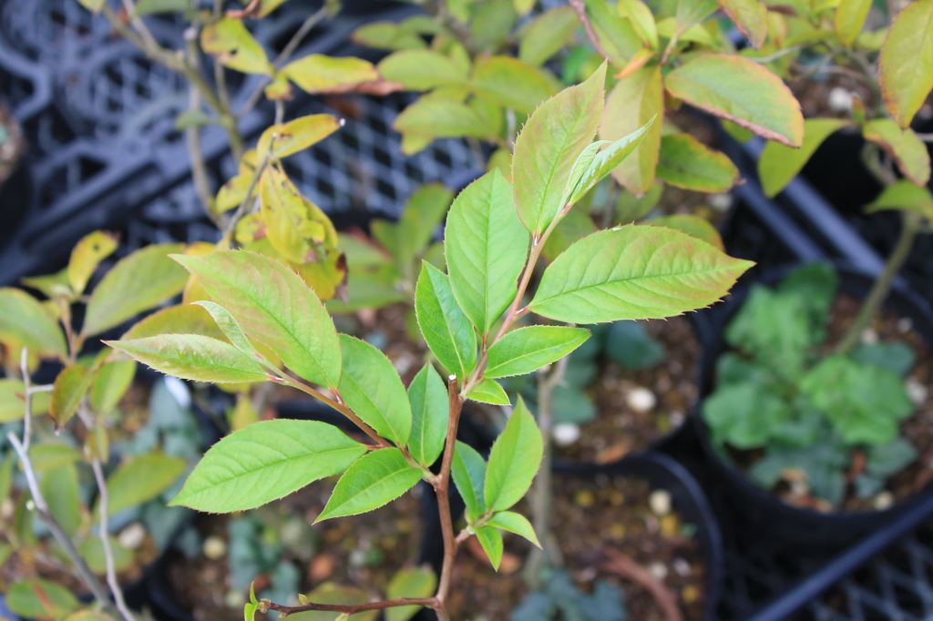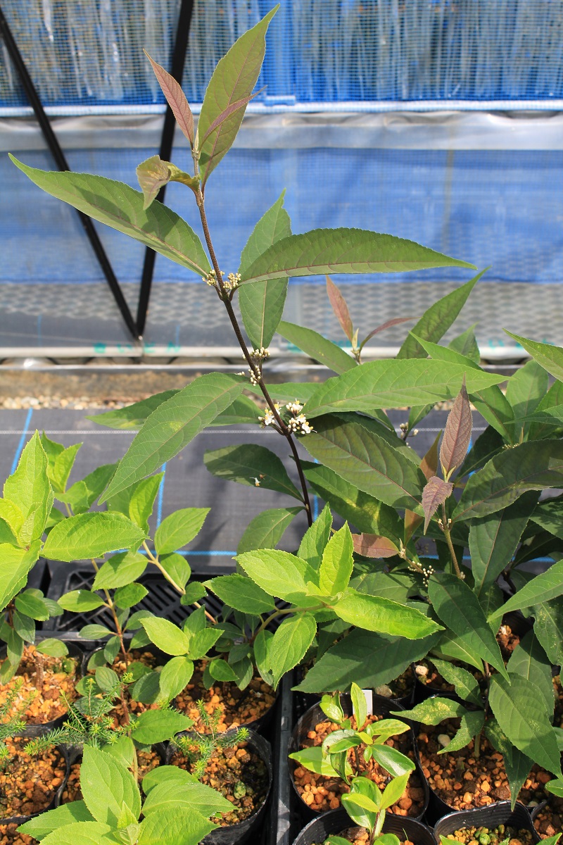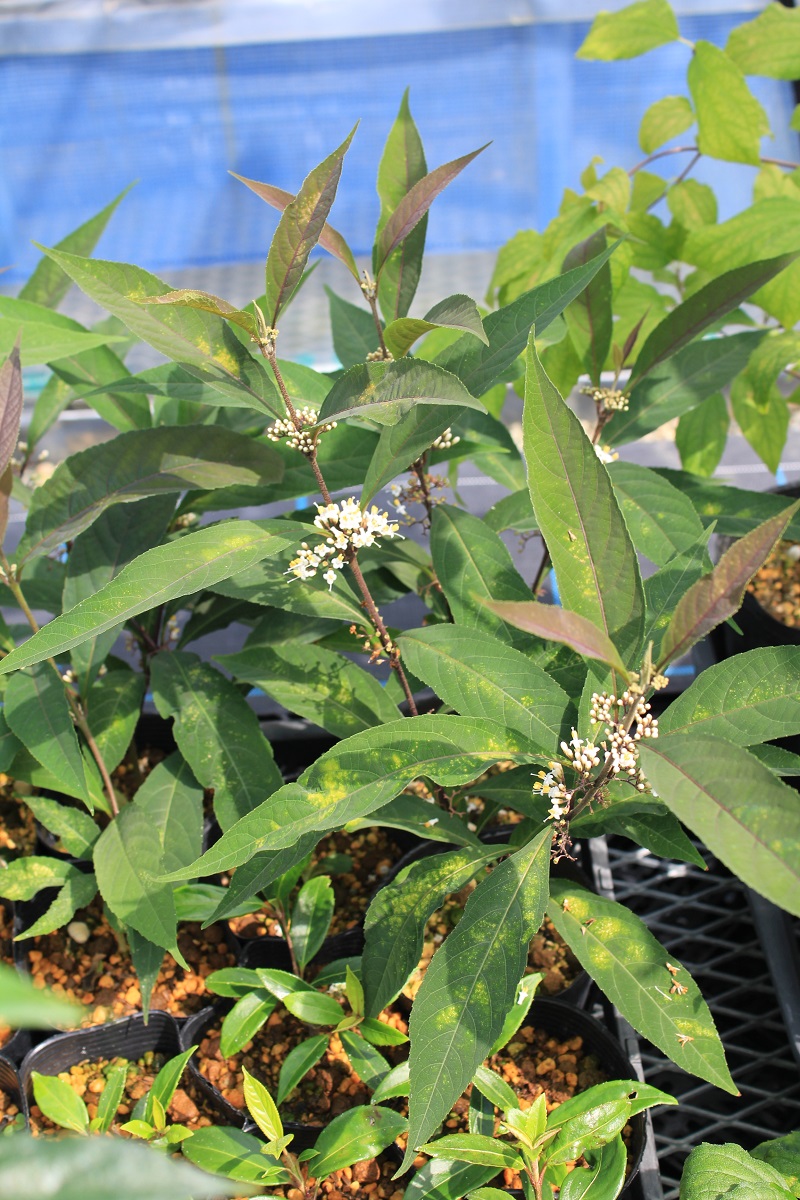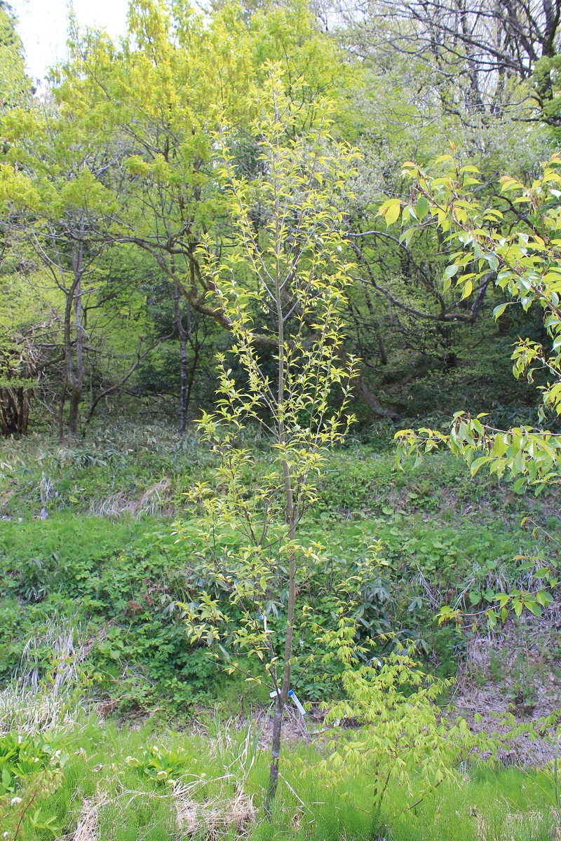 概要:本種は、中国原産で、長楕円形の葉を有するシナミズキの実生選抜品種である。ひとつの穂に花が10~15個つく。葉色が本種の特徴であり、極立った黄色葉はとても素晴らしい。新潟の当地においても丈夫に生育し、鉢物、庭園樹として是非取り入れたい品種である。山口 清重氏 作出。