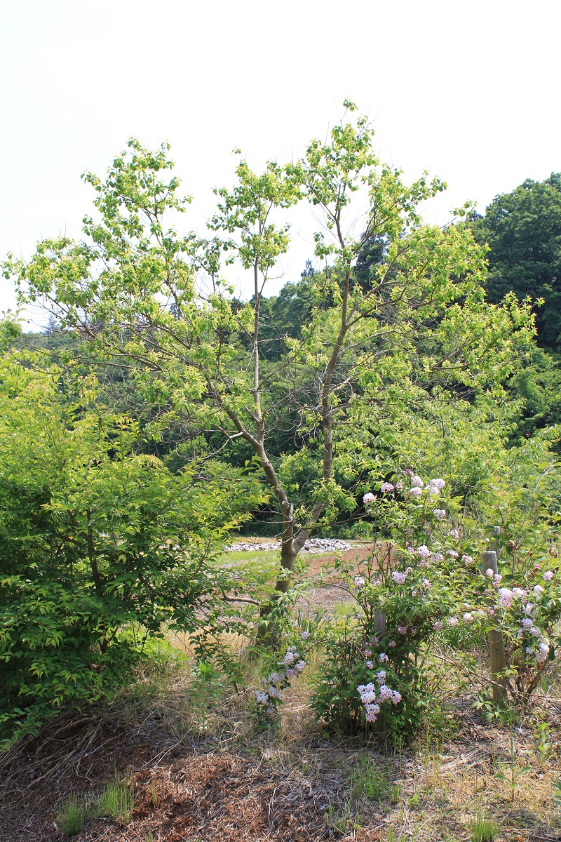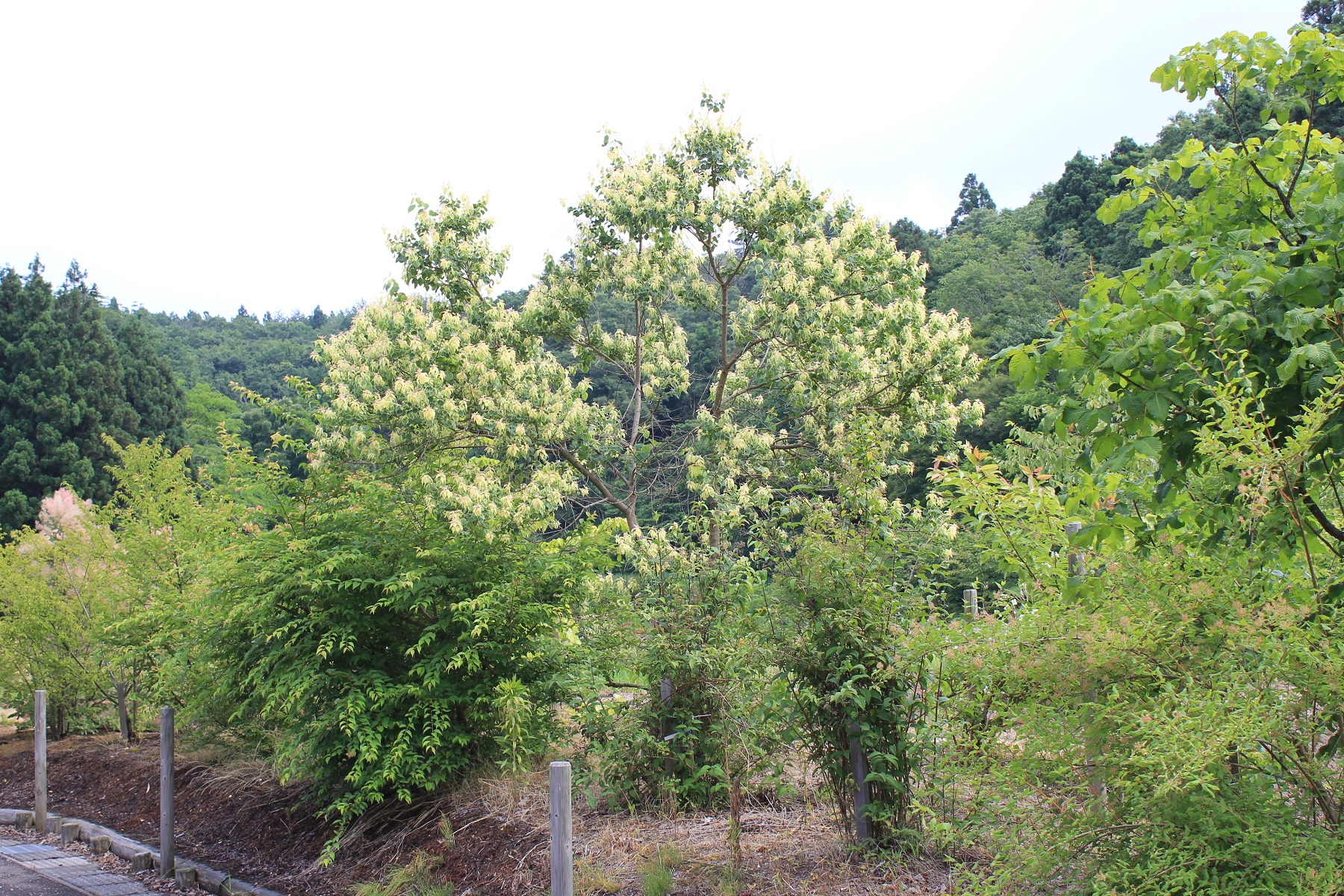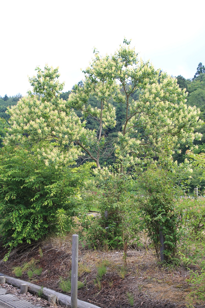 概要:6~7月、枝先や葉腋に長さ6~18cmの総状花序をだし、芳香ある黄色花をつける。雌雄同株。種子表面の白いロウ質から、ロウや油を採る。中国原産。