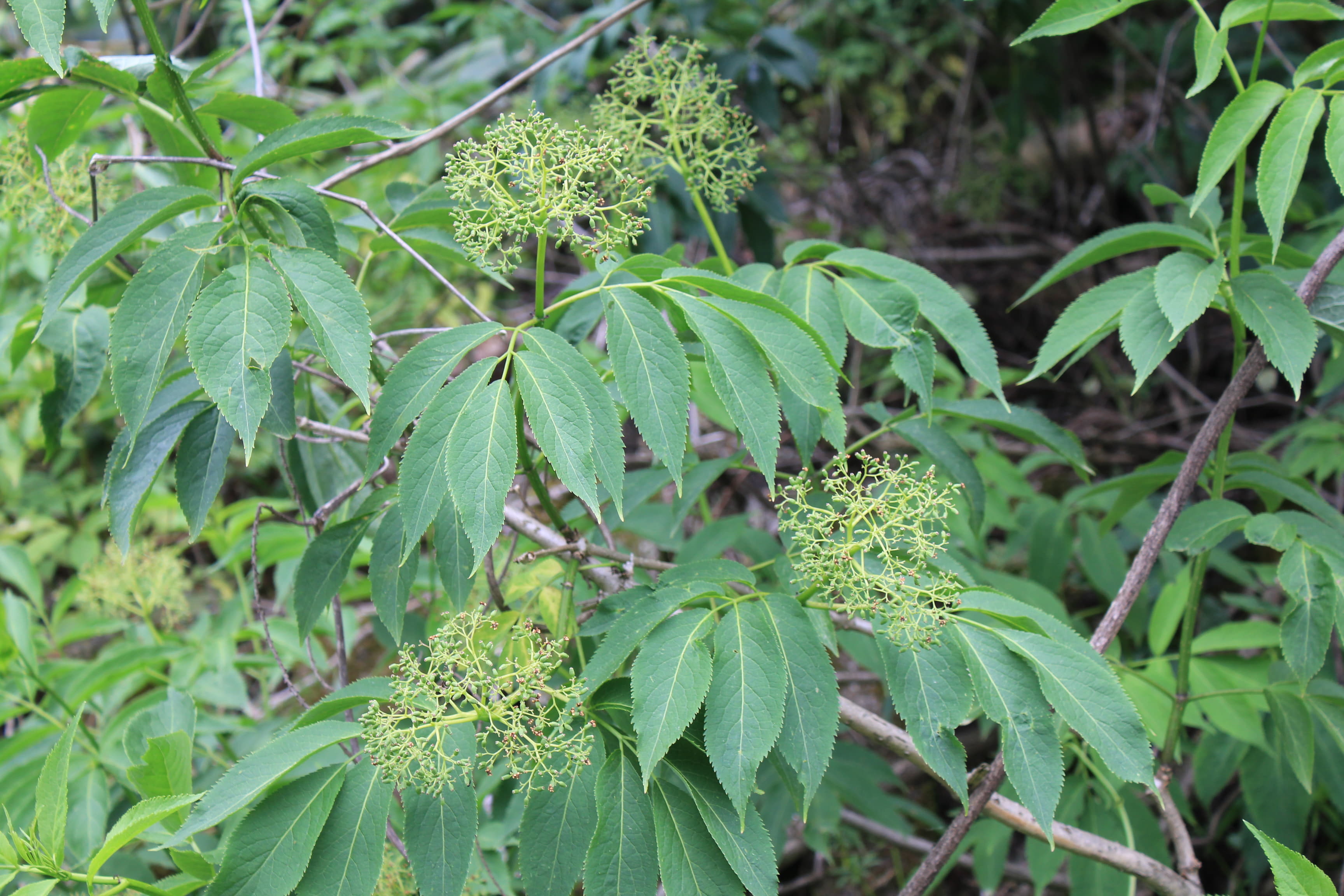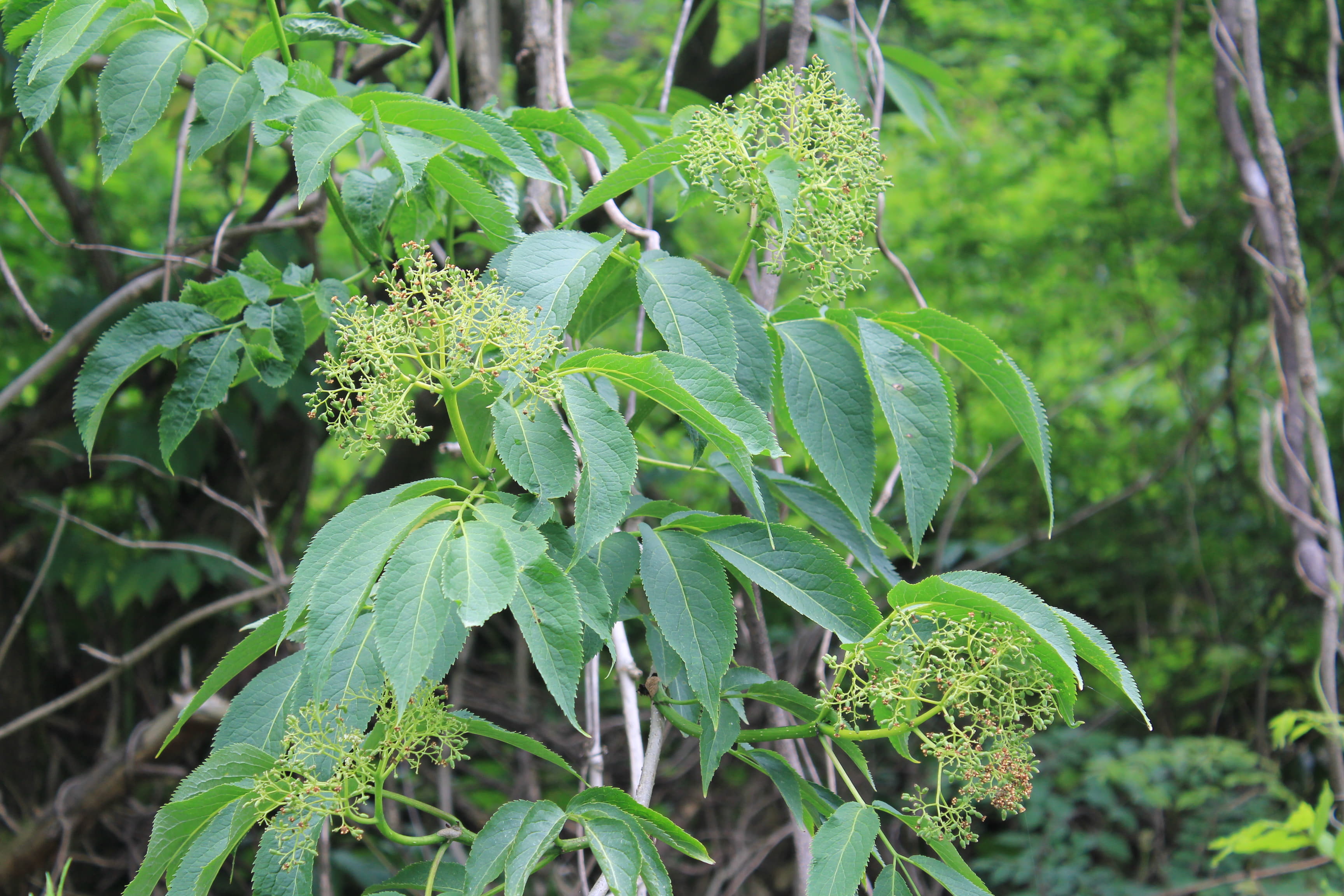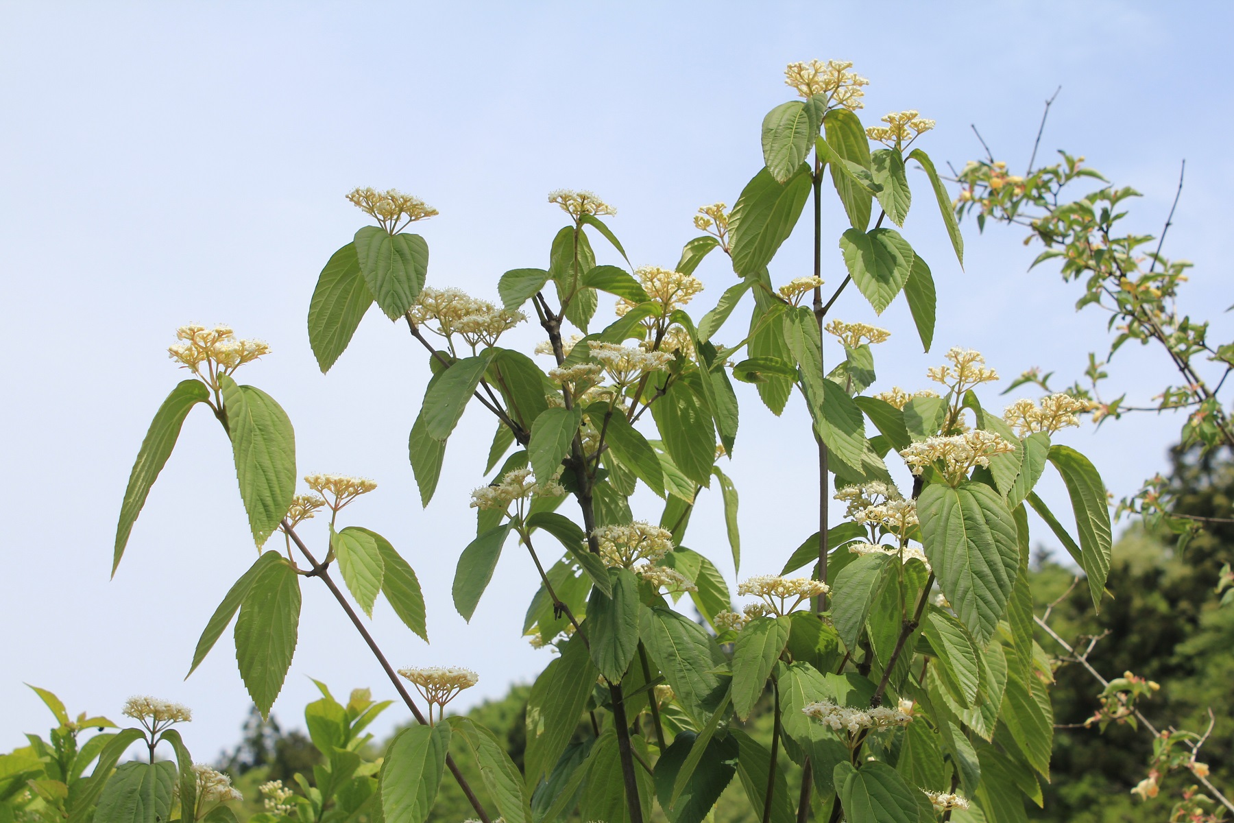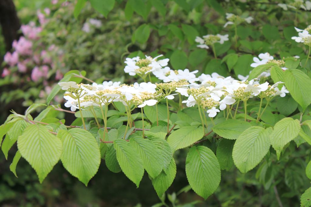 概要:関東以西の山野の山沿や川沿に自生し、高さ2~6mになる。5~6月、枝先に散形花序をだして、直径5~6mmの両性花をつける。その周りを、直径3~4cmの白い装飾花がとり囲む。ガマズミ属の装飾花は、花冠が大きくなったもので、一方、アジサイの装飾花は、ガクが変形して装飾花となっている。果実はあざやかな赤色から黒色に熟していく。