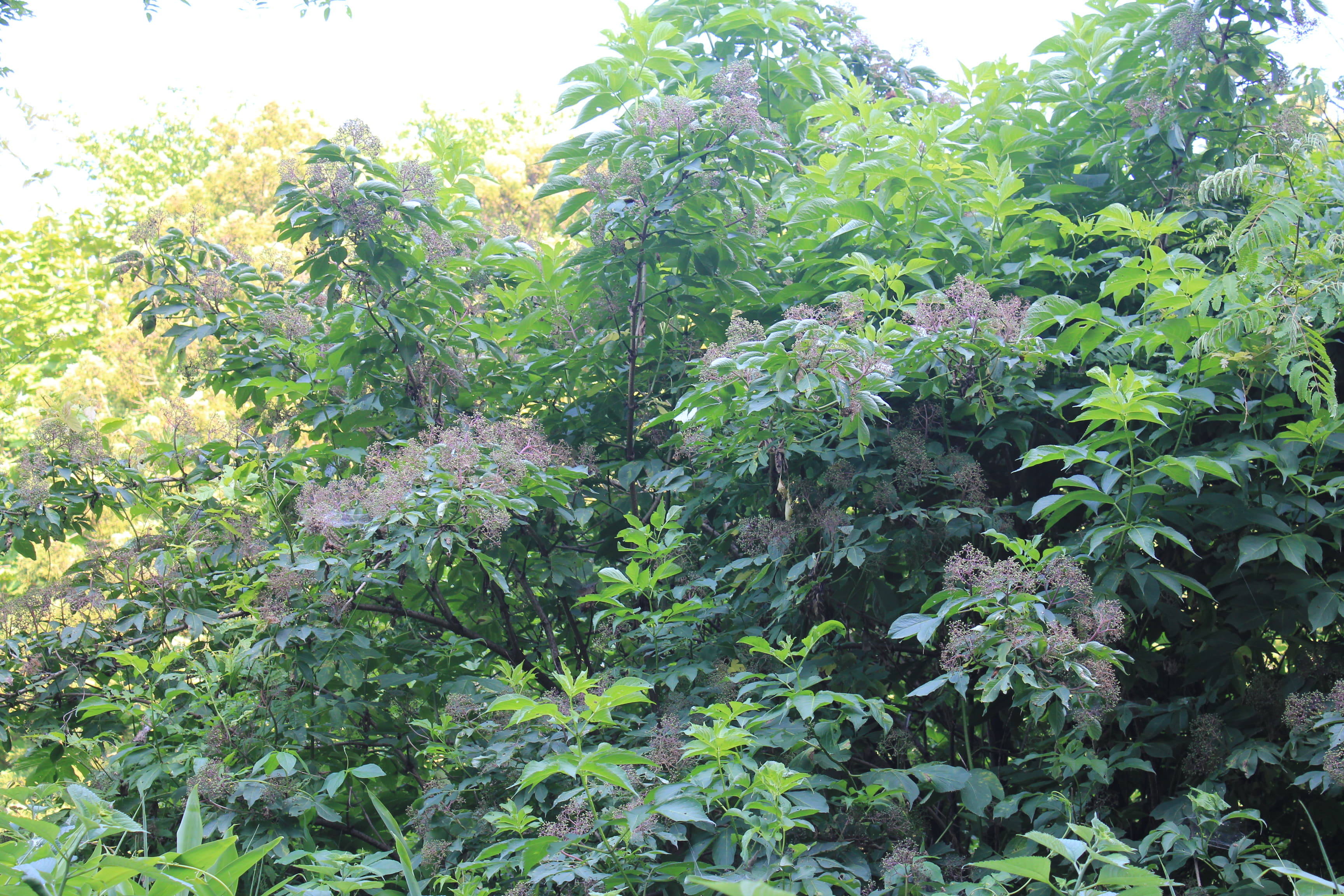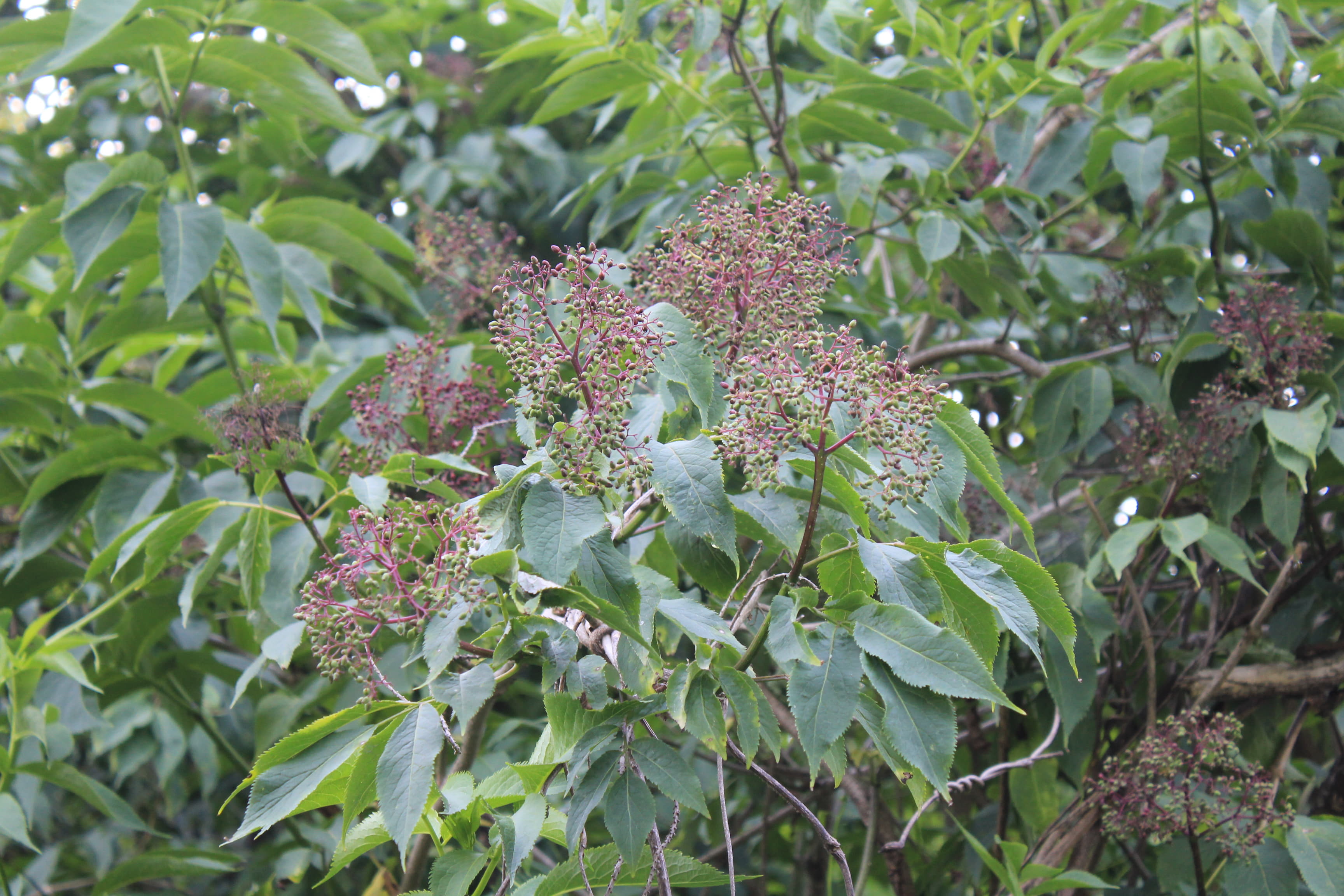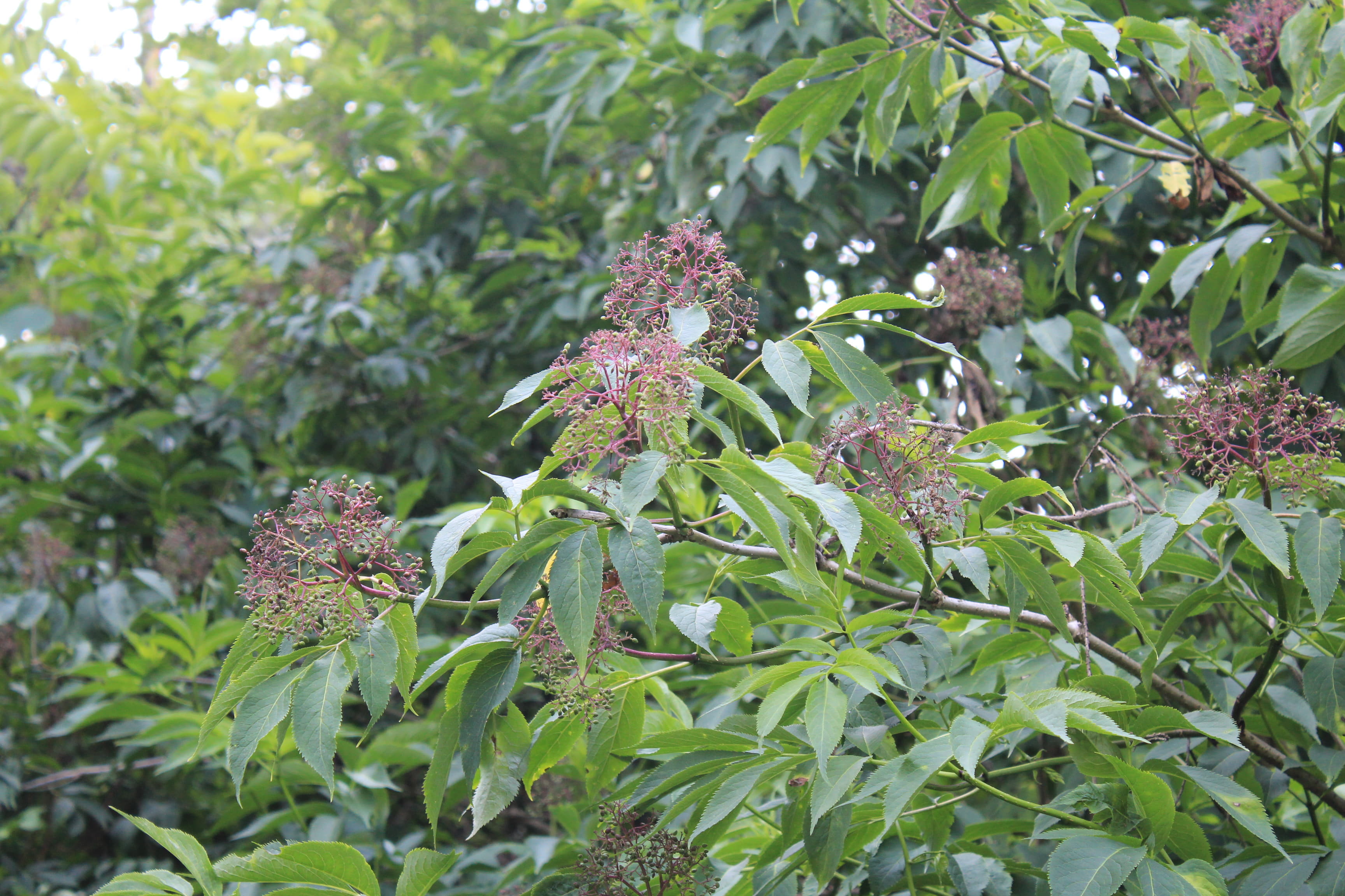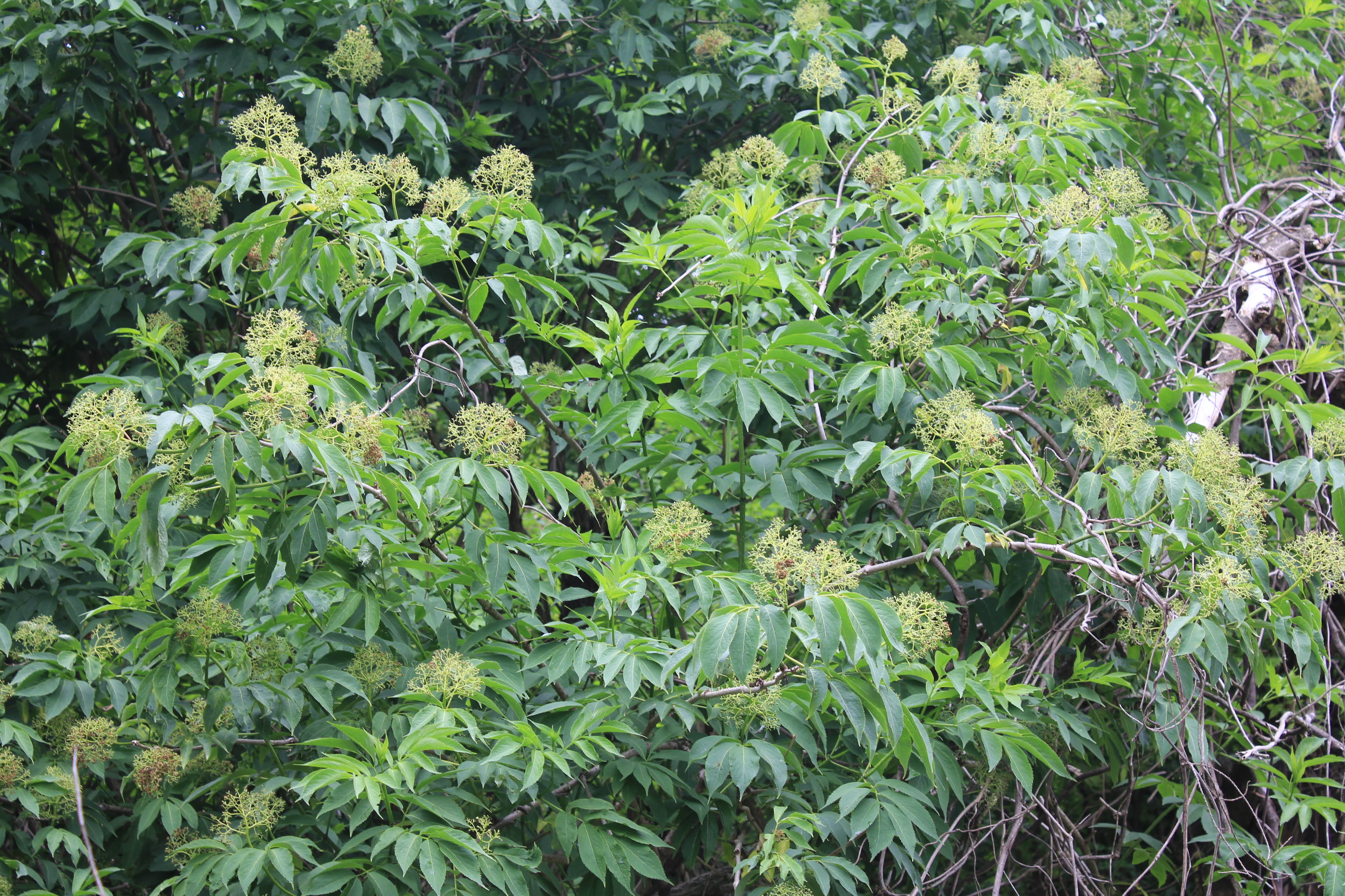 概要:関東以西の山野の山沿や川沿に自生し、高さ2~6mになる。5~6月、枝先に散形花序をだして、直径5~6mmの両性花をつける。その周りを、直径3~4cmの白い装飾花がとり囲む。ガマズミ属の装飾花は、花冠が大きくなったもので、一方、アジサイの装飾花は、ガクが変形して装飾花となっている。果実はあざやかな赤色から黒色に熟していく。
