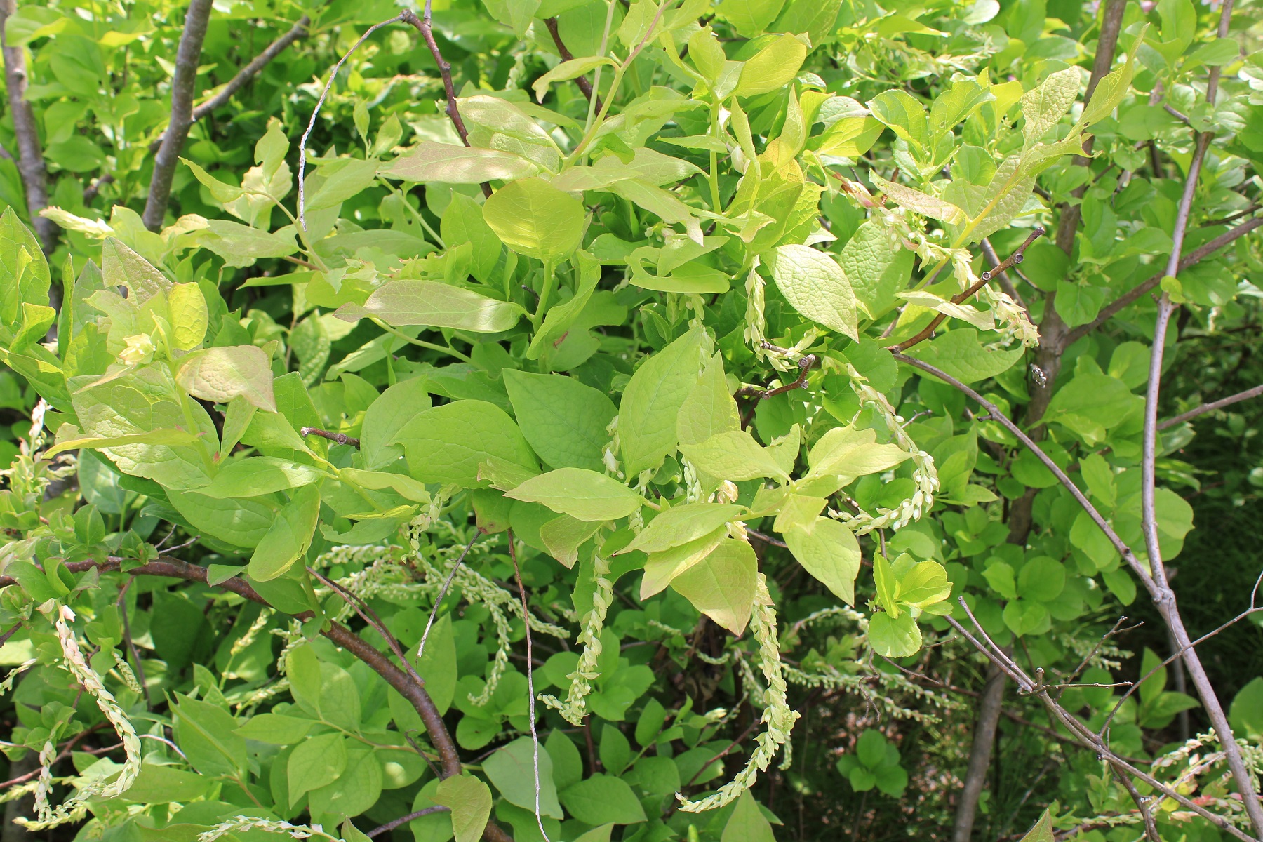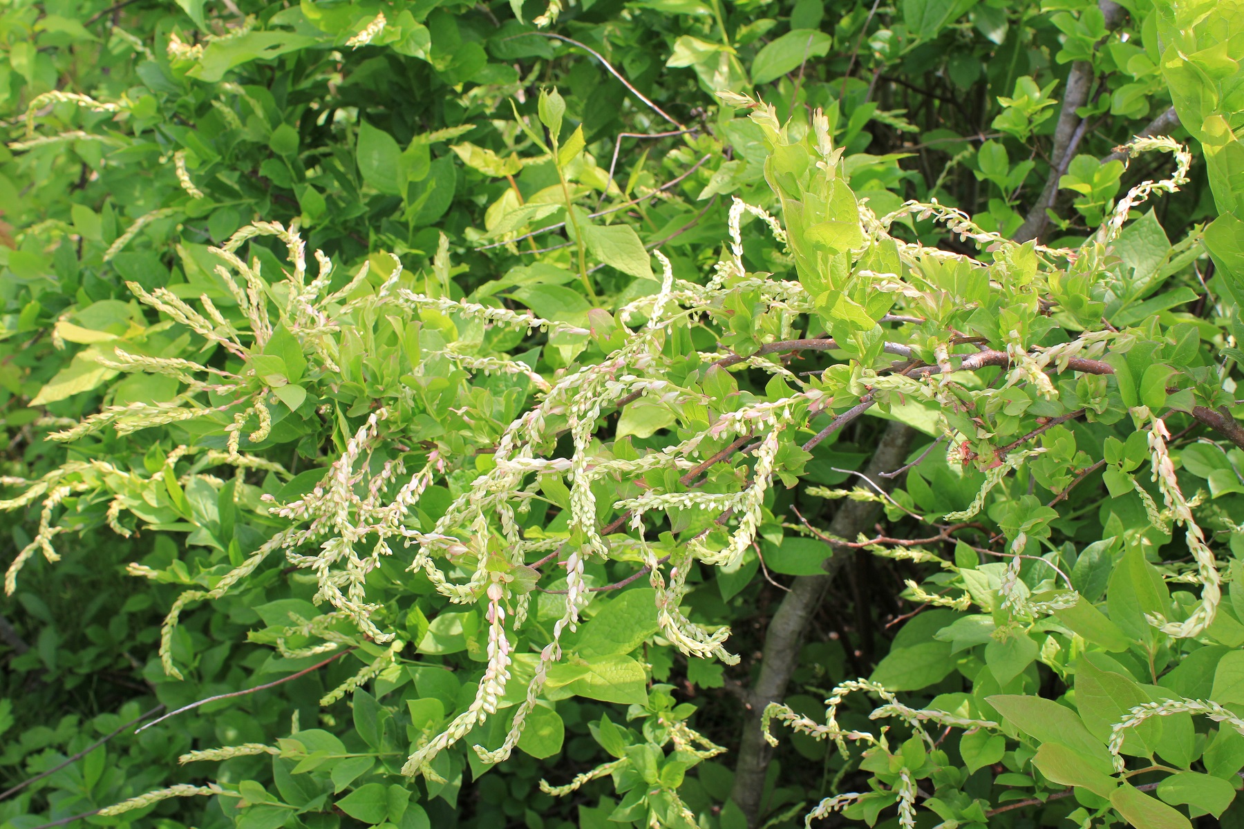 概要:5~6月、本年枝の先に長い総状花をだし、白色花を下向きに開く。液果は球形で黒く熟す。