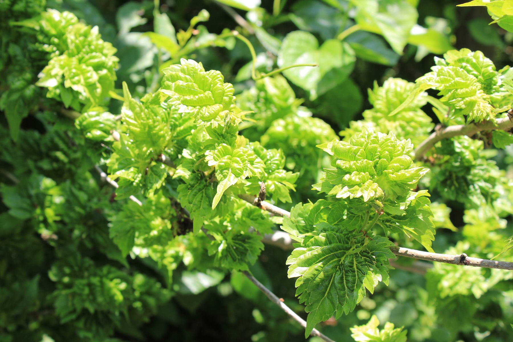 概要:葉の変化に特徴のあるクワの品種。古くからクワの葉は養蚕に用いるが、本種は鑑賞用としての価値が高い。5月開花。7~8月、集合実が赤色から黒色へ熟して食べられる。鉢植え、庭植えに利用する。