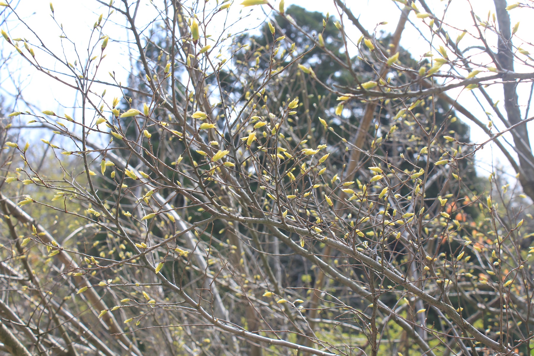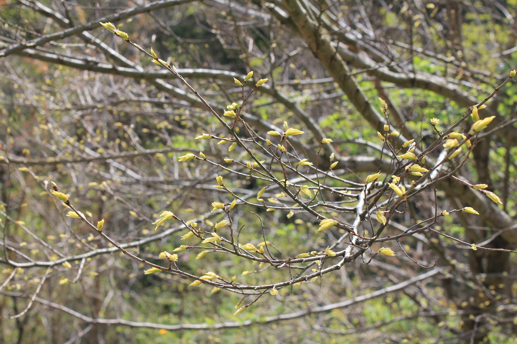 概要:マンサクの変種で、北海道から本州の日本海側に生える寒冷地型植物。葉は互生し、倒卵状円形で、葉先が半円形になる。春早く、葉より先に黄色の花を開く。