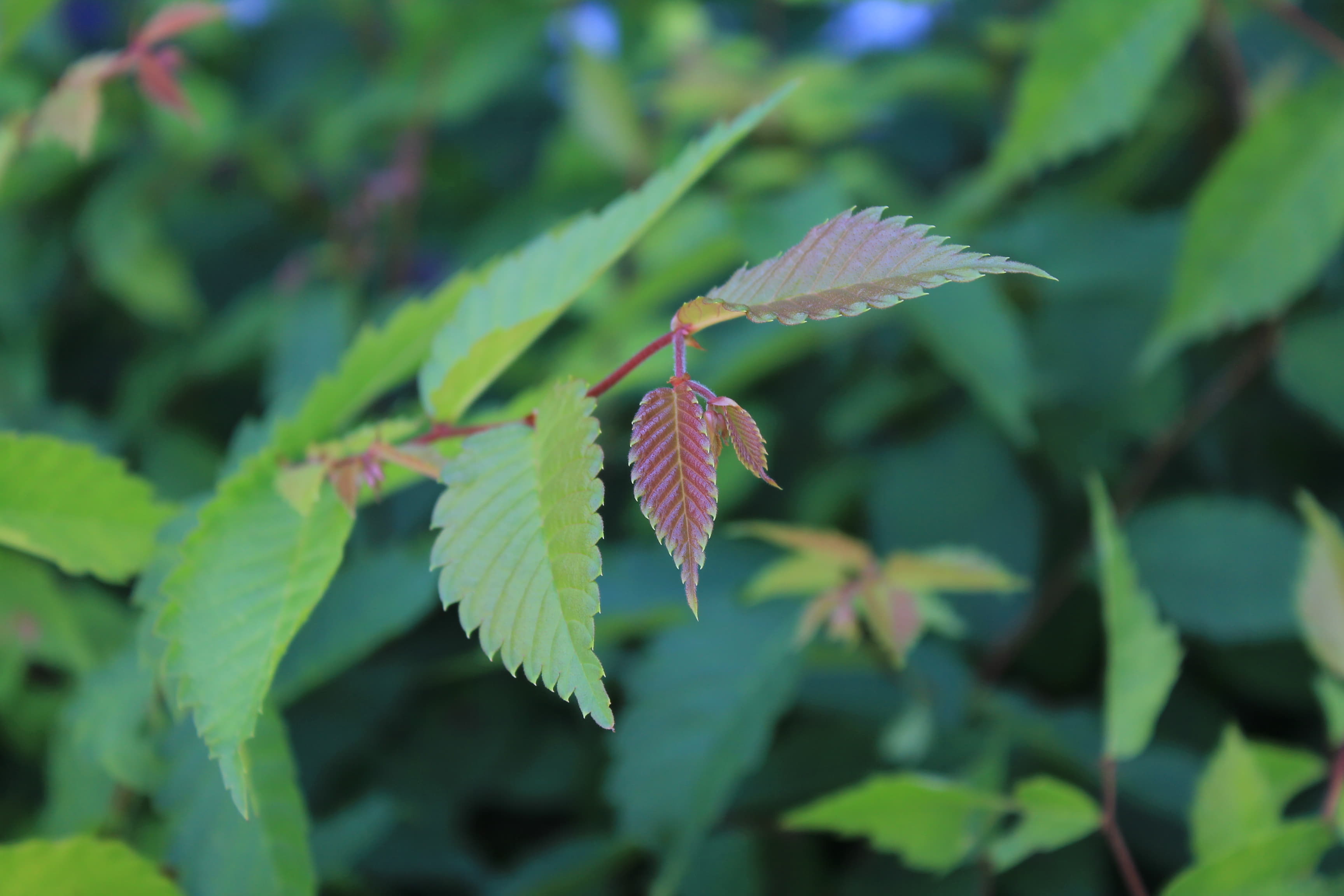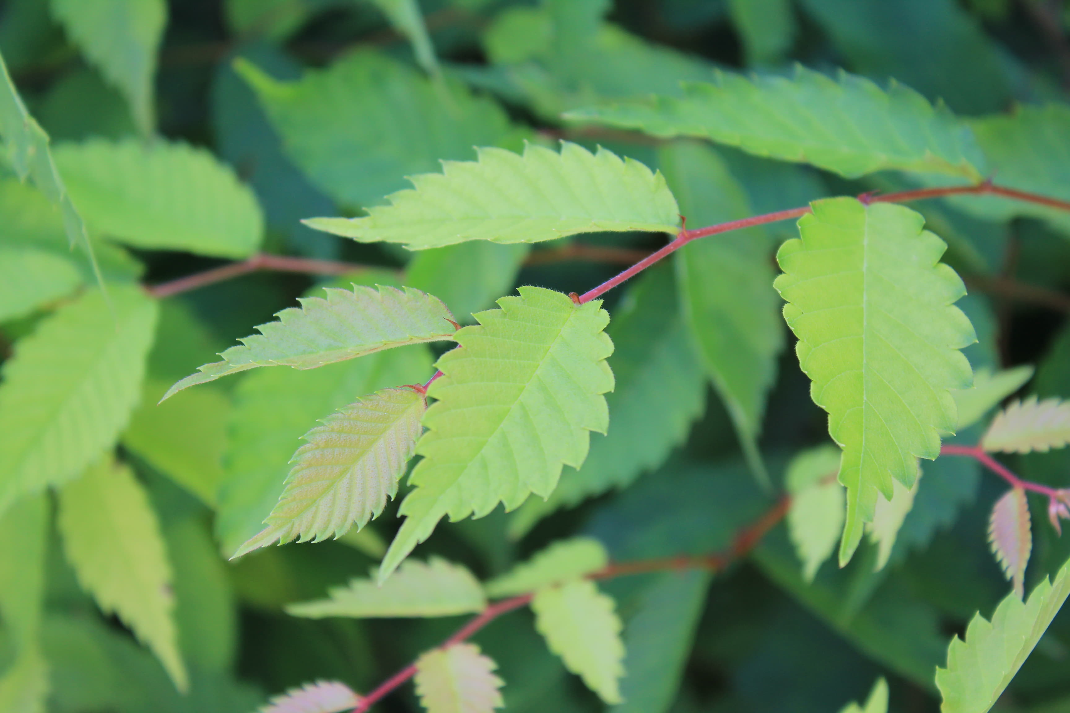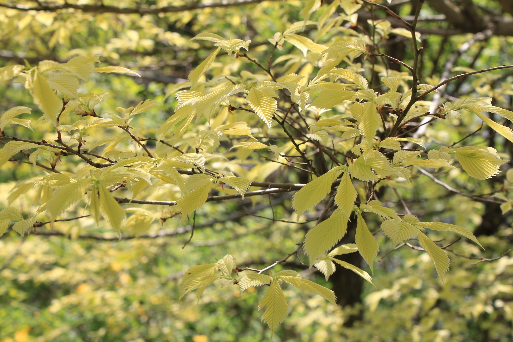 概要:4月、新緑が黄金色で大変美しい。萌芽後の初夏に向かう頃には緑葉となる。葉はケヤキよりもサイズが小さく、表面の波状模様がより鮮明です。ニレ属アキニレUlmus parvifolia(秋に開花、結実)の品種です。