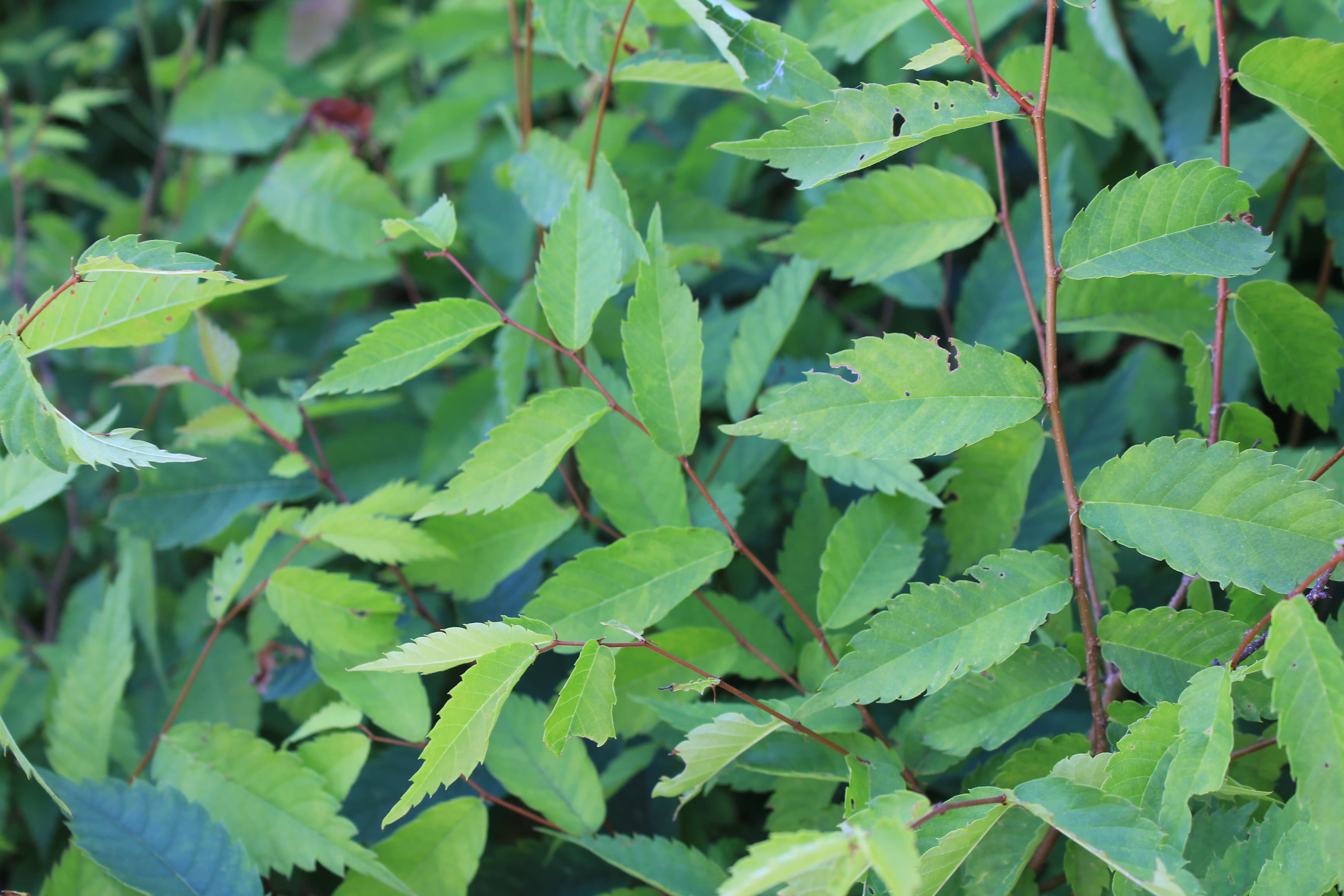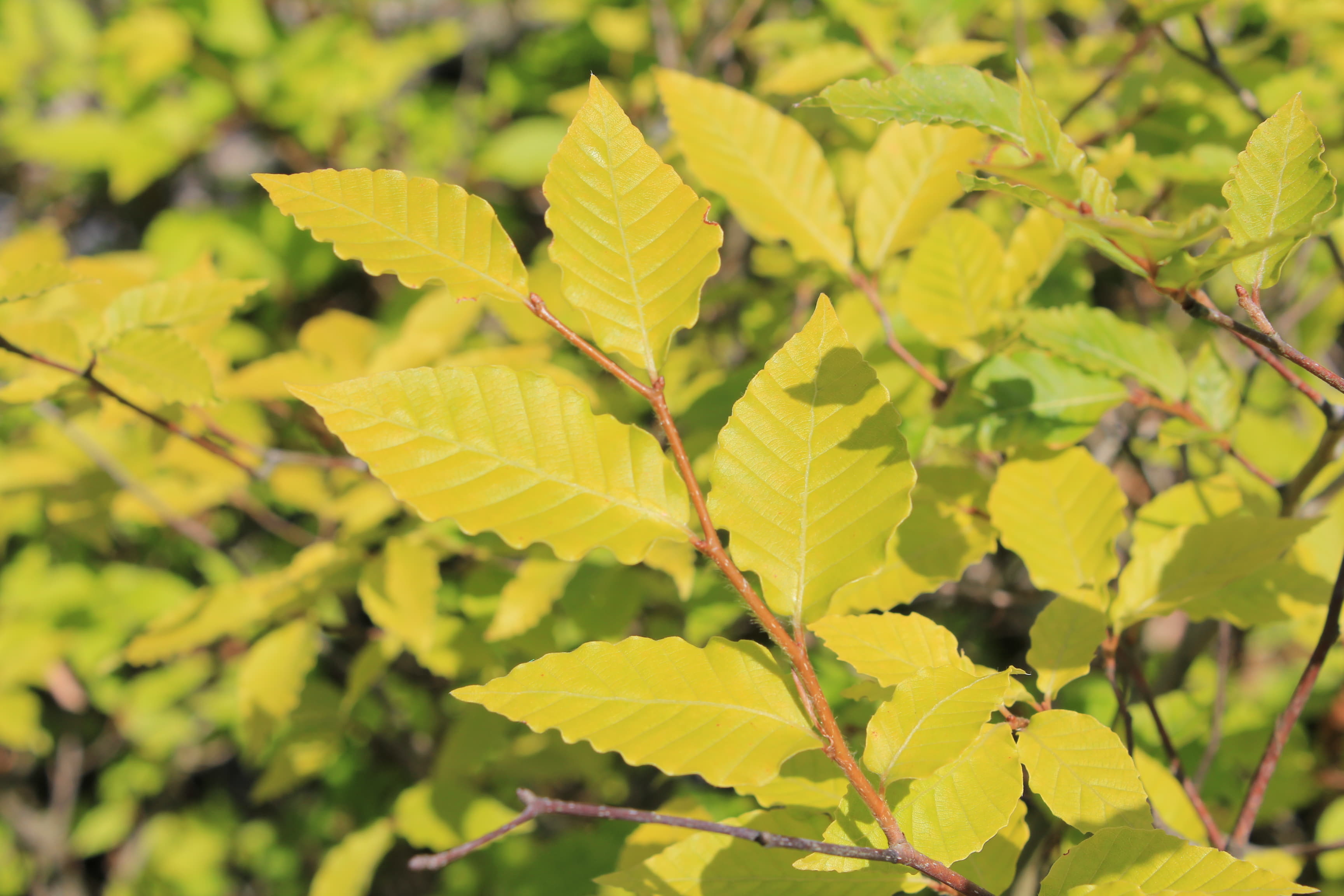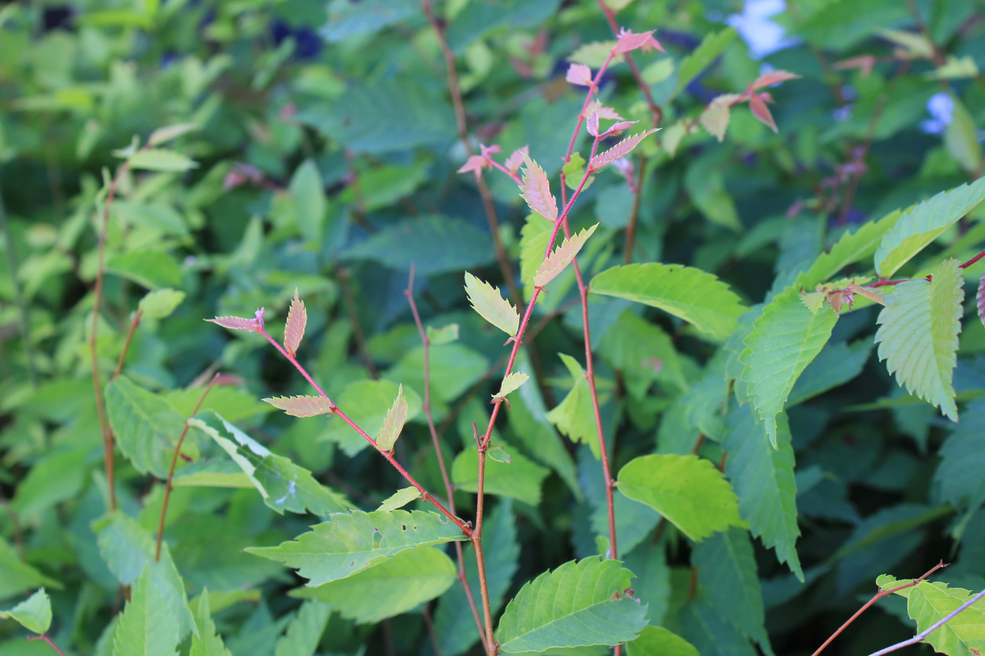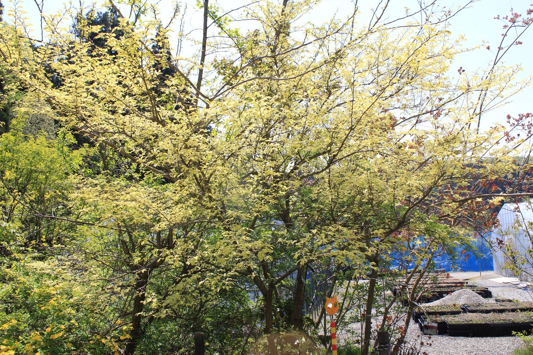 概要:4月、新緑が黄金色で大変美しい。萌芽後の初夏に向かう頃には緑葉となる。葉はケヤキよりもサイズが小さく、表面の波状模様がより鮮明です。ニレ属アキニレUlmus parvifolia(秋に開花、結実)の品種です。