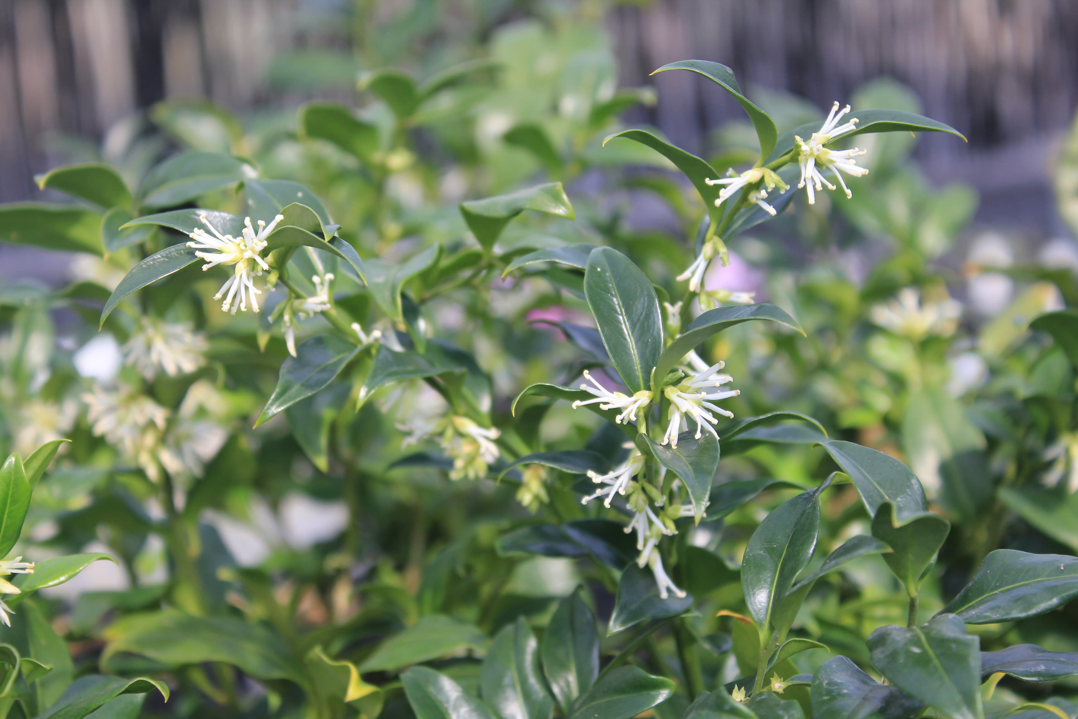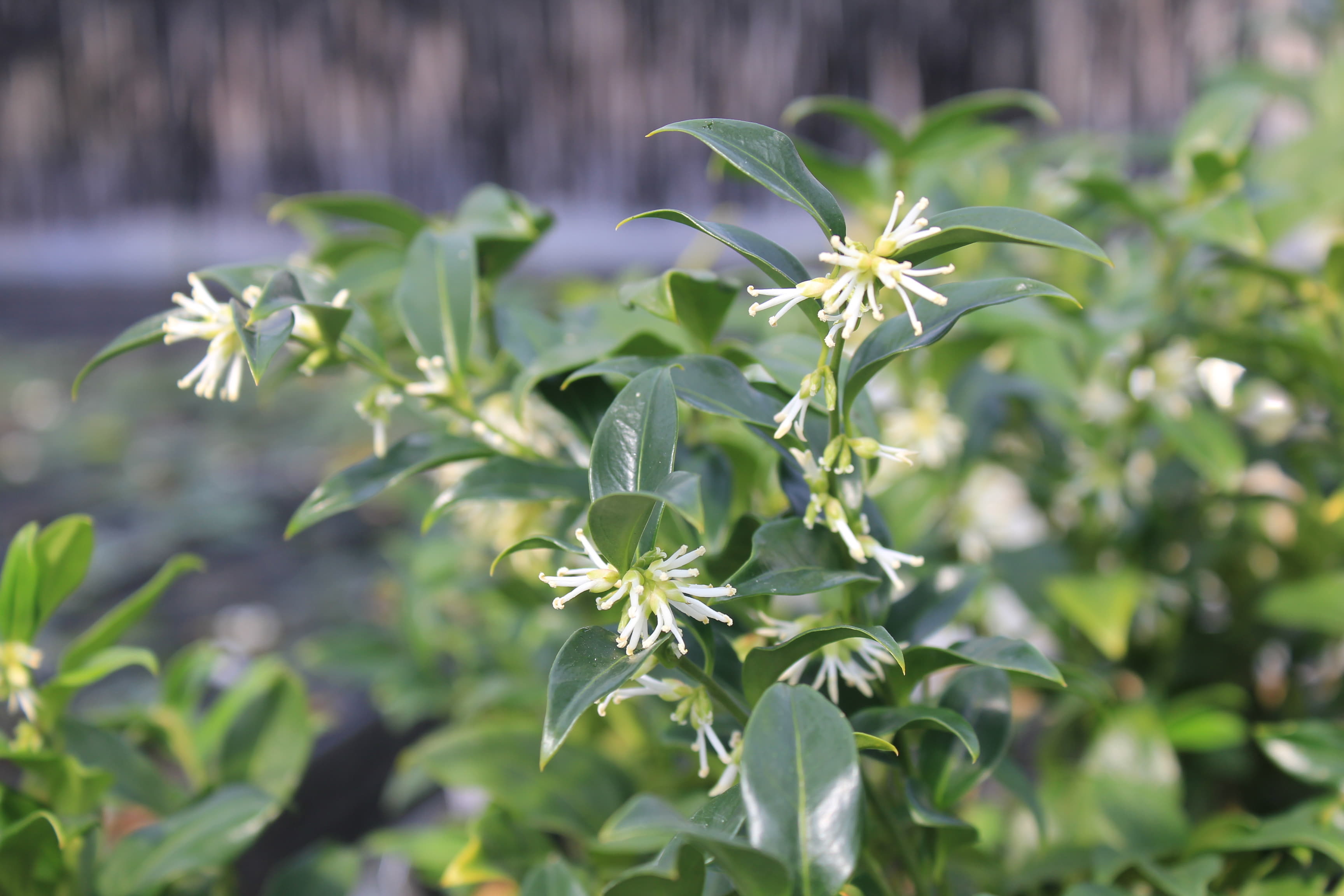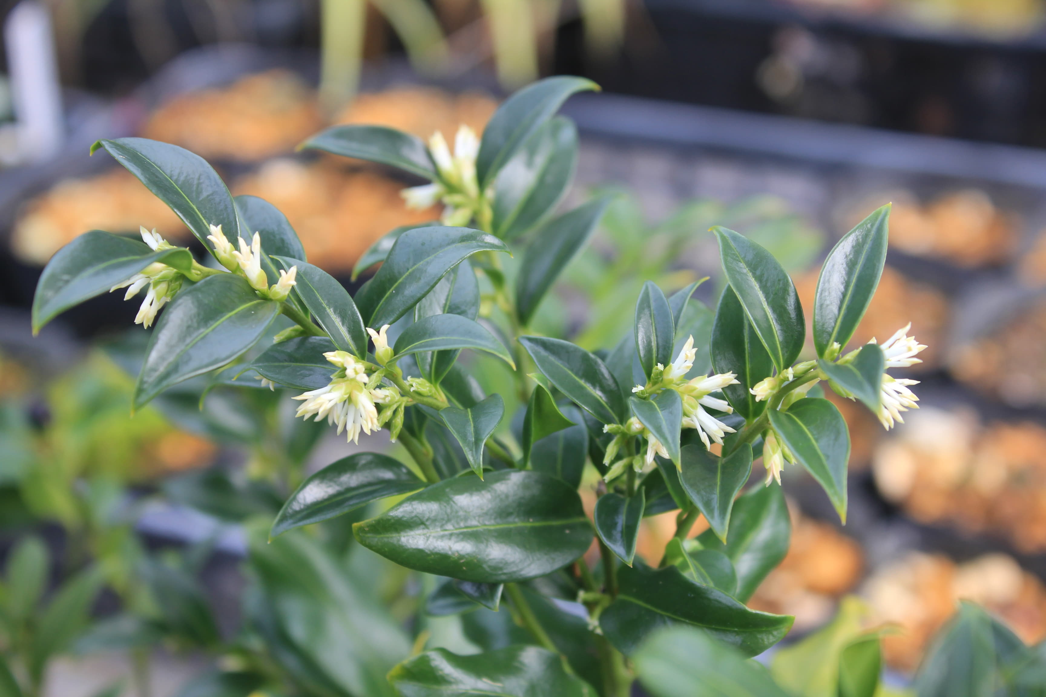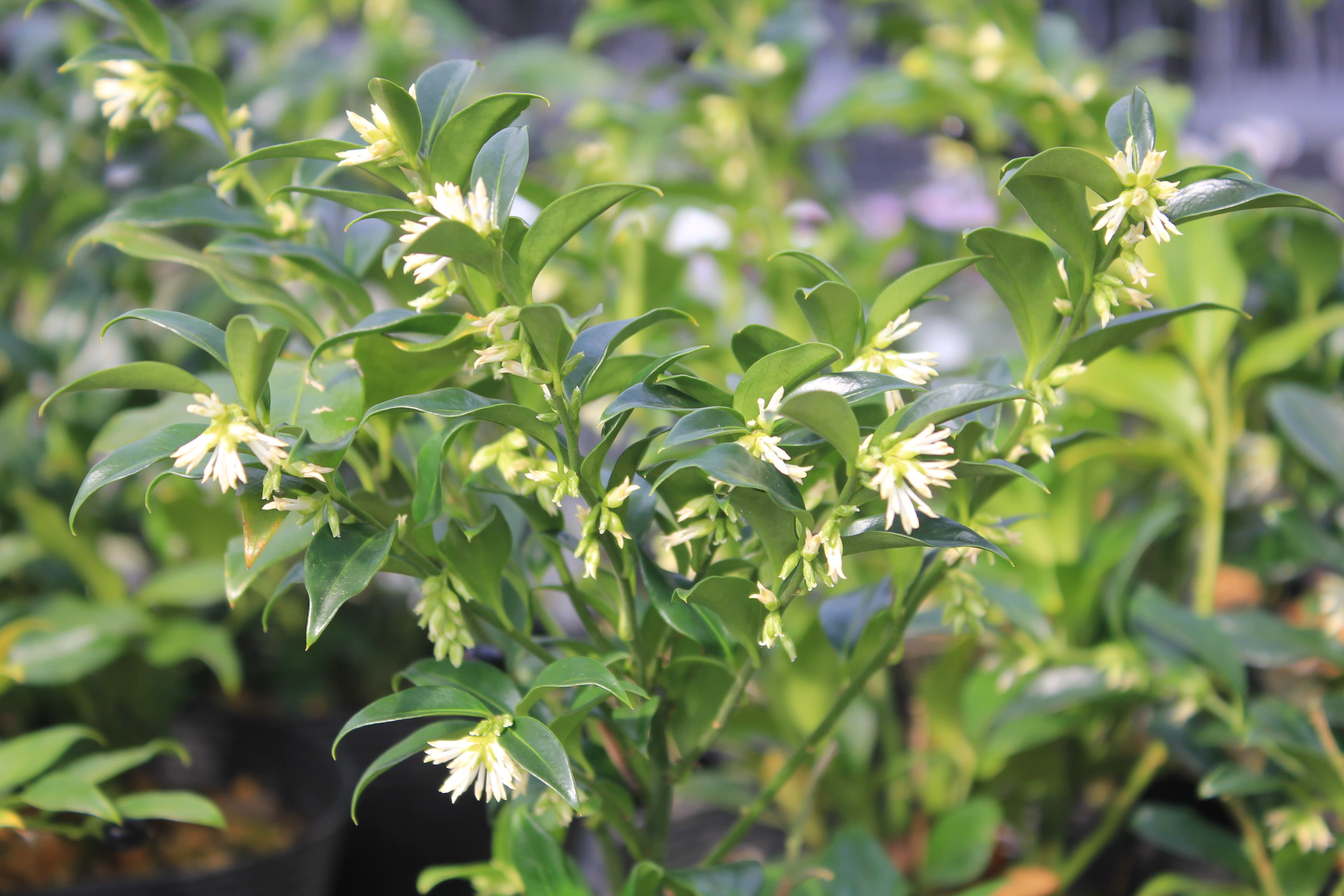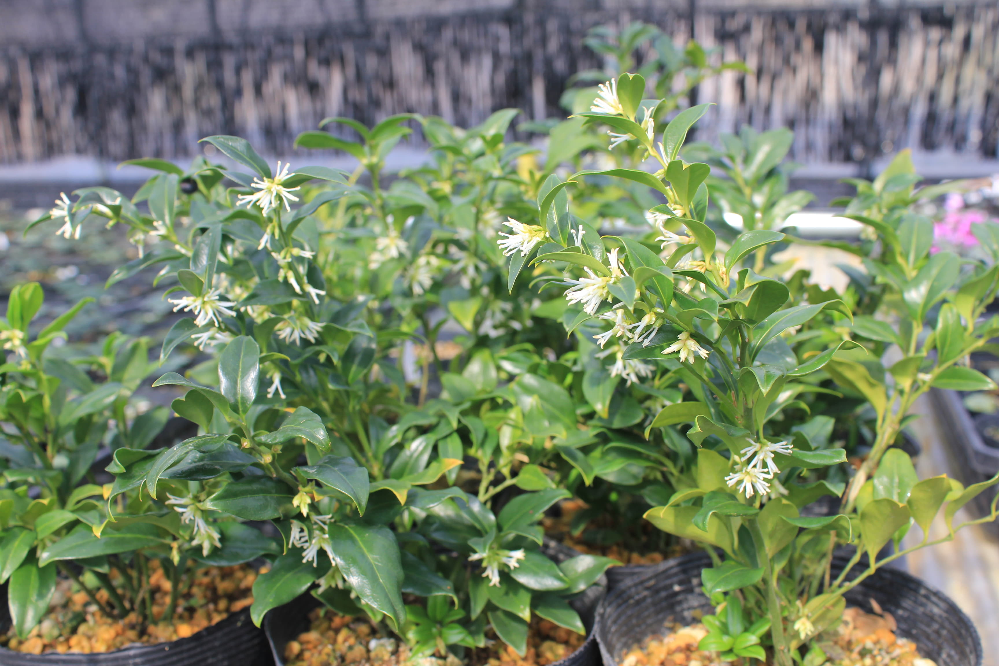 概要:東アジア~南東アジア、およびヒマラヤに自生する、高さ1~2mの常緑低木である。冬期に、乳白色の芳香花を開く。光沢ある美葉も観賞価値がある。雌雄同株。