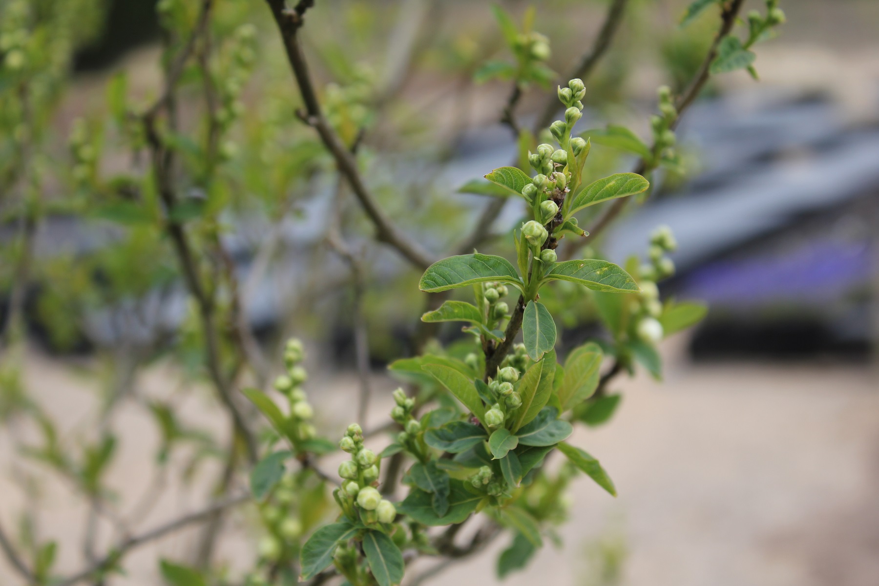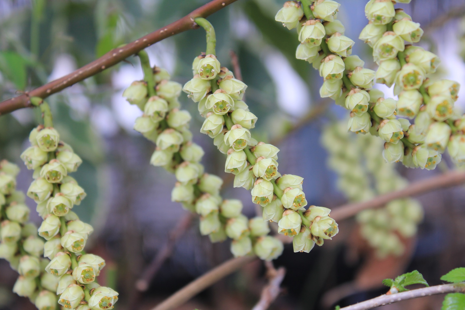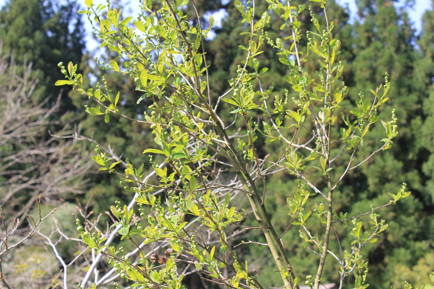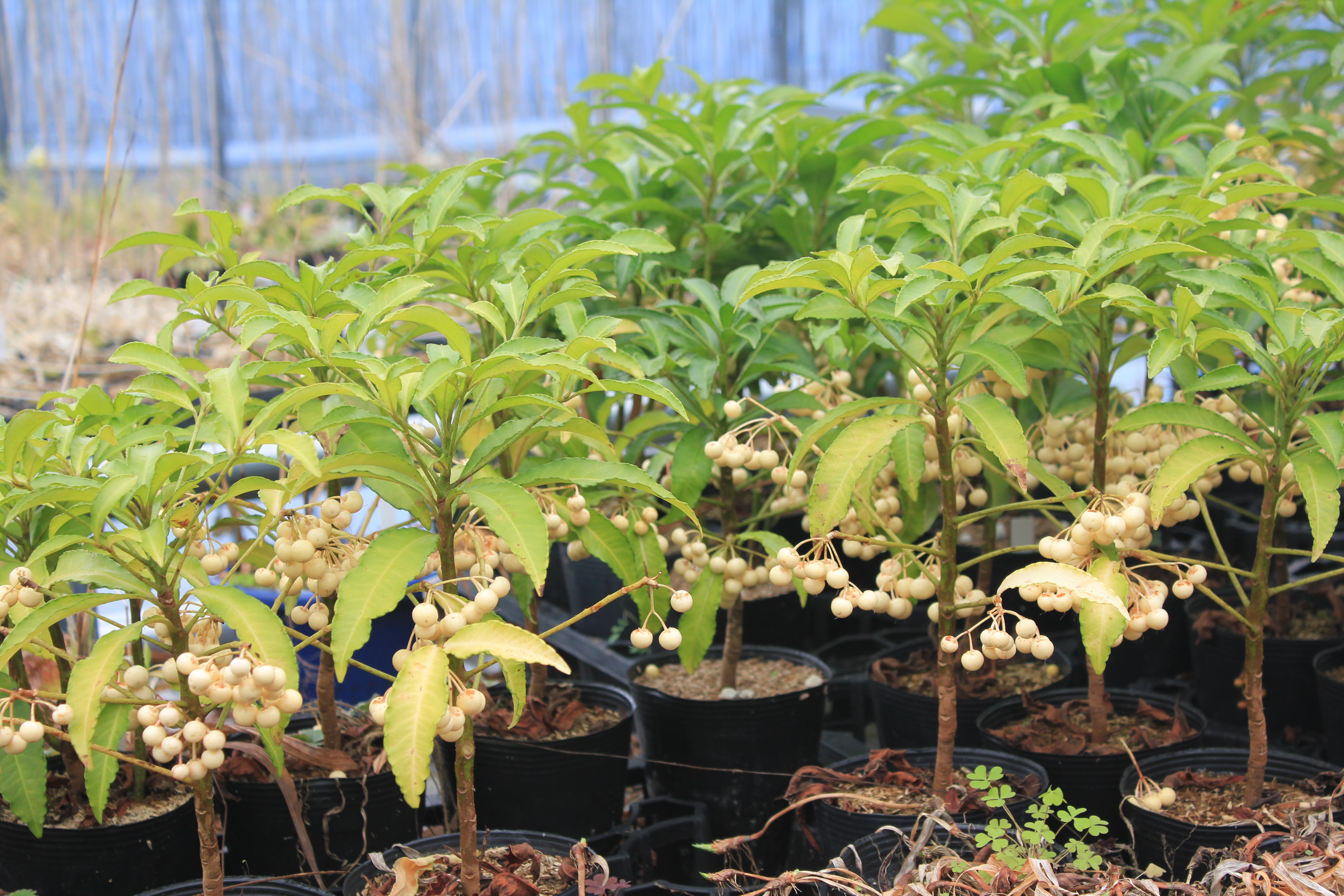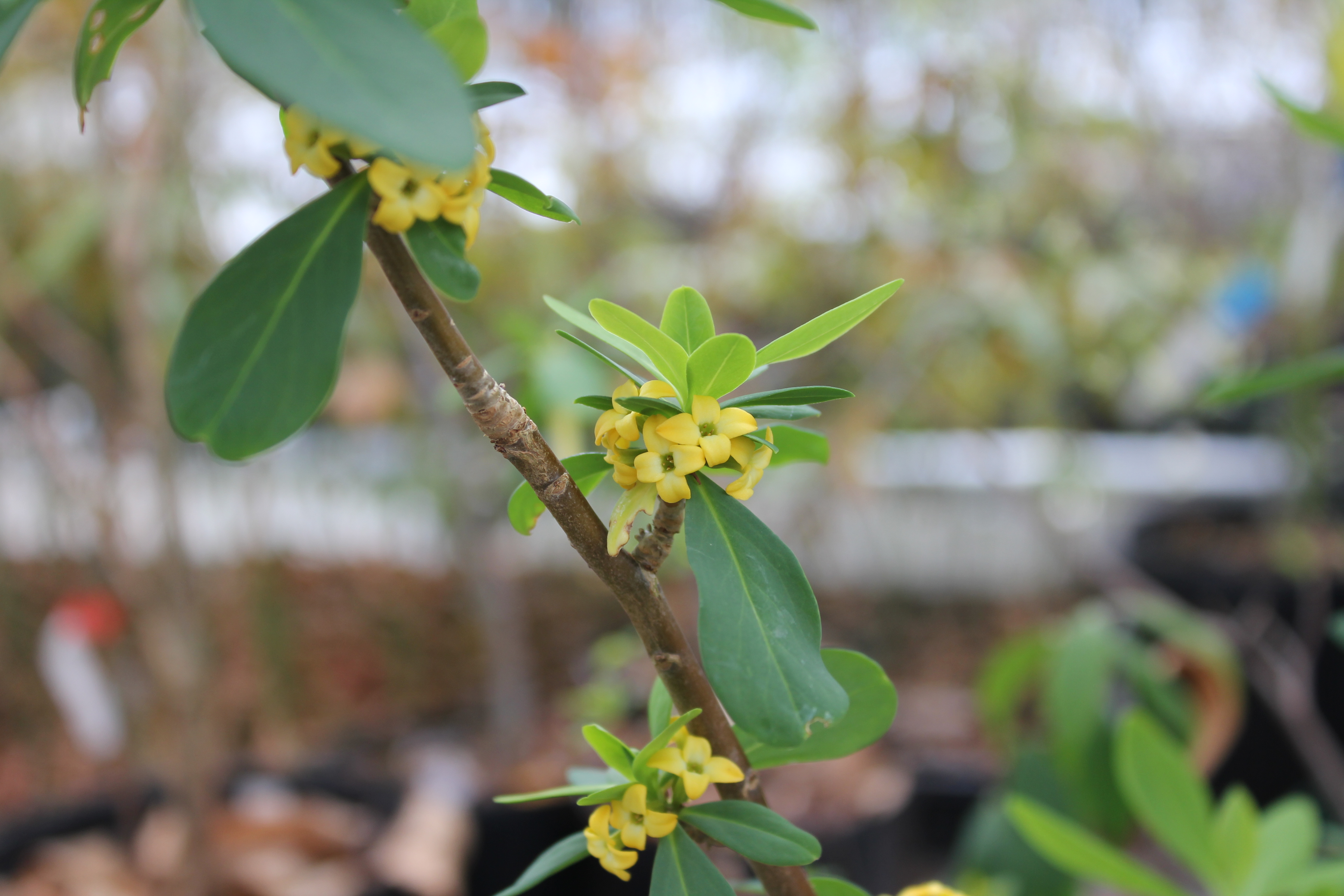 概要:東アジア~南東アジア、およびヒマラヤに自生する、高さ1~2mの常緑低木である。冬期に、乳白色の芳香花を開く。光沢ある美葉も観賞価値がある。雌雄同株。