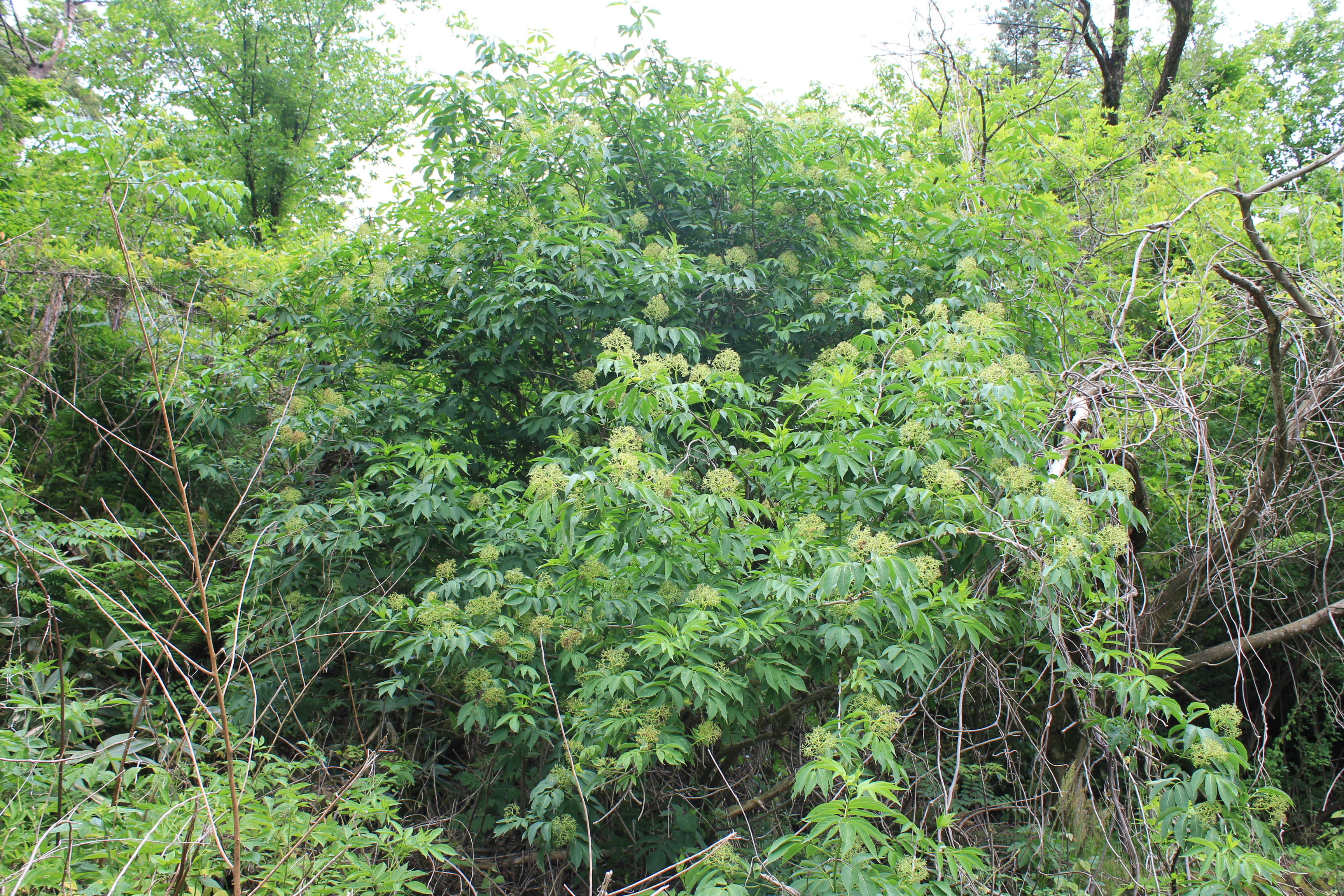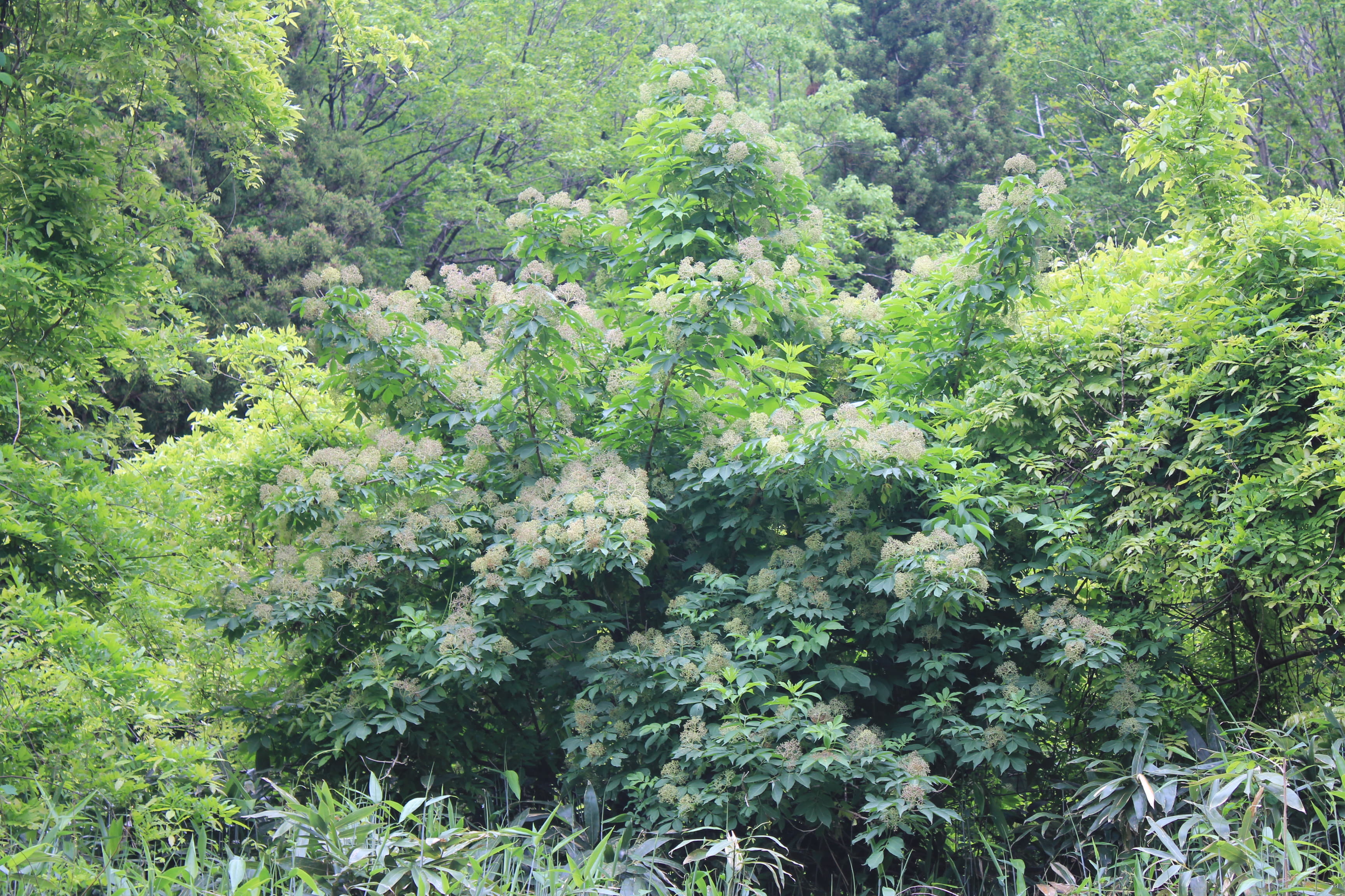 概要:山地に自生するが、庭木としてよく植栽される。葉は、3回3出複葉で、互生する。5~6月に大きな円錐花序をだして、白色花をつける。11~12月、直径6~7mmほどの赤い果実をつける。せき止めの薬として利用される。分布は、本州(茨城県以西)、四国、九州、中国、インドである。秋の紅葉は美しいので、庭木に是非取り入れたい植物である。