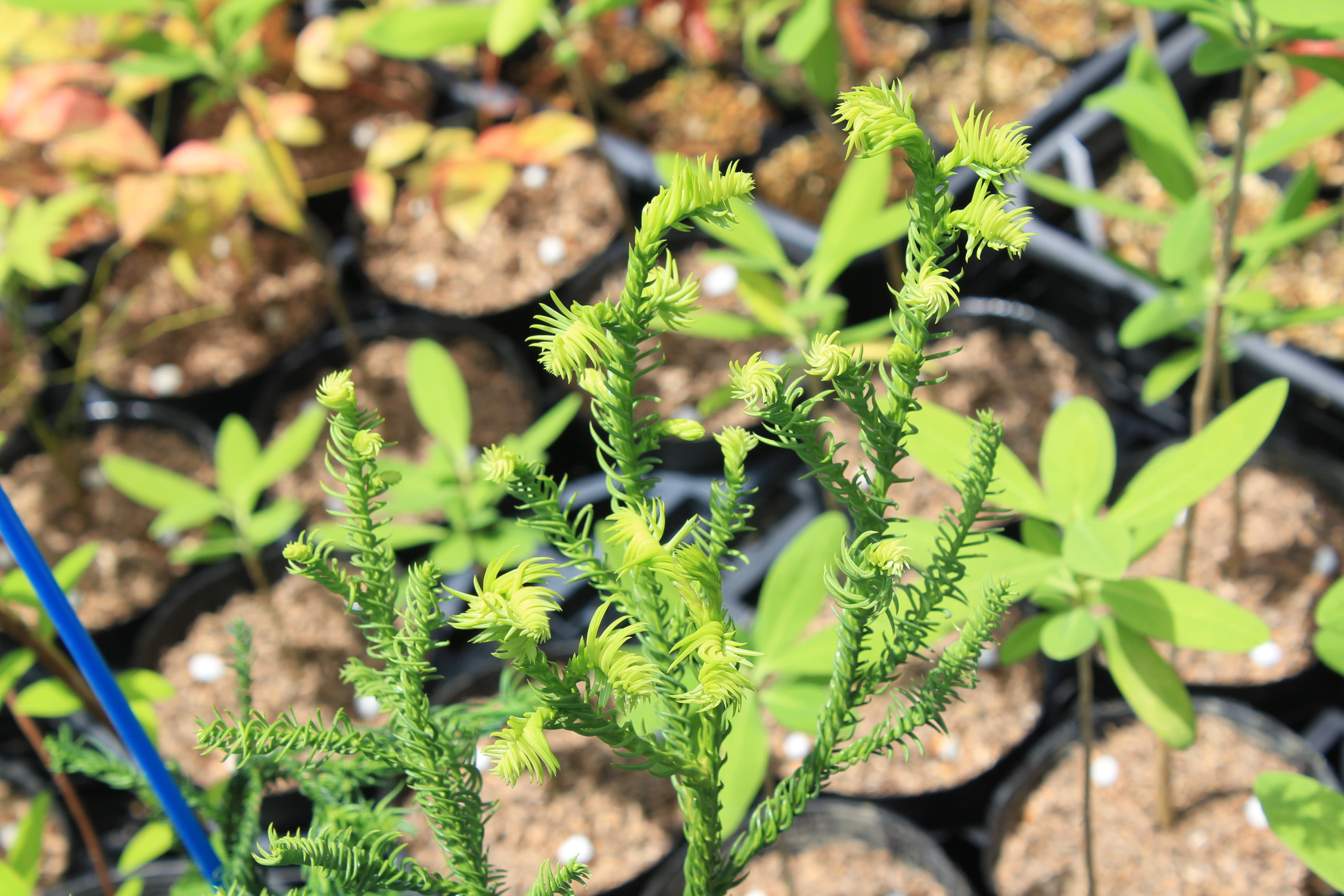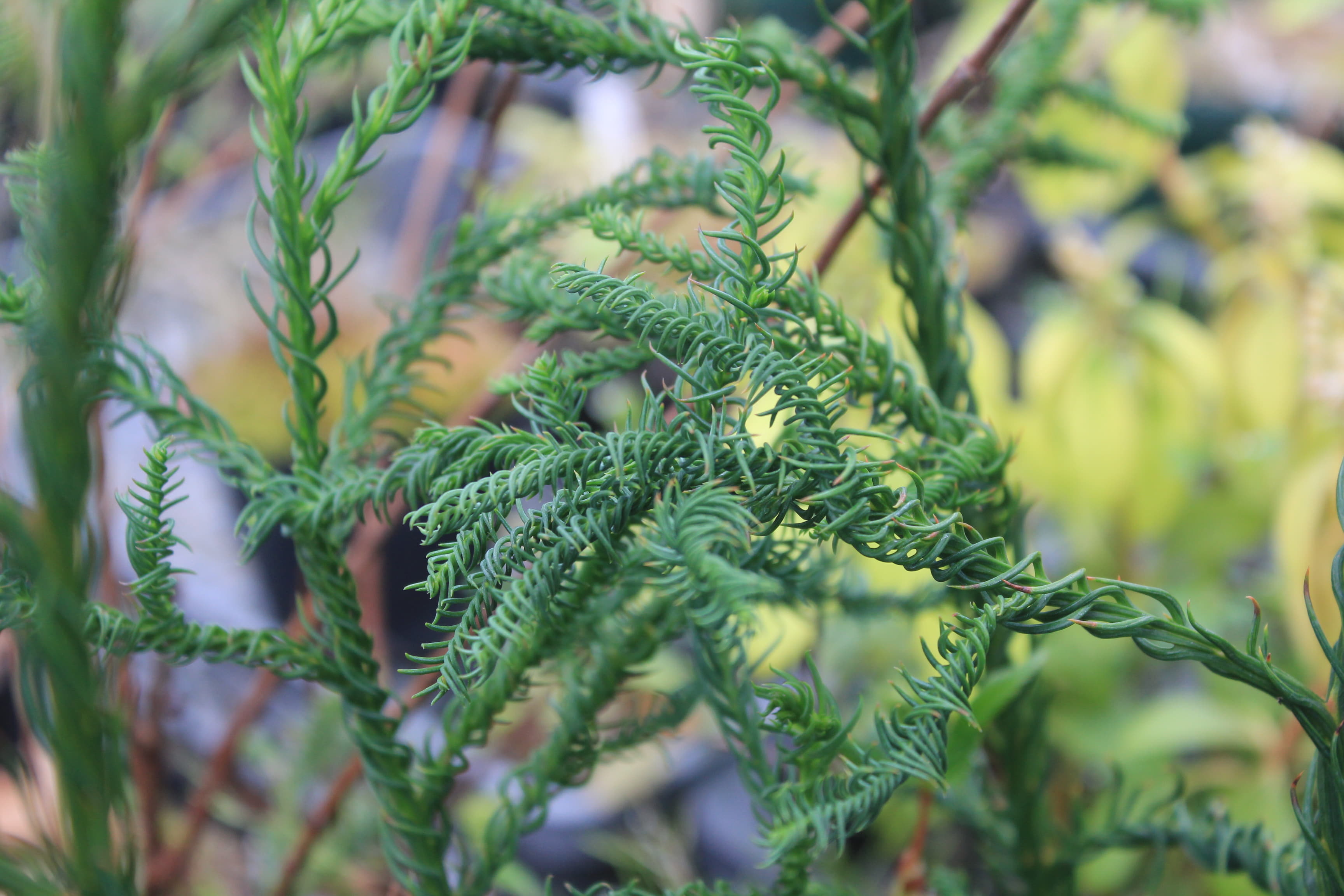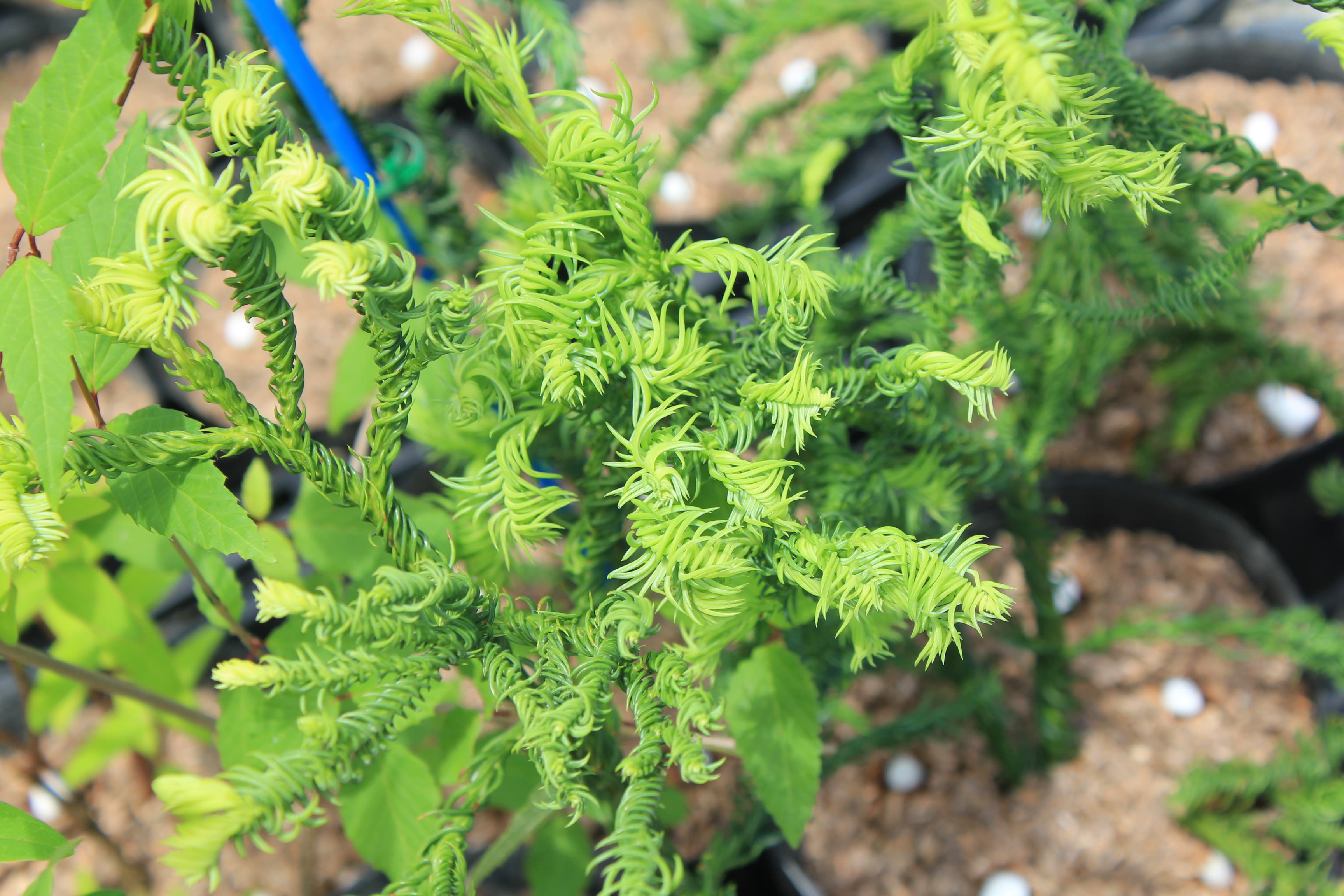 概要:本種はスギの園芸品種で、葉が内曲して、右方向へねじれ、枝にらせん状に巻きついて、よじれたヒモの様にも見える面白い杉である。栽培は容易で、露地植えすると高さは3~4m程になる。スギは、古くから日本における重要な林業樹種で、最も多く植林されている。また、スギ科は、日本特産のスギ、コウヤマキ、そして、北米のセコイアなども含んでいる。スギは、人間と関わりの深い重要植物といえるが、近年は、’花粉アレルギー’という問題が浮上してきた。