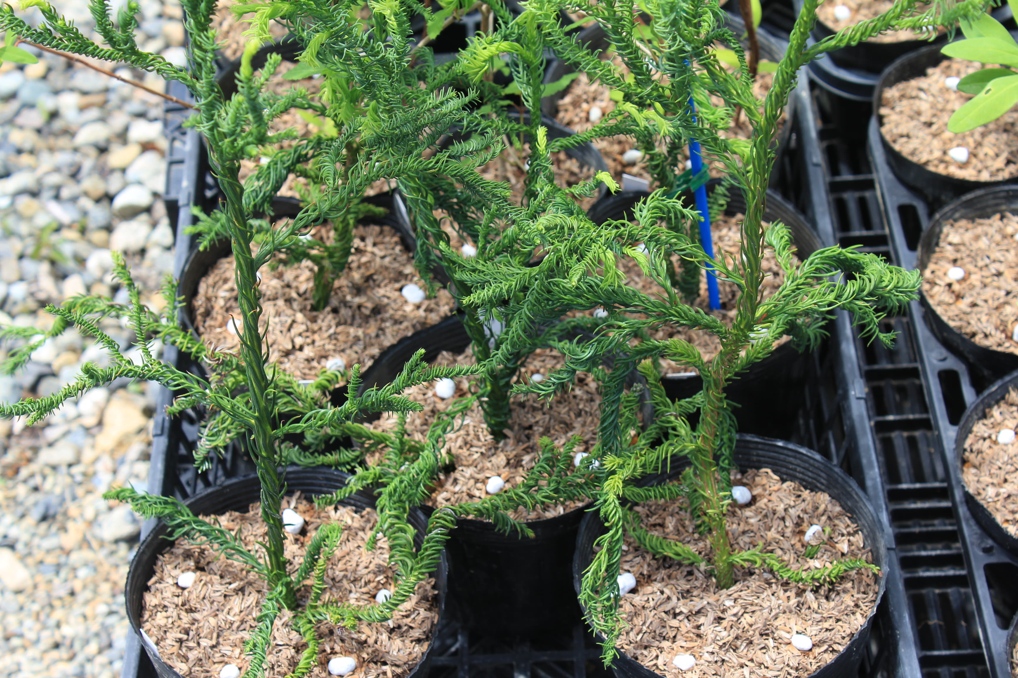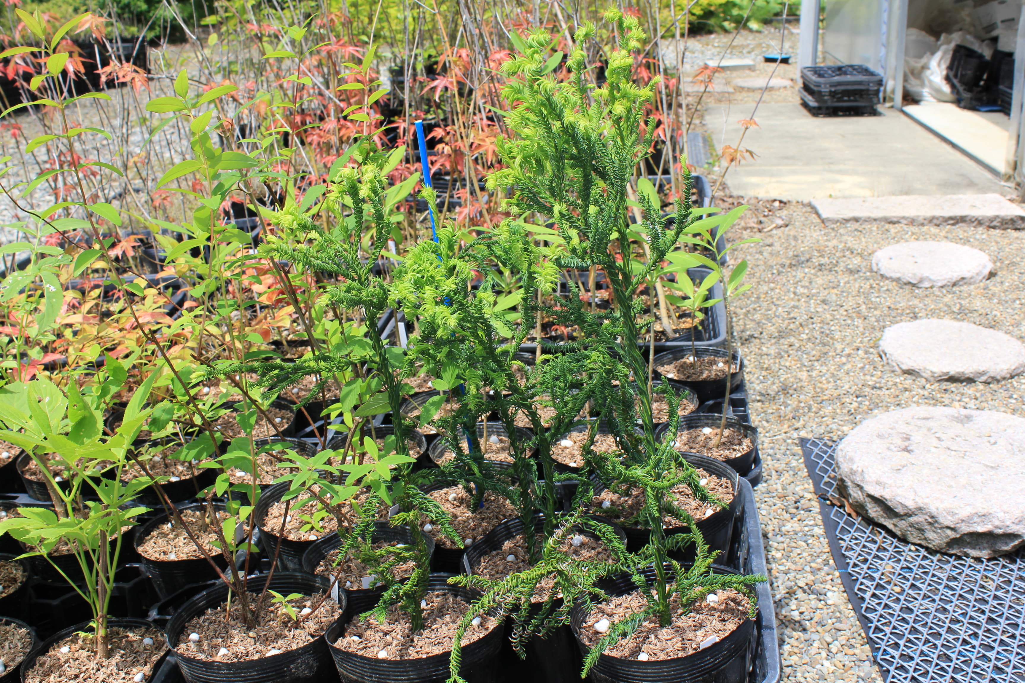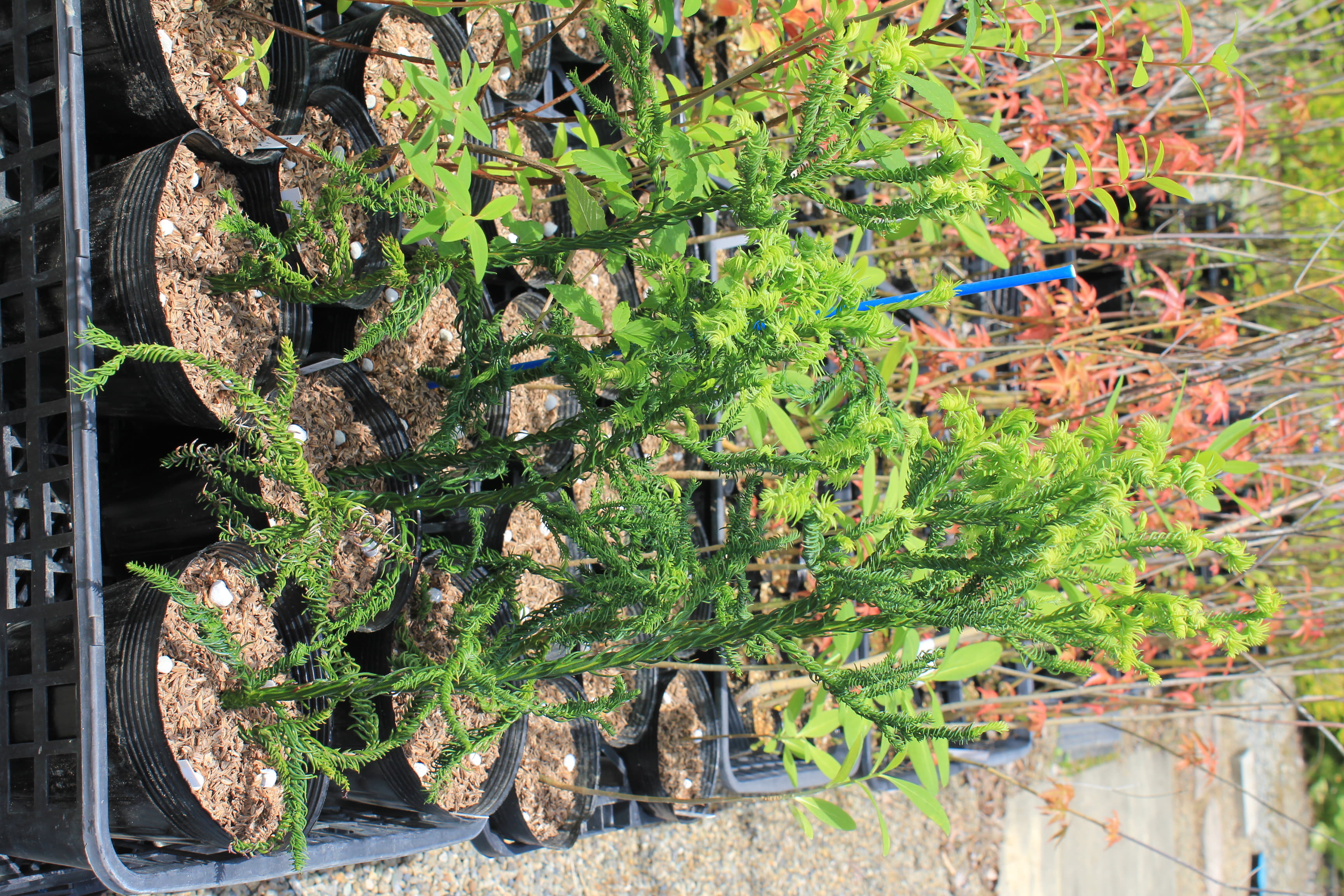 概要:本種はスギの園芸品種で、葉が内曲して、右方向へねじれ、枝にらせん状に巻きついて、よじれたヒモの様にも見える面白い杉である。栽培は容易で、露地植えすると高さは3~4m程になる。スギは、古くから日本における重要な林業樹種で、最も多く植林されている。また、スギ科は、日本特産のスギ、コウヤマキ、そして、北米のセコイアなども含んでいる。スギは、人間と関わりの深い重要植物といえるが、近年は、’花粉アレルギー’という問題が浮上してきた。