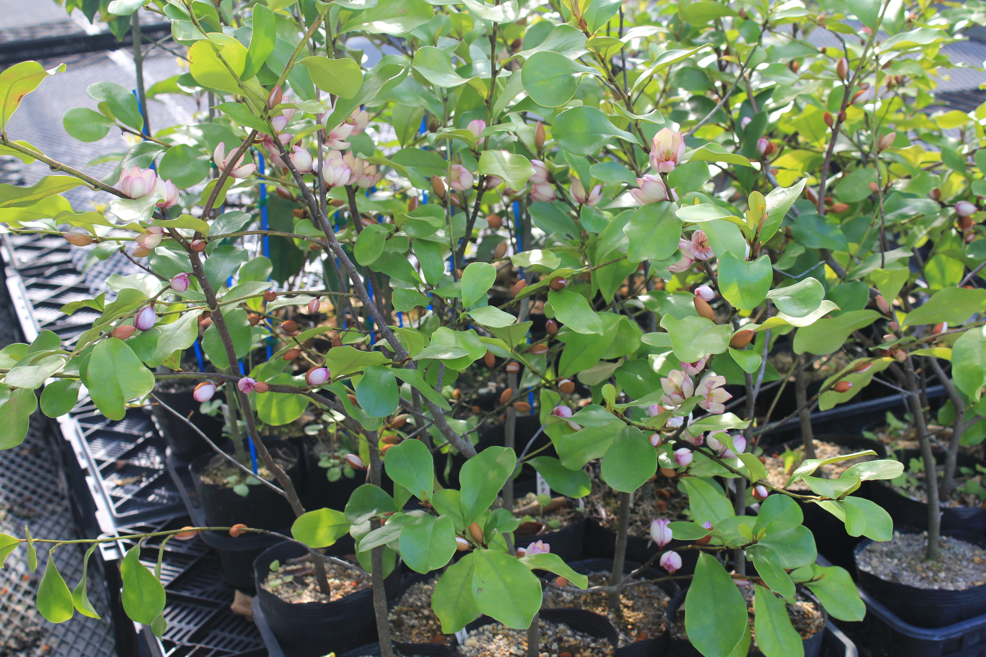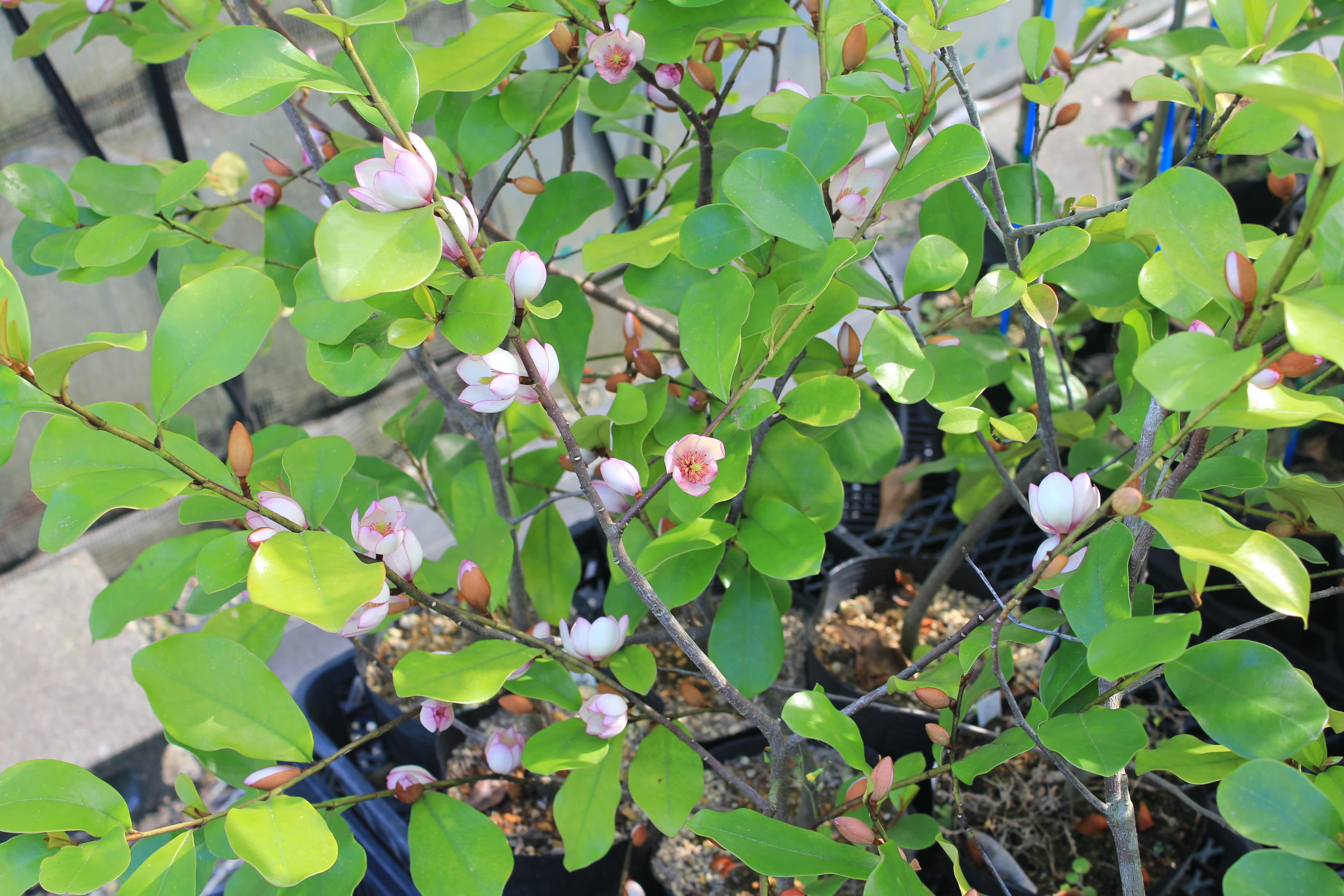 概要:トウオガタマと雲南オガタマの交配種で、平野重一氏(横浜市)が作出した常緑低木。5~6月頃、直径4~5cmほどの芳香花を開く。やさしげな紫紅色の花は大変美しい。やや寒さに弱いので、降雪地では、鉢植えで育てるほうがよい。