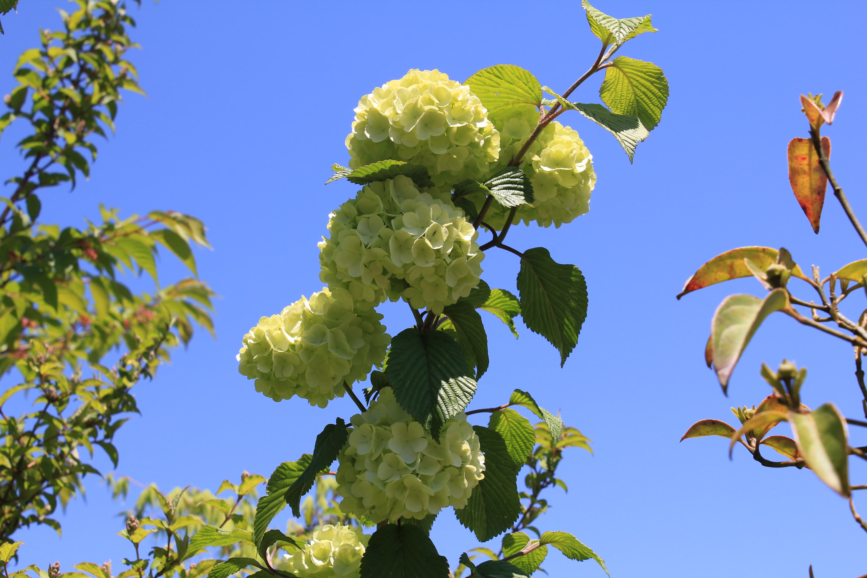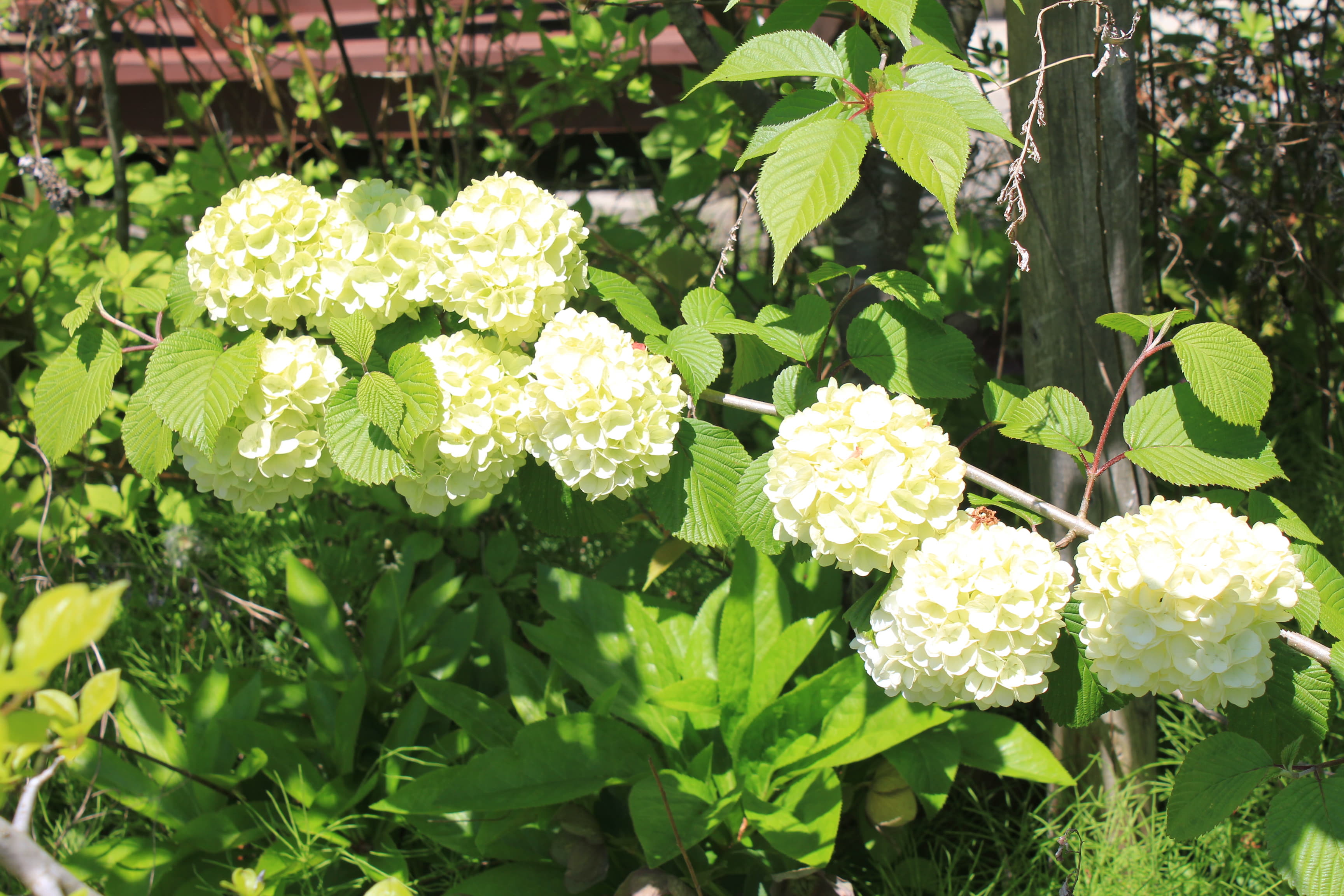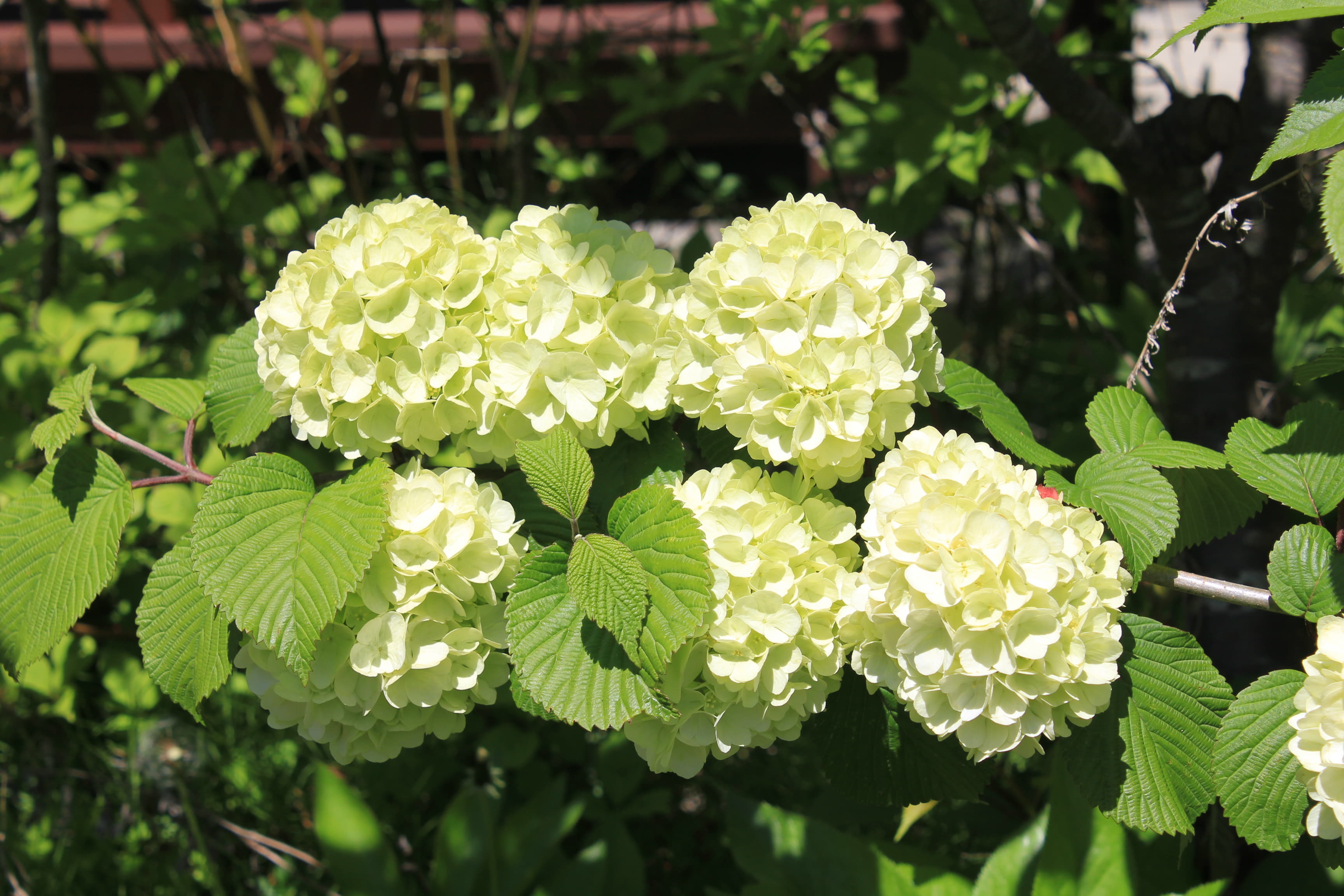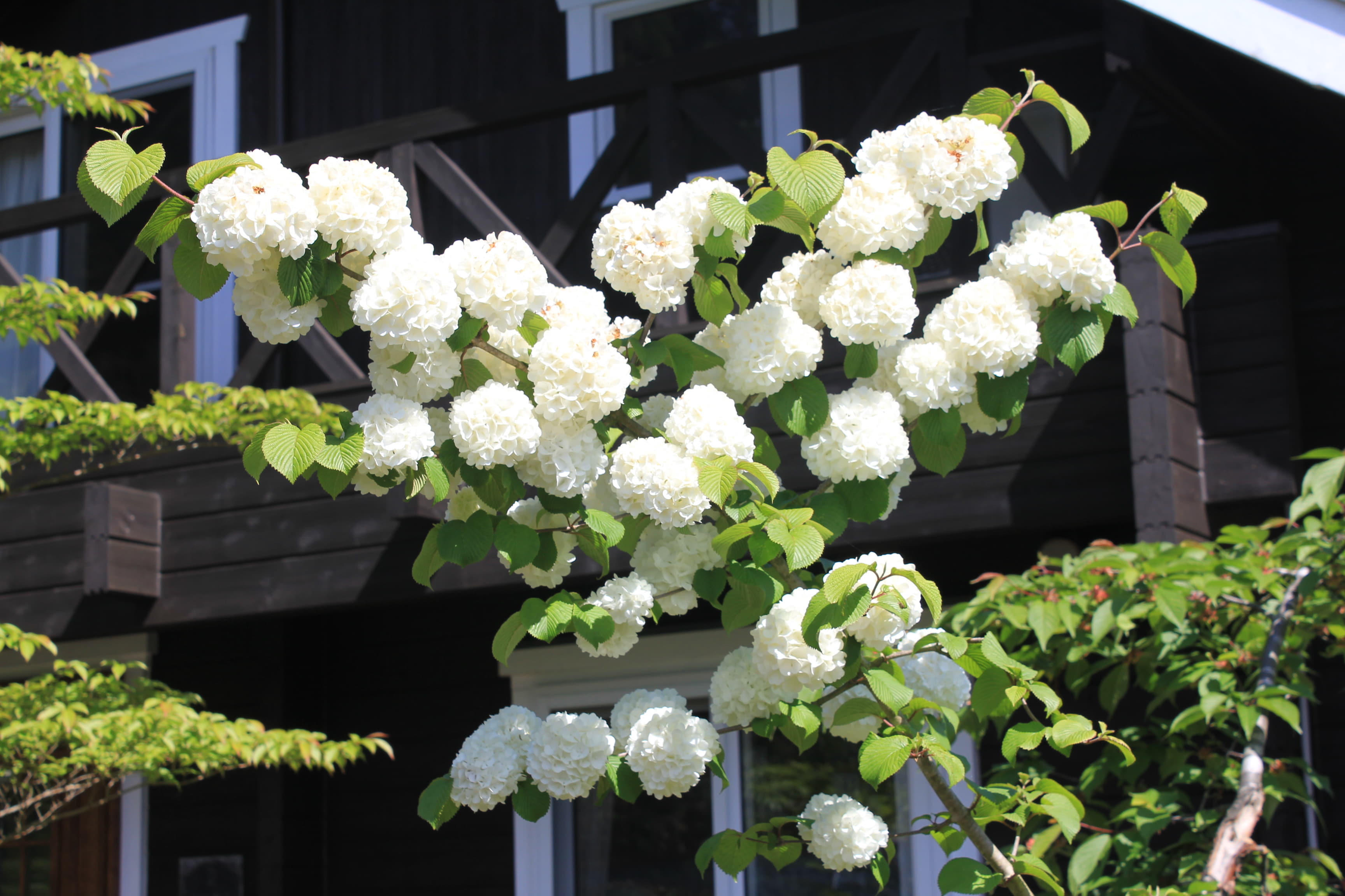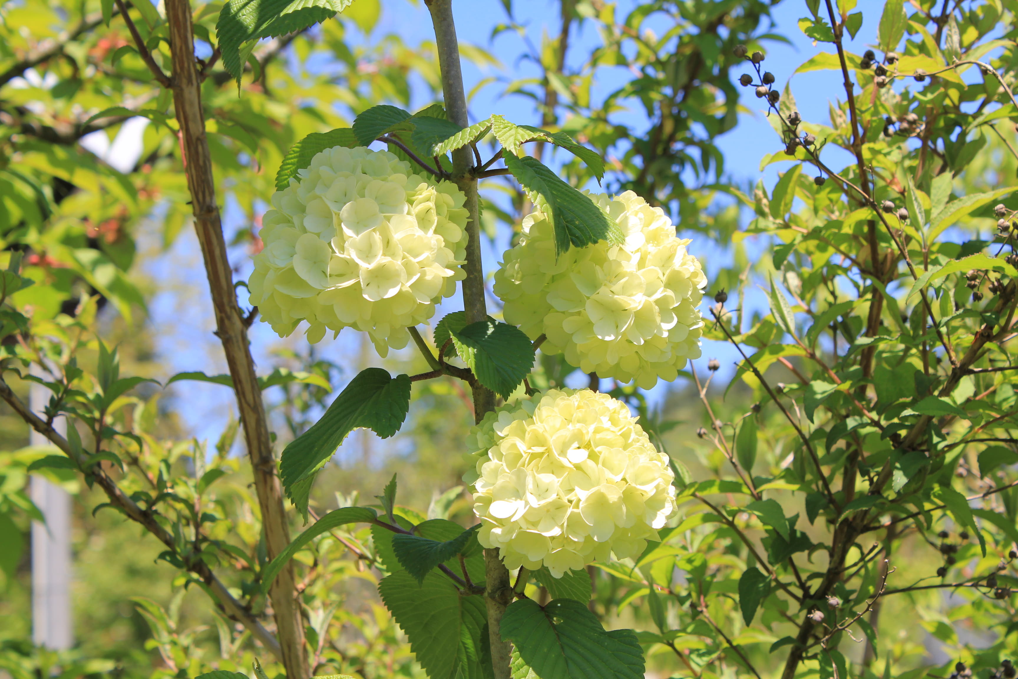 概要:4~5月に、白い手まりのような花序をつける。花序の大きさは、直径12cmくらい。花と思えるものは、すべて花冠が大きくなった装飾花である。鉢植え、庭植えに好適。