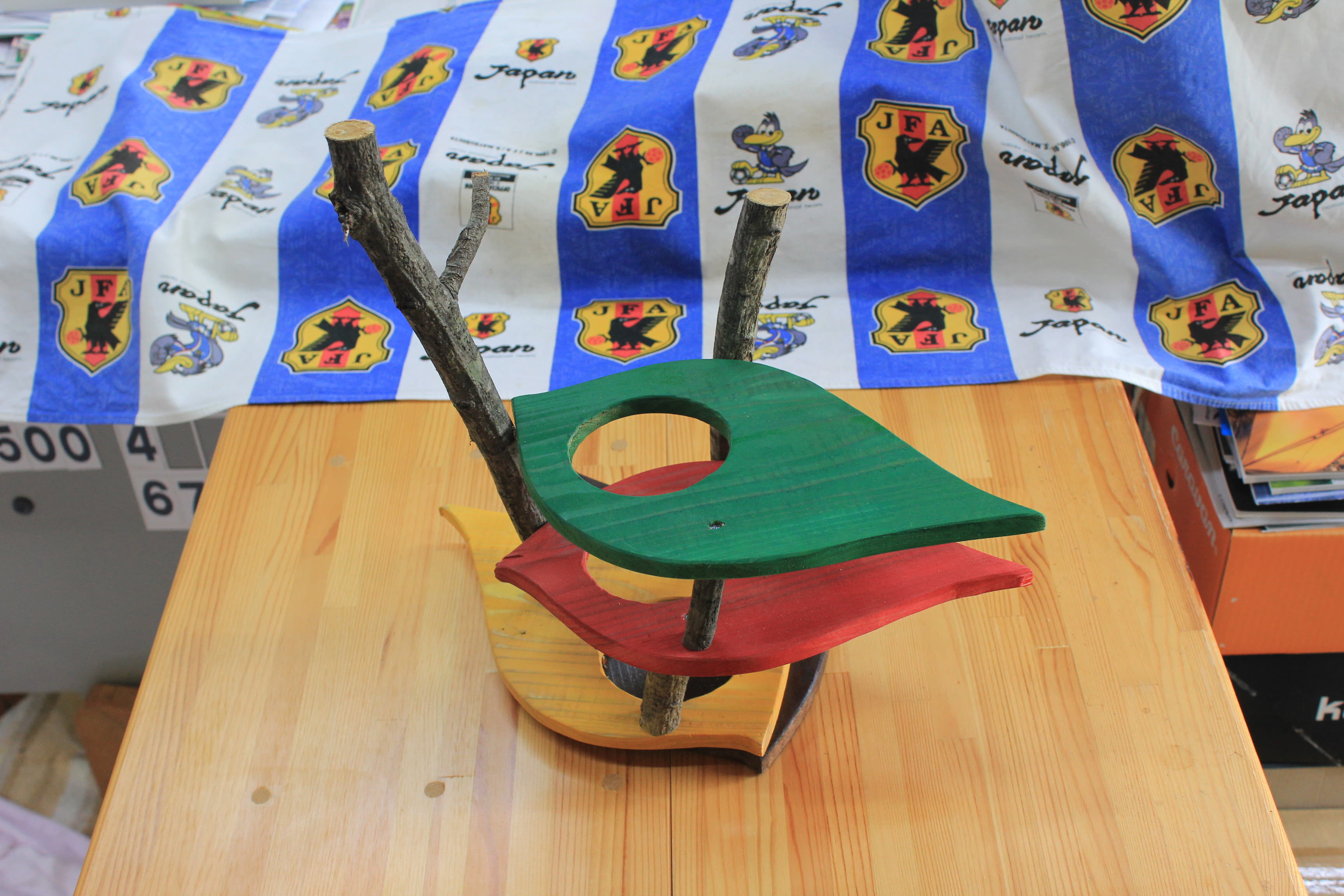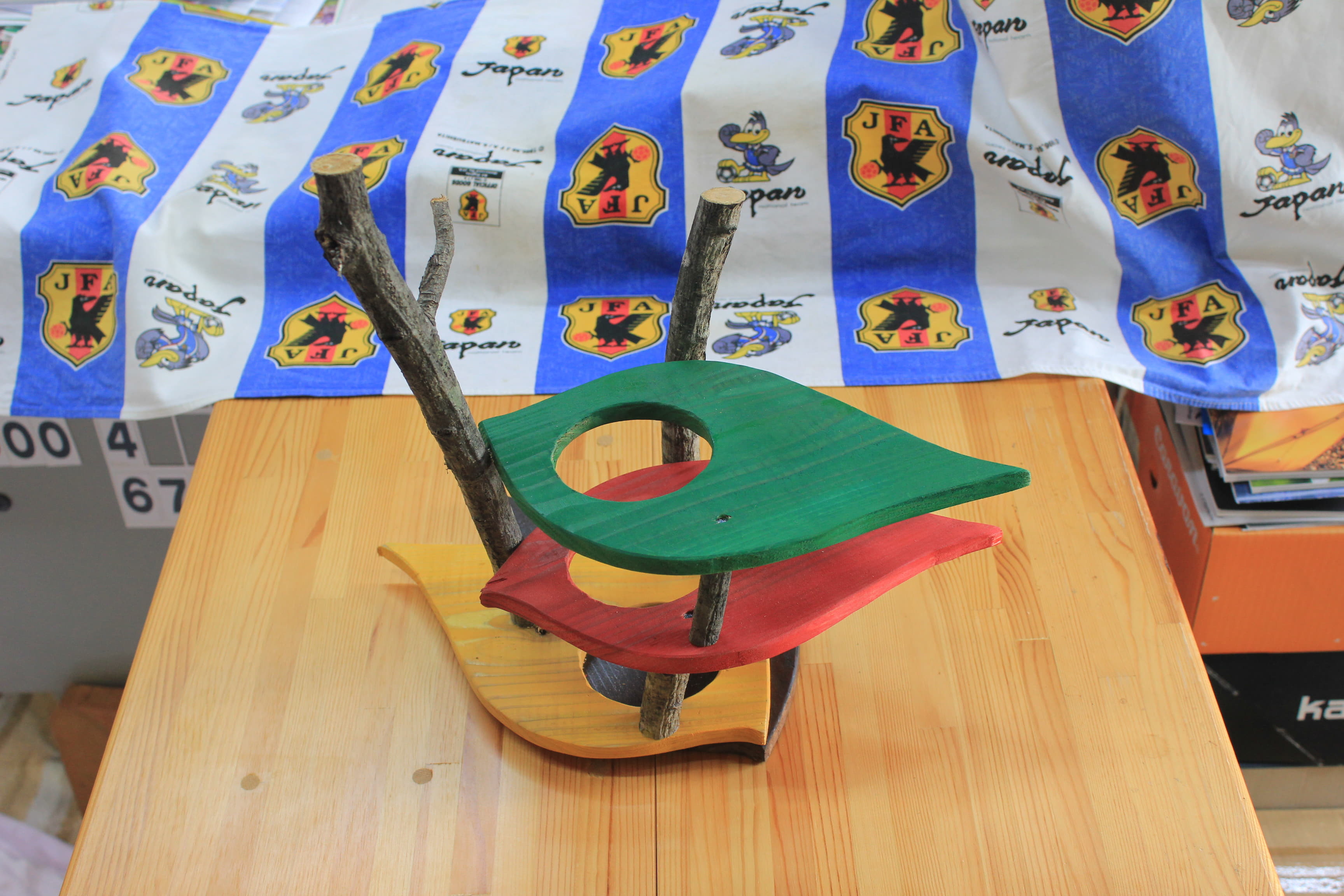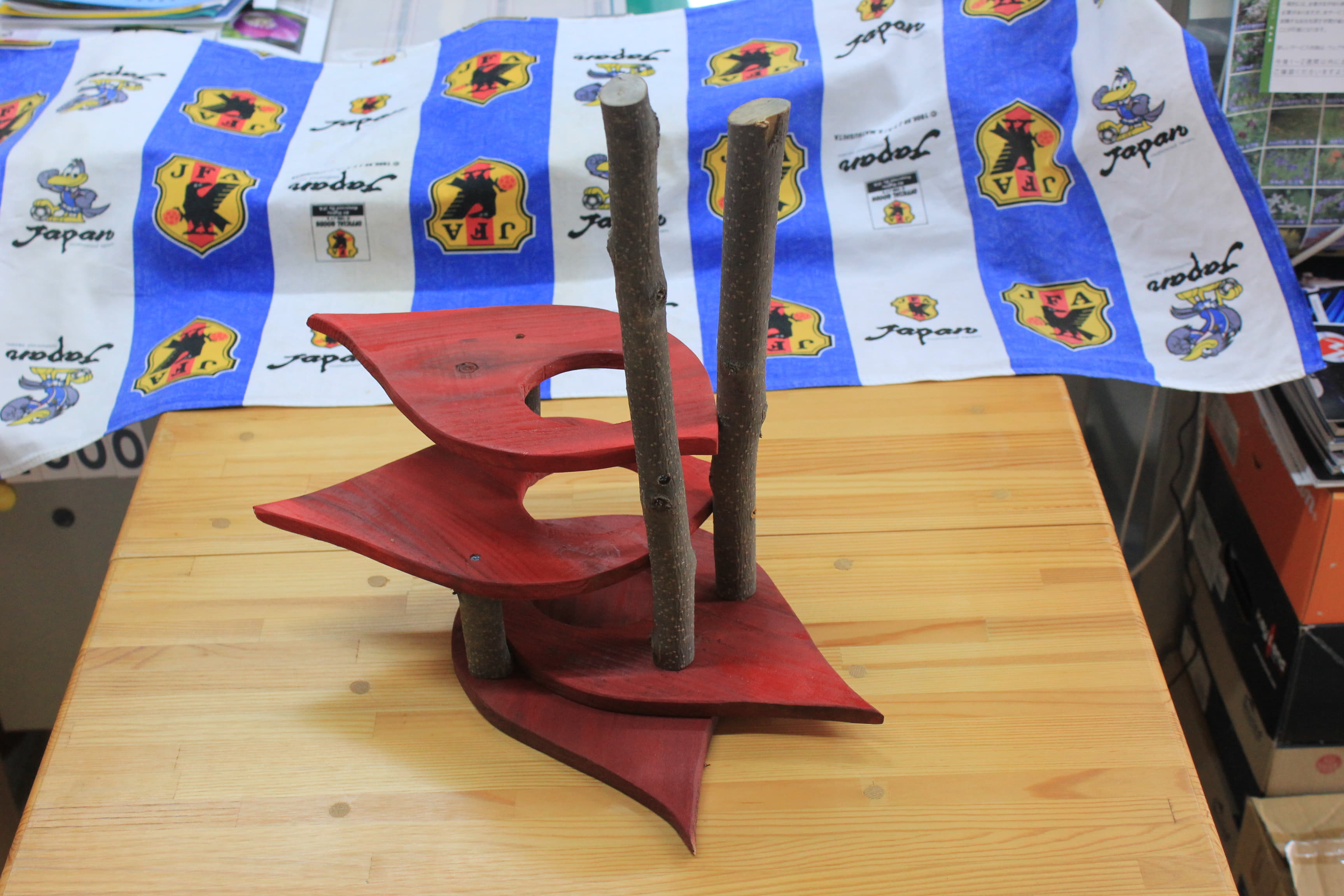 型抜きした3枚の杉あるいは松材を使用しています。丸穴の直径は7cmです。枝材は、柿などの落葉樹枝を乾燥させて、使用しています。