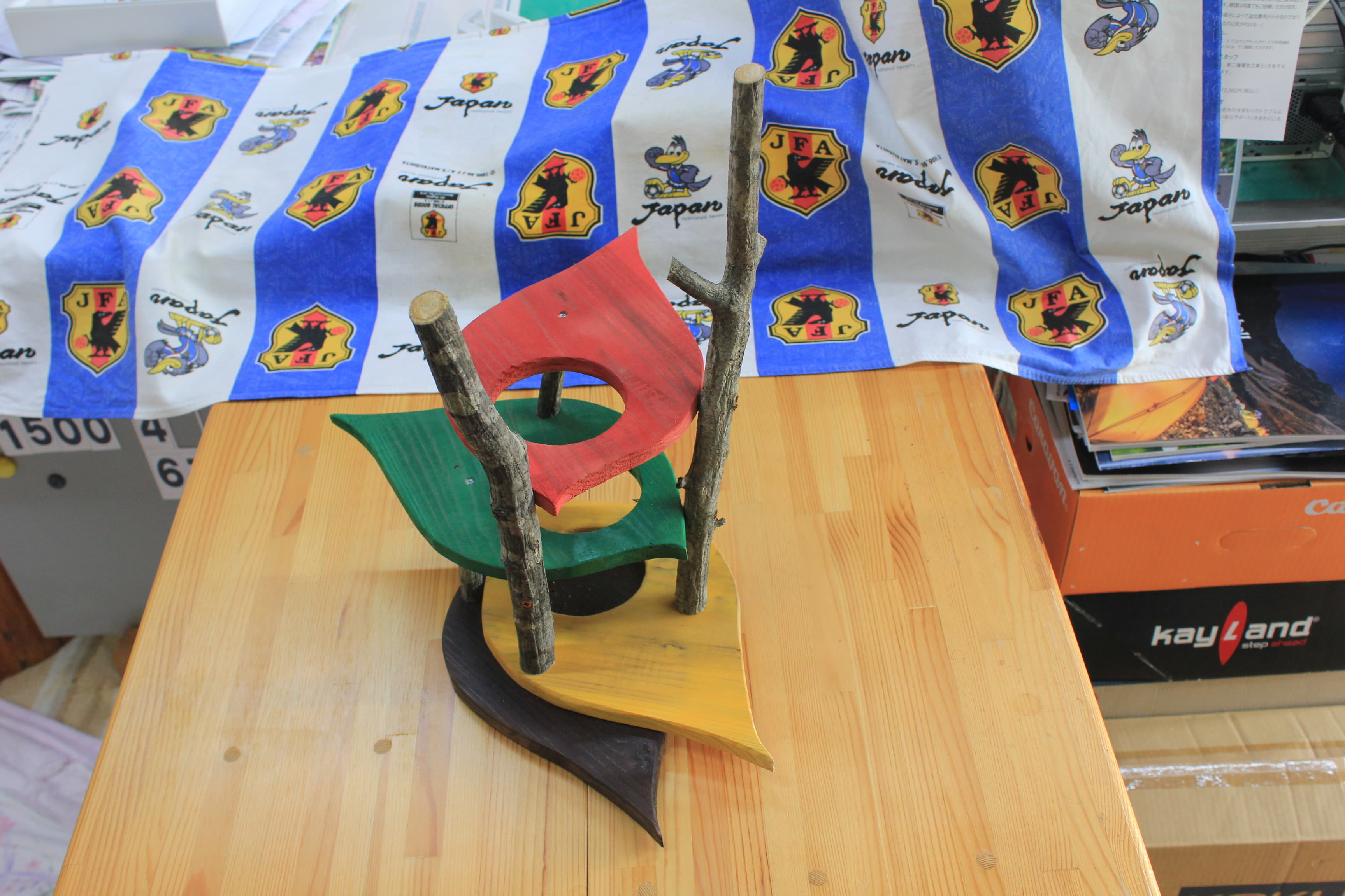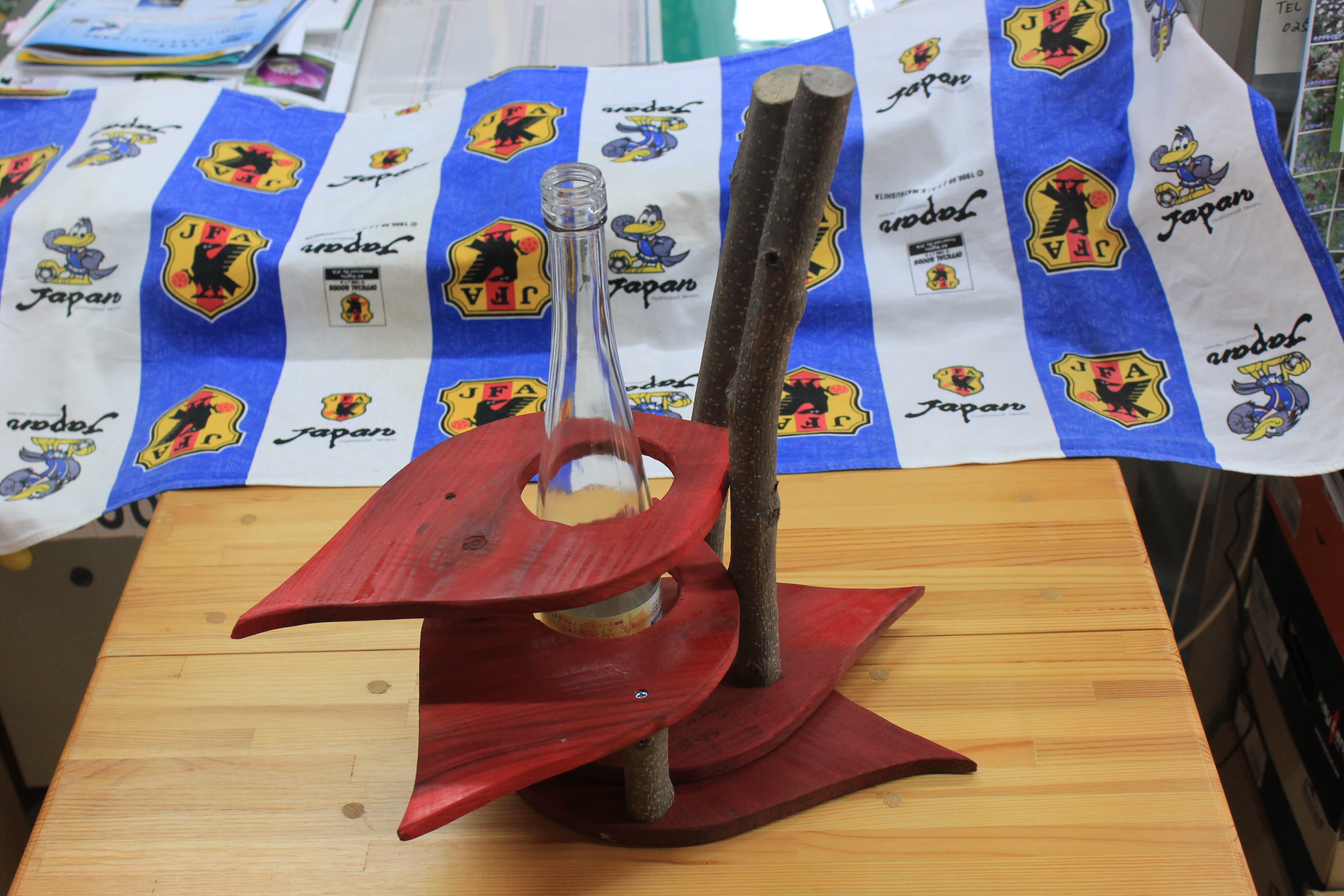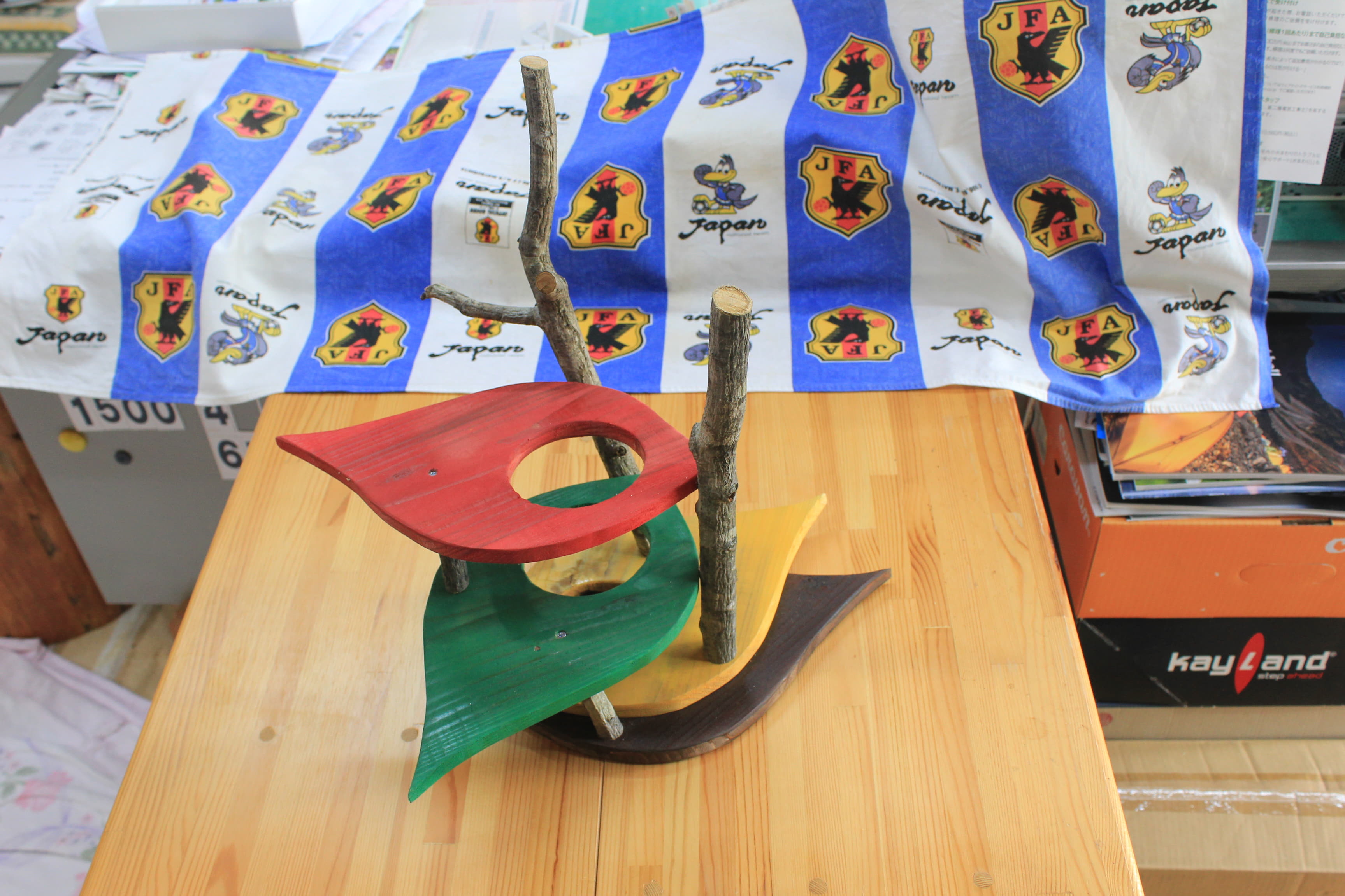 型抜きした3枚の杉あるいは松材を使用しています。丸穴の直径は7cmです。枝材は、柿などの落葉樹枝を乾燥させて、使用しています。