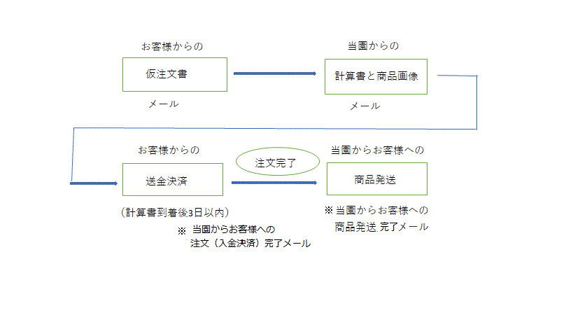 ③計算書と添付画像をご確認の上、内容に誤りがなく、商品および金額に御納得された場合には、計算書の到着後、当園営業日(土曜日、日曜日、祝日を除く)3日以内に、 ゆうちょ銀行の所定口座に御請求金額をお振り込み下さい。この時点で、注文完了となります。